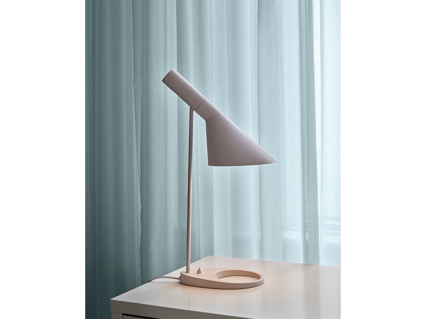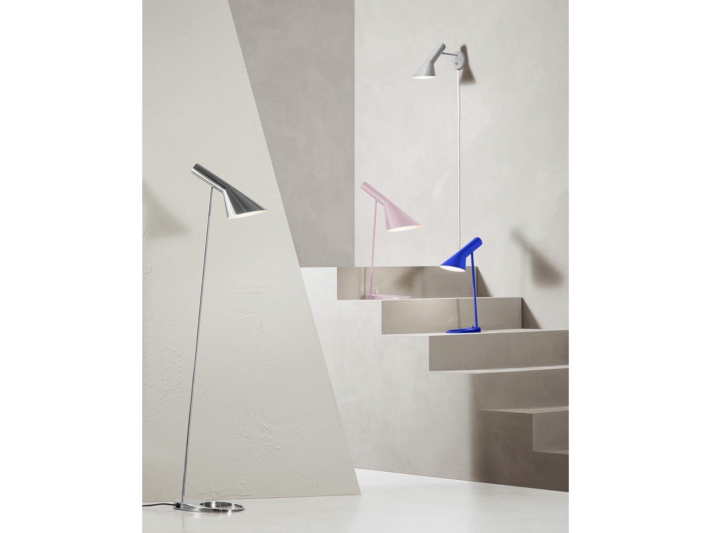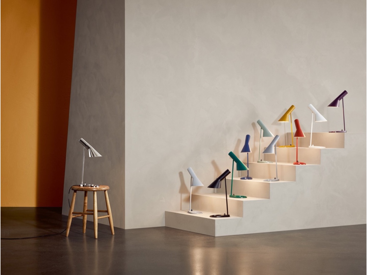 Arne Jacobsen zaprojektował lampę AJ dla SAS Royal Hotel w Kopenhadze (kolekcja Radisson) w 1957 roku. Dziś rodzina AJ jest uważana za projekt, z którego duński architekt jest najbardziej znany na całym świecie. Rodzina AJ obejmowała wówczas lampę stołową i podłogową, a także kinkiet, lampkę stołową, która została zaprojektowana do zamocowania na stole.