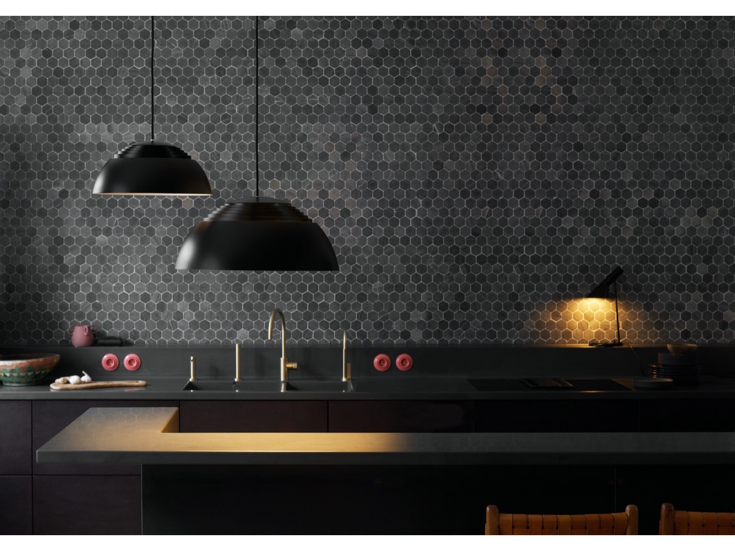 Kinkiet można było znaleźć w pięknych rzędach ze stali nierdzewnej w holu, kiedy hotel został otwarty w 1960 roku.Arne Jacobsen nie tylko zaprojektował hotel w najdrobniejszych szczegółach dla SAS (Scandinavian Airlines), ale także zaprojektował prawie wszystkie oryginalne meble i przedmioty użytkowe. Profil lampy AJ z jego prostymi liniami i kombinacją kątów ukośnych i prostych jest postrzegany nie tylko jako formalna równoległość do profilu siedzeń z serii 3300, ale także do geometrycznych profili jego budynków. W kilku częściach hotelu zastosowano lampę AJ, wykonaną z miedzi i stali nierdzewnej. Co więcej, pierwotnie była dostępna w kolorze jasnoszarym, ciemnobrązowym i czarnym, podobnie jak AJ Pendant. Od tego czasu na przestrzeni lat wprowadzano nowe kolory, aby uczcić jubileusze serii.