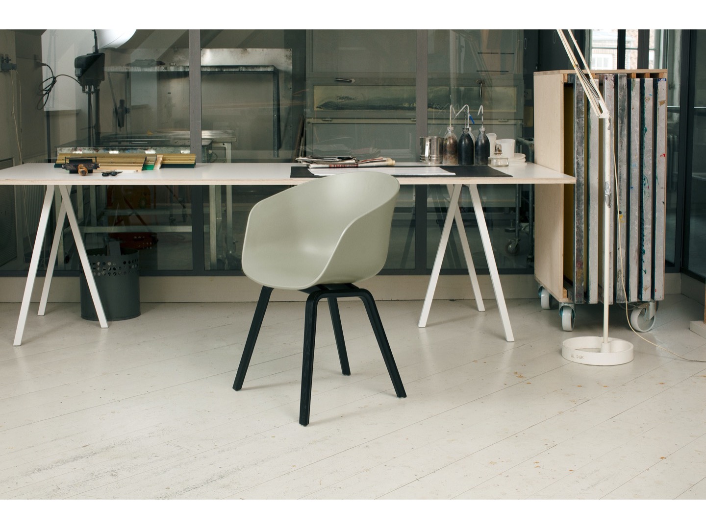 Formowana wtryskowo, jednokolorowa skorupa z polipropylenu. Wykonane w 100% z PP pochodzącego z recyklingu pokonsumenckiego. Grubość skorupy: 10 mm. Podstawa z formowanej sklejki. Wewnętrzna sklejka z drewna bukowego, wierzchnia okleina z dębu lub orzecha włoskiego. Nie można układać w stosy.