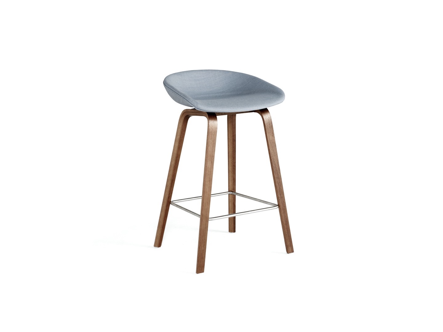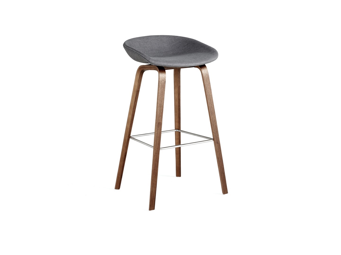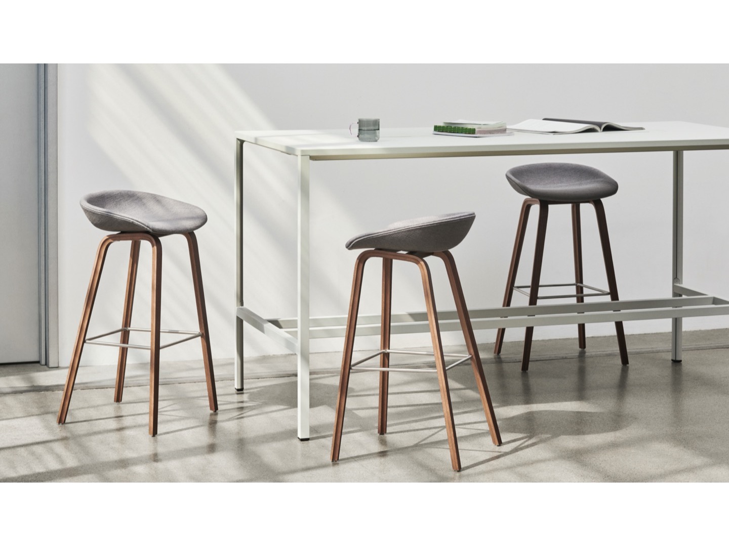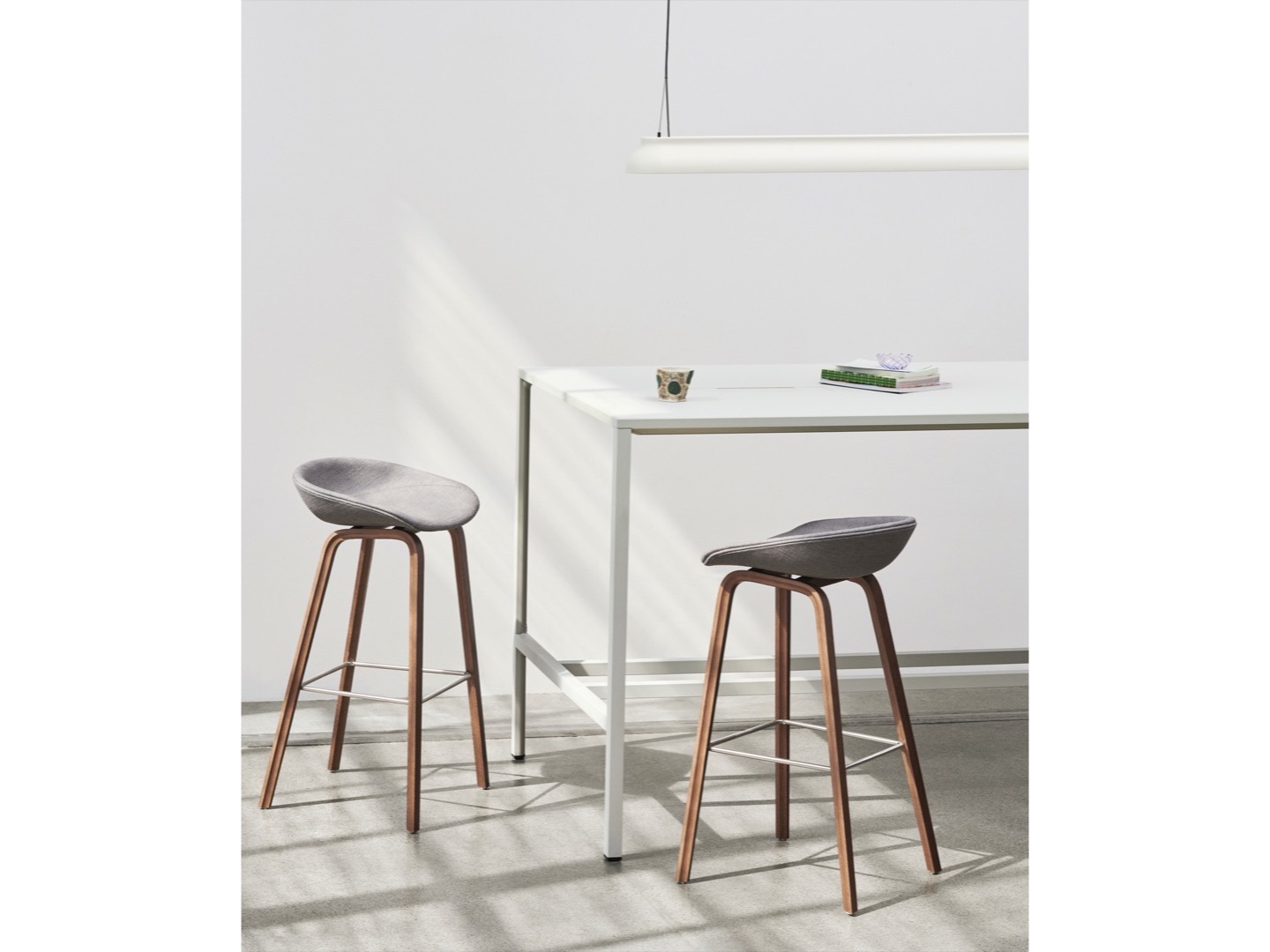 Stołek barowy About A Stool AAS33 ma taką samą zdolność transformacji, jak inne projekty z tej serii, od minimalistycznego plastikowego siedziska po wersję tapicerowaną. Dzięki zakrzywionemu oparciu i długim, eleganckim drewnianym nogom ma prostą, ale mocną wizualną prezencję. Dostępne w dwóch wysokościach oraz w wielu wykończeniach drewna, kolorach i opcjach tapicerki.