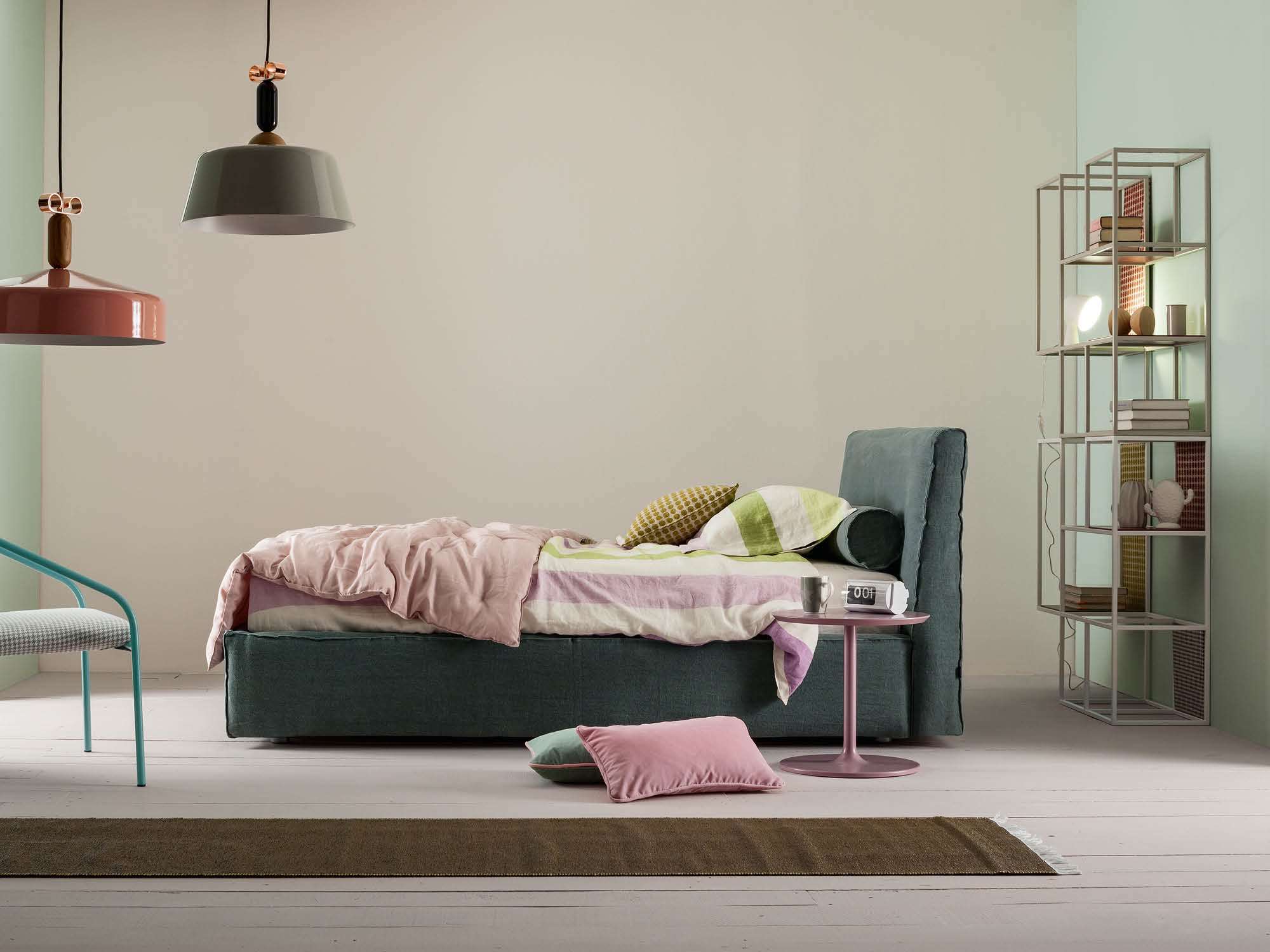 Łóżko można dopasować do wystroju pomieszczenia dobierając zarówno kolorystykę tapicerki, jak również skorzystać z szerokiej gamy wybarwień podstawy łóżka. Opcjonalnie łóżko może być wyposażone w pojemnik na pościel.