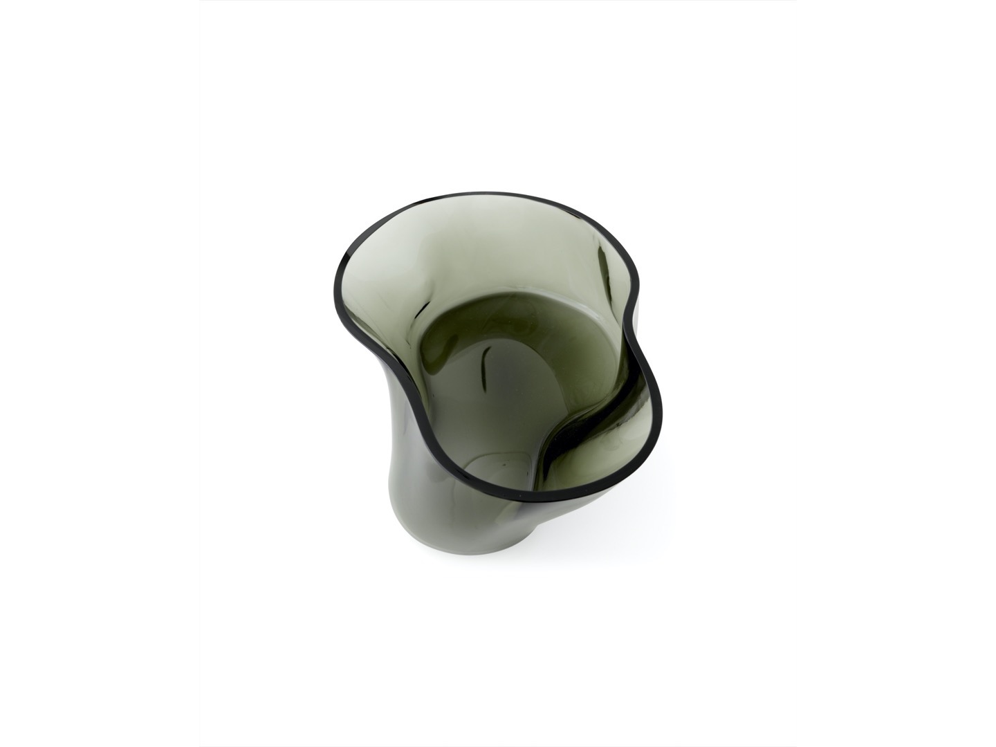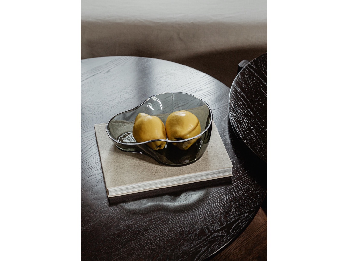 Aer Bowl z dymionego szkła ma rzeźbiarski wygląd, niezależnie od tego, czy jest wypełniona smakołykami, czy umieszczona na stole jako element dekoracyjny. Czerpiąc inspirację ze spiralnego ruchu powietrza widzianego przez dym lub mgłę, naczynie ma asymetryczny kształt, delikatnie zwęża się w jedną stronę i ma pomarszczoną fakturę. Umieszczony blisko naturalnego światła – na parapecie okna lub blacie stołu – nabiera eterycznego charakteru, a odbicia i załamania światła ożywiają projekt i powierzchnię, na której stoi. Każda dmuchana misa ma inne cechy wizualne, które odzwierciedlają jej wyjątkowość.
