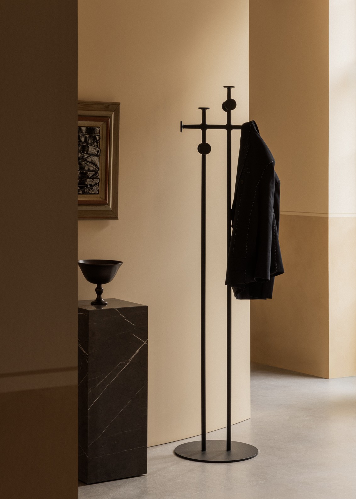 Wieszak Afteroom, inspirowany stylem Bauhausu i zasadami modernizmu, opiera się na podstawie ze stali malowanej proszkowo. Dwa słupki podtrzymują osiem haczyków, rozmieszczonych w przemyślanych odstępach, aby pomieścić płaszcze, szaliki, czapki lub wieszaki bez stłoczenia. Minimalistyczny w formie, a solidny w działaniu, uosabia etos kolekcji – przejrzystość i trwałość – oferując jednocześnie dyskretną, rzeźbiarską prezencję. Uniwersalny dodatek do każdego wnętrza, od przedpokoju po biuro.