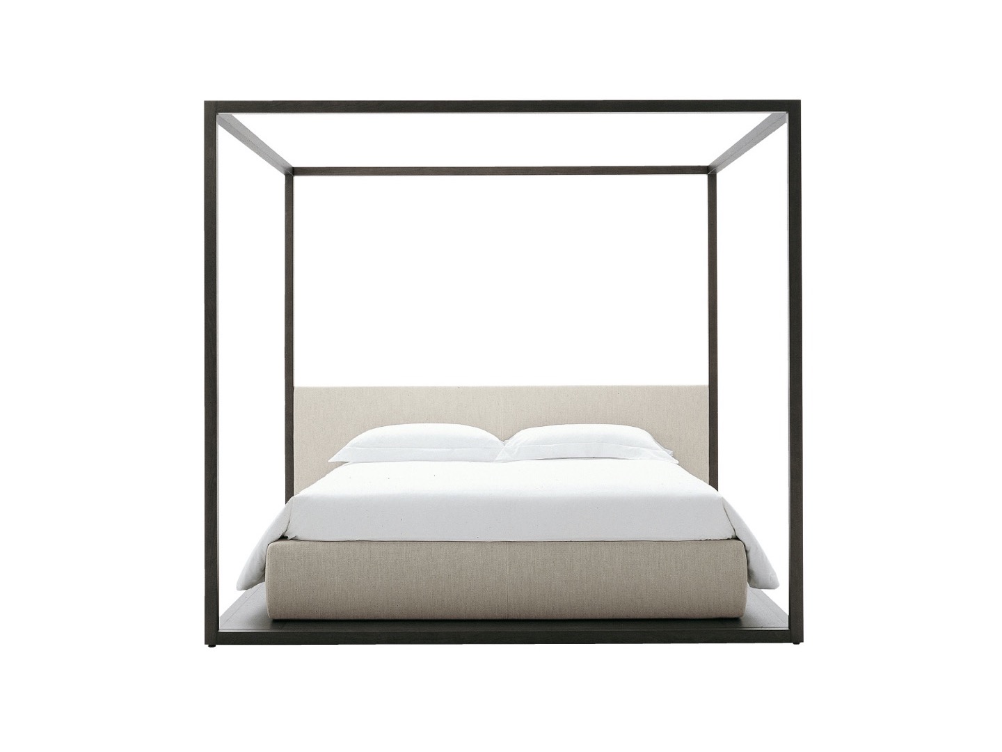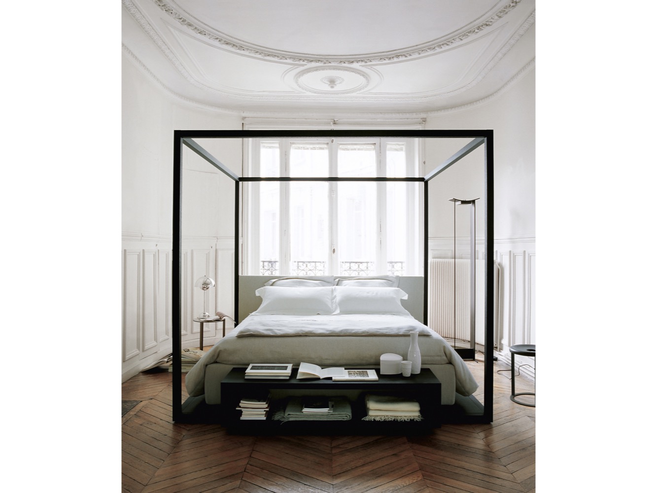 Klasyczne łóżko z baldachimem w nowoczesnej interpretacji, odpowiednie do ustawienia w środku pokoju; boki łóżka i zagłówek wykonane są ze skóry lub tkaniny. Łóżko spoczywa na platformie, która jest wystarczająco duża, aby umieścić element z otwartą komorą w nogach łóżka.