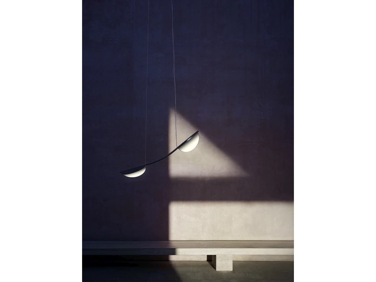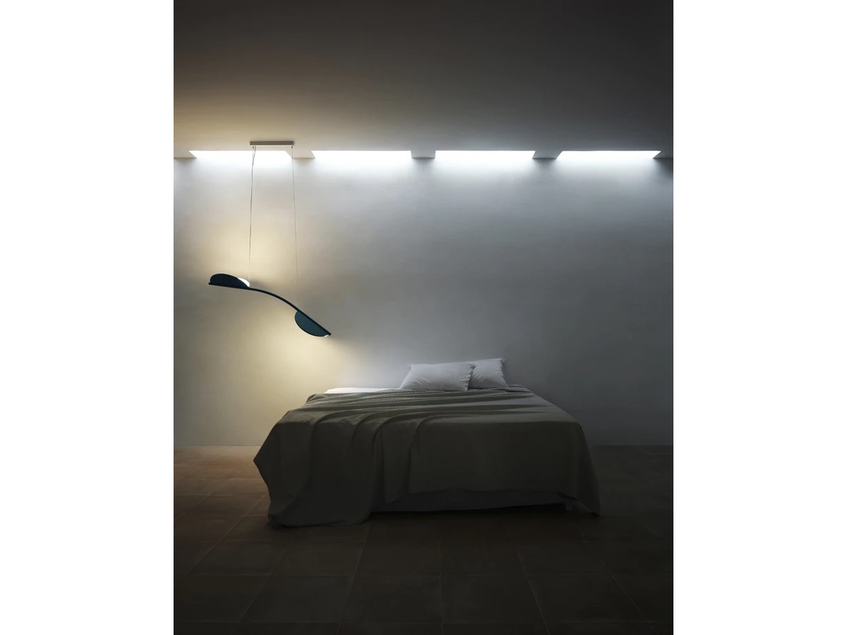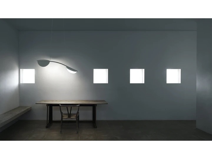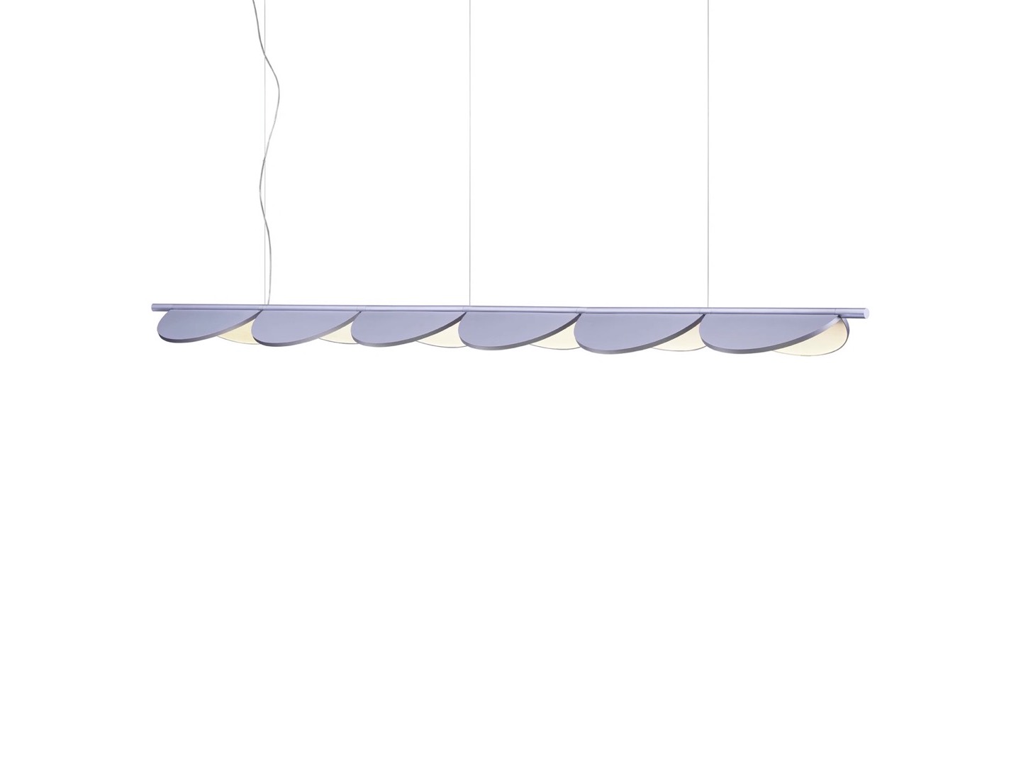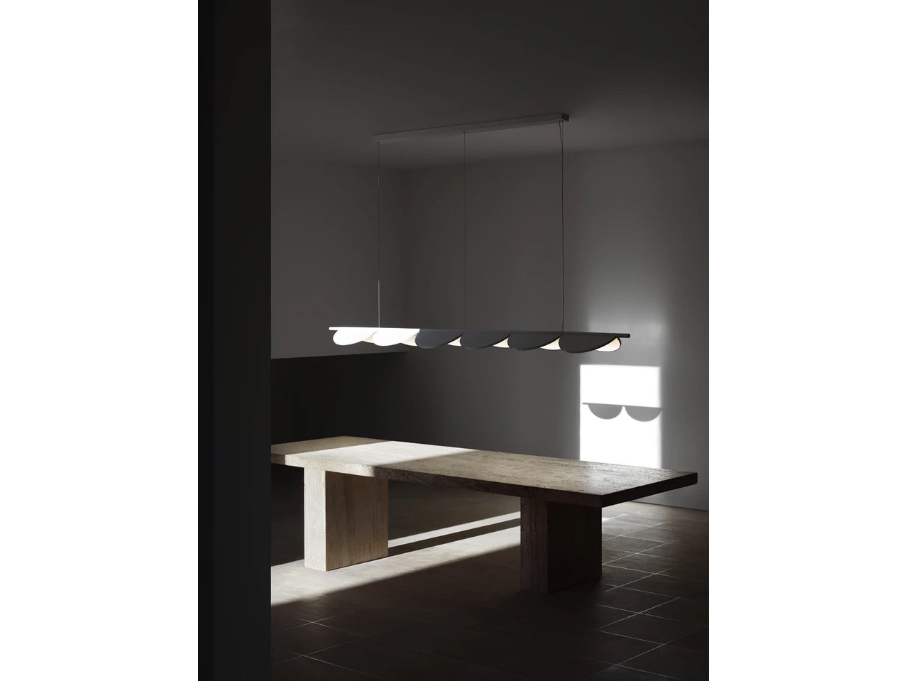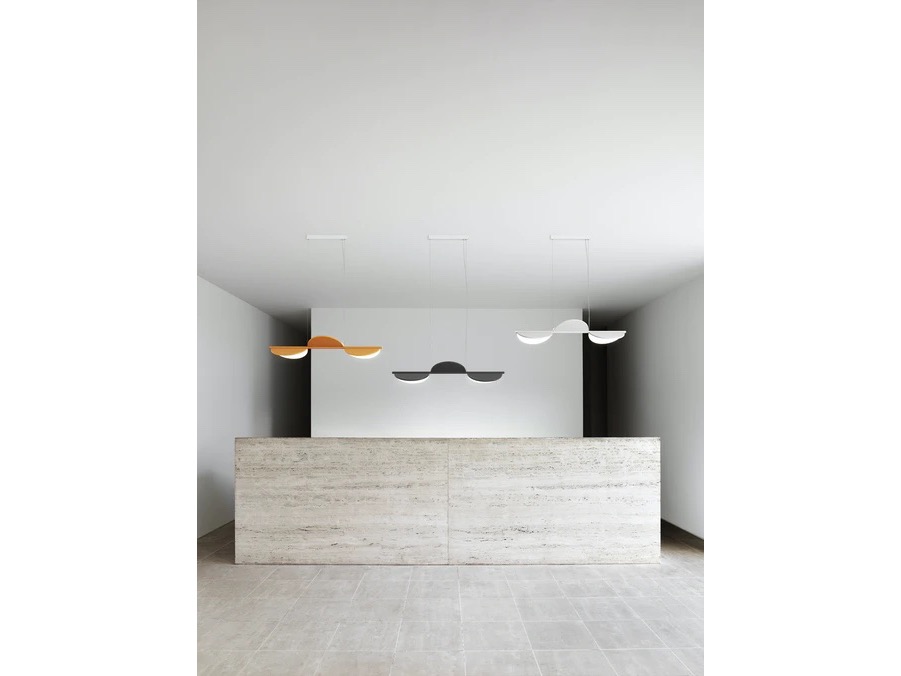 Lampa wisząca o rozproszonej emisji światła wykonana jest z aluminium i końcówek aluminiowych CNC z matowym lub metalizowanym wykończeniem. Wyposażona w zintegrowaną technologię Edge Lighting.