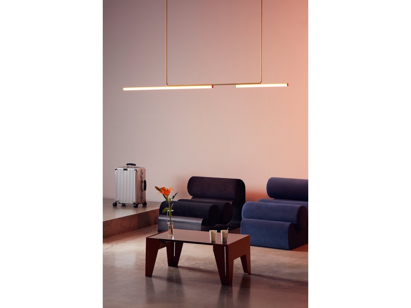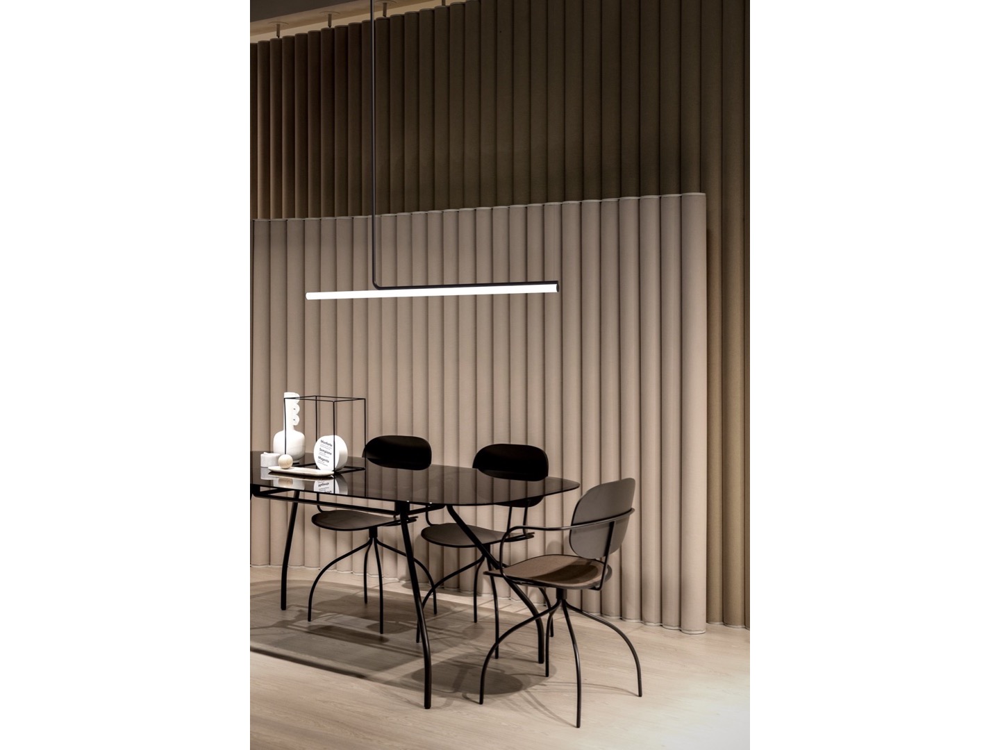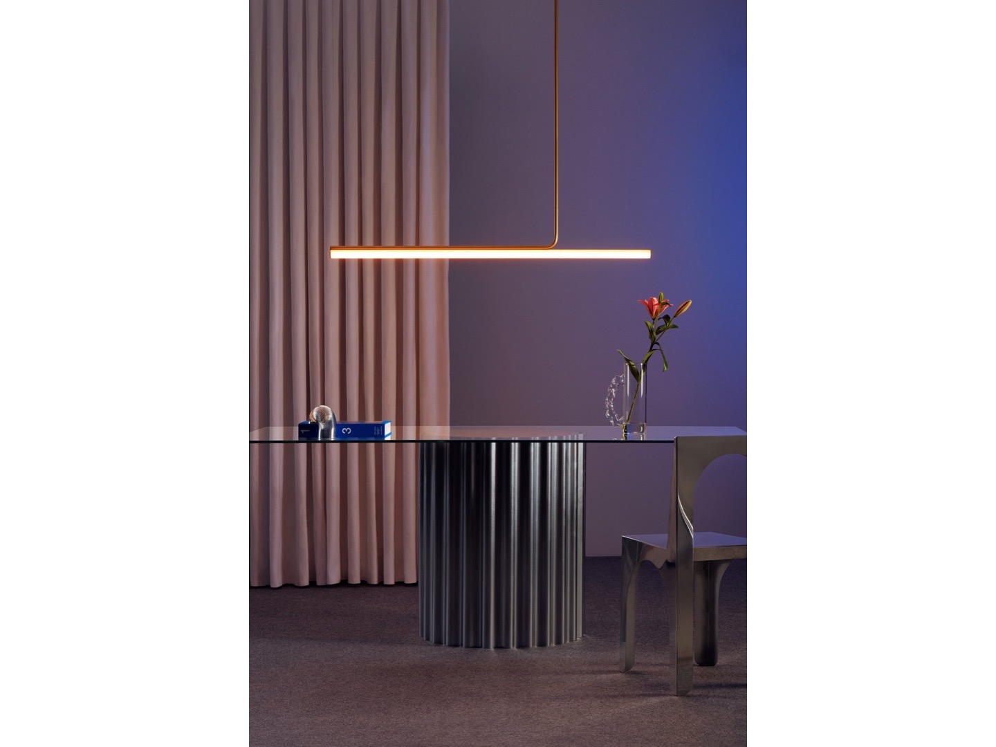 Jego projekt wywodzi się z rurowej konstrukcji z delikatnymi liniami, którą mocuje się do sufitu, pozwalając światłu opadać i delikatnie oświetlać przestrzeń.