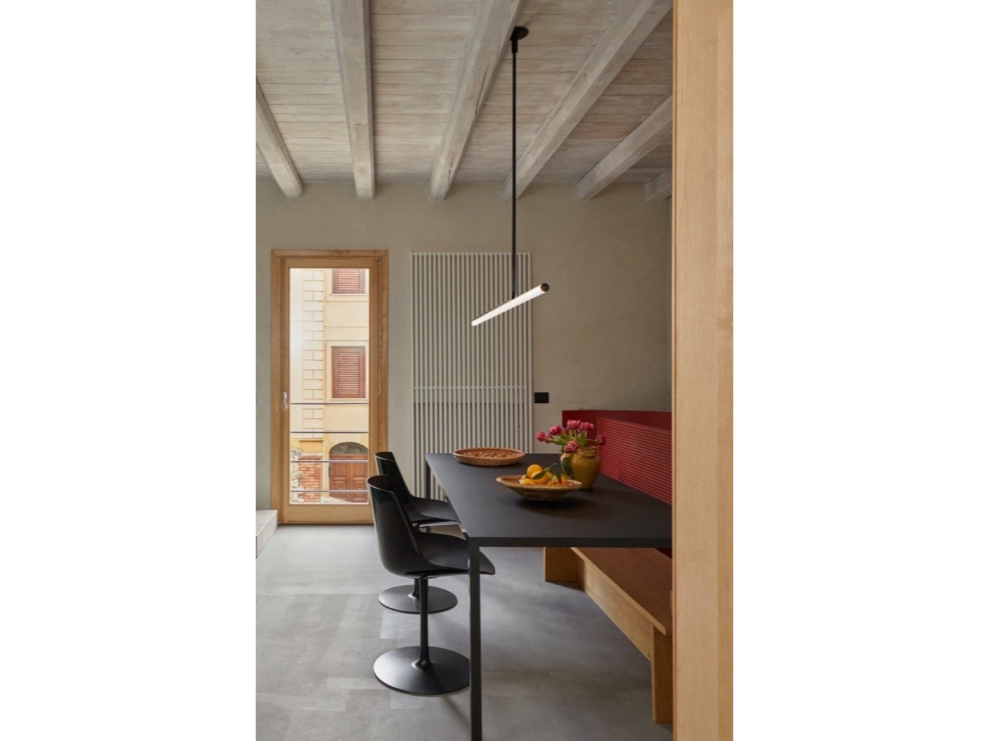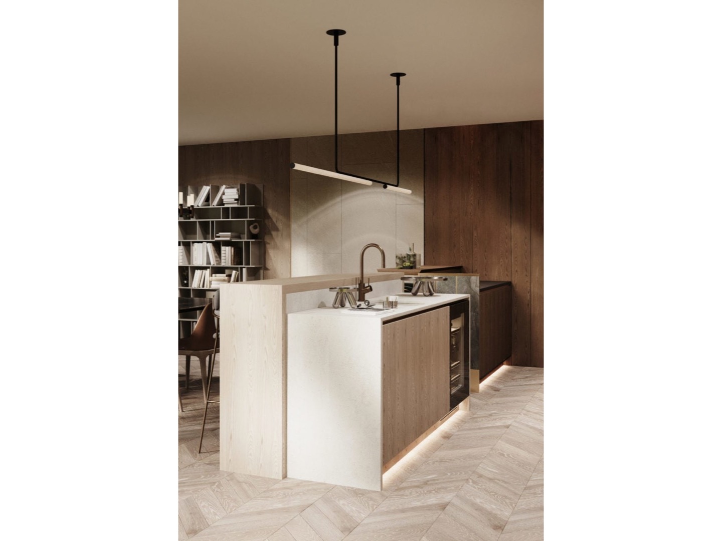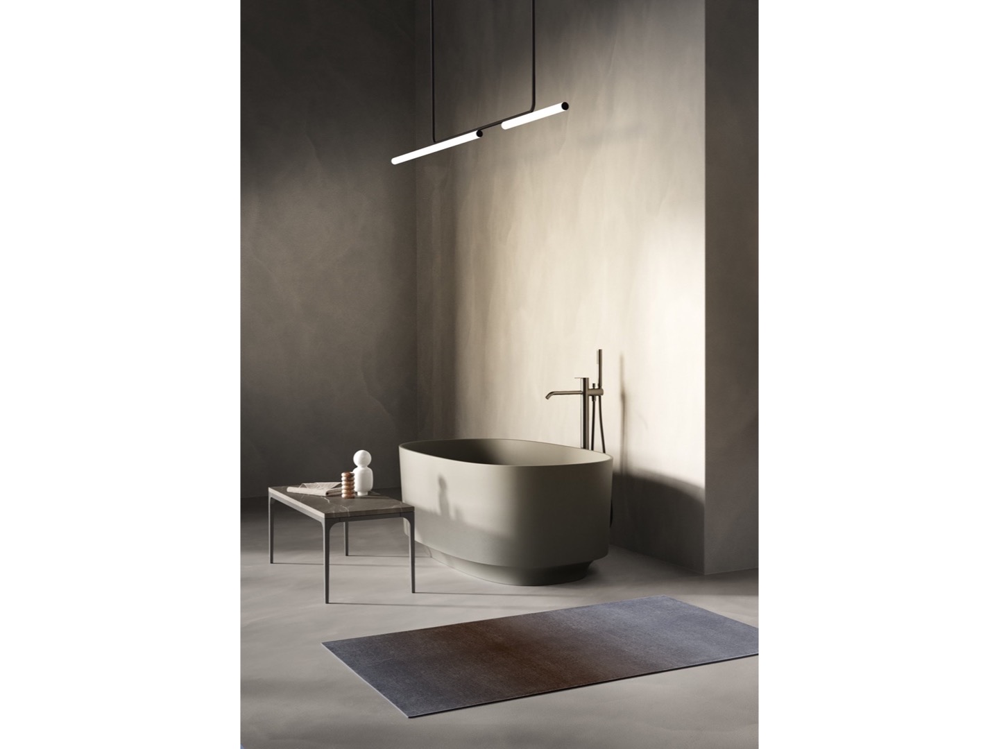 Jego projekt wywodzi się z rurowej konstrukcji z delikatnymi liniami, którą mocuje się do sufitu, pozwalając światłu opadać i delikatnie oświetlać przestrzeń.