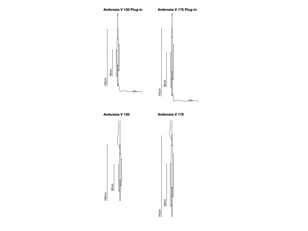 Lampy dostępna jest w dwóch wersjach - pierwszą z nich jest Ambrosia V2, pionowa konstrukcja o wysokości 235 cm, składająca się z dwóch rur świetlnych o różnych długościach. Jej konstrukcja pozwala na obrócenie oświetlenia w kierunku ściany w celu uzyskania światła pośredniego lub w kierunku głównej przestrzeni w celu uzyskania światła bezpośredniego.