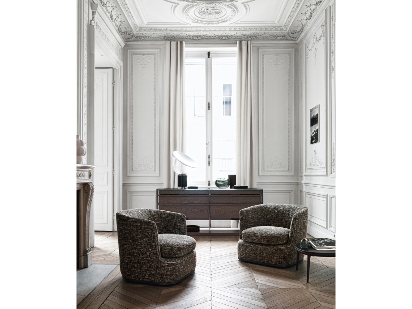 Elementy, które składają się na kolekcje Apollo to: sofa liniowa w dwóch rozmiarach, zakrzywiona sofa, sofa z szezlongiem, dormeuse i fotel obrotowy. Wszystkie mają zakrzywioną, ale rygorystyczną formę, tworząc bardzo harmonijną, zrównoważoną estetykę. Konstrukcja oparcia, głębokość siedziska, wyprofilowane kształty i obfita wyściółka to elementy, które sprawiają, że Apollo jest niezwykle wygodny.