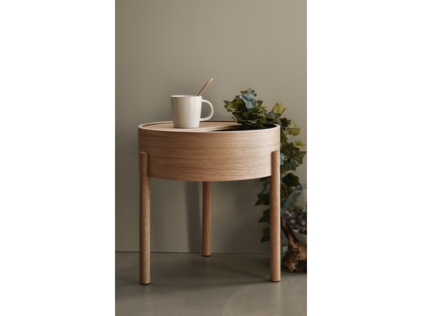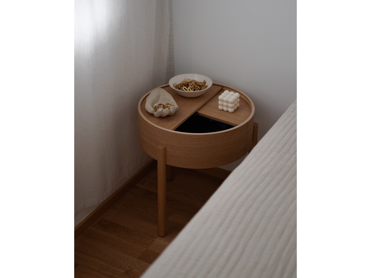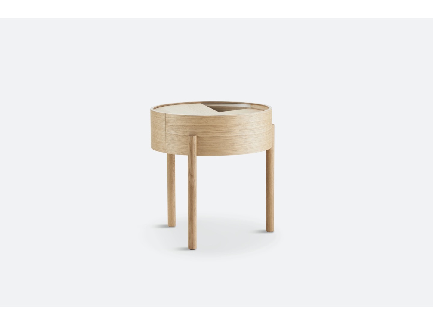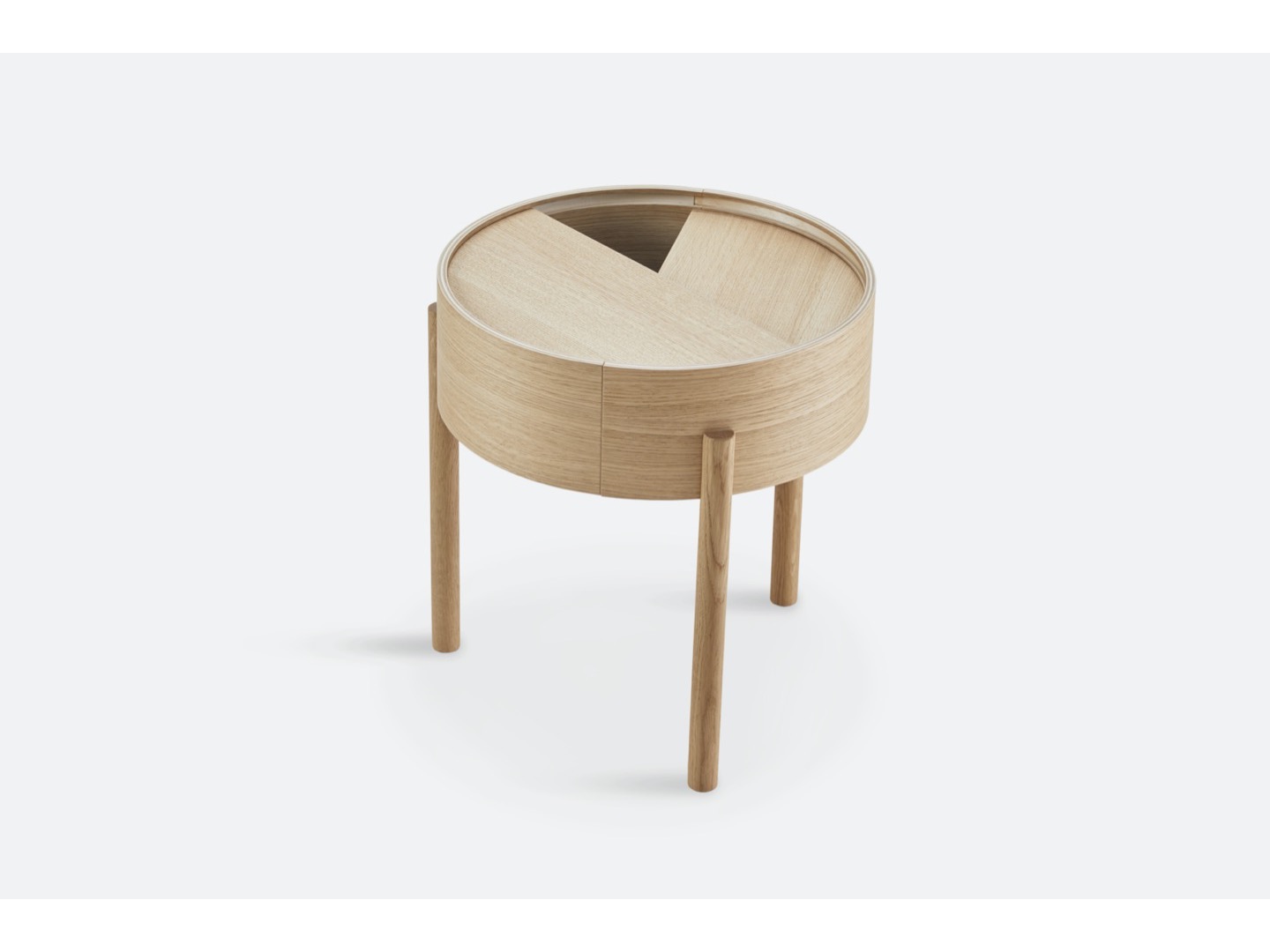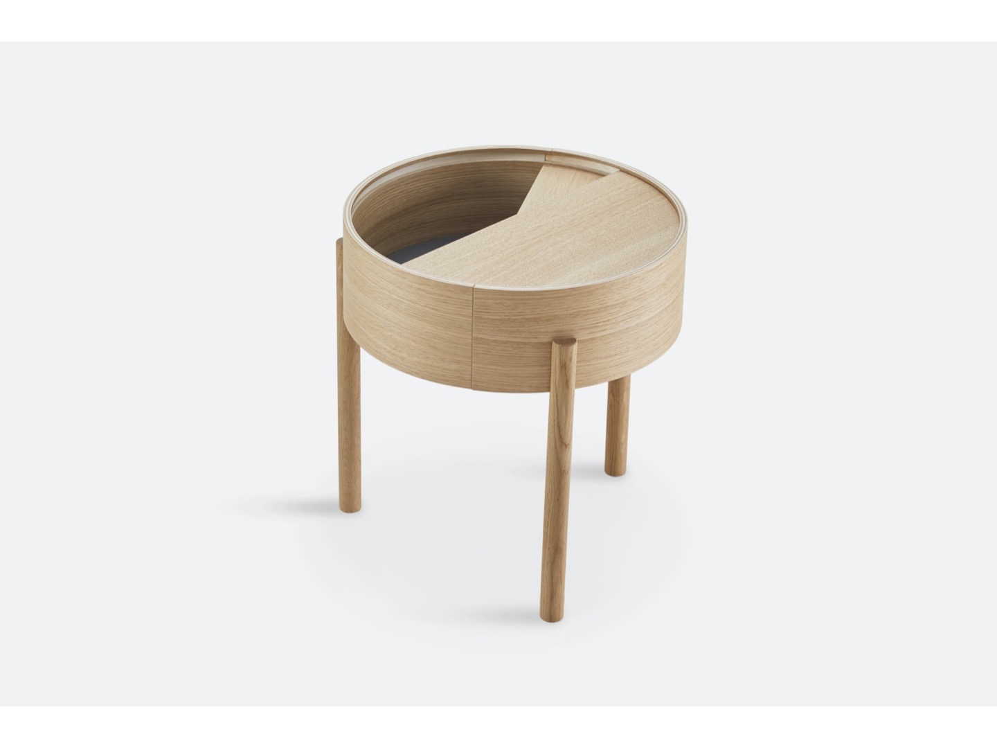 ARC bierze swoją nazwę od matematycznego pojęcia gładkiej krzywej łączącej dwa punkty w kole. Stół ARC zachęca użytkownika do korzystania z prostych funkcjonalności. Blat stolika można otwierać, aby wyeksponować ulubione przedmioty lub zamknąć pokrywę, aby ukryć bałagan. Powierzchnia wewnętrznej przestrzeni do przechowywania pokryta jest gładkim nanolaminatem, który uzupełnia drewno jesionowe, podczas gdy trójnożna konstrukcja dodaje zabawny i lekki akcent w geometrycznym kształcie.