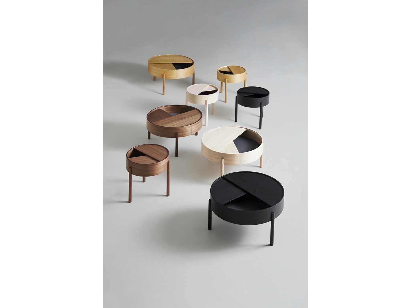 ARC bierze swoją nazwę od matematycznego pojęcia gładkiej krzywej łączącej dwa punkty w kole. Stół ARC zachęca użytkownika do korzystania z prostych funkcjonalności. Blat stolika można otwierać, aby wyeksponować ulubione przedmioty lub zamknąć pokrywę, aby ukryć bałagan. Powierzchnia wewnętrznej przestrzeni do przechowywania pokryta jest gładkim nanolaminatem, który uzupełnia drewno jesionowe, podczas gdy trójnożna konstrukcja dodaje zabawny i lekki akcent w geometrycznym kształcie.