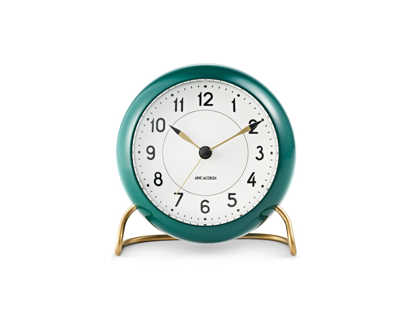 Arne Jacobsen Station Table clock green - budzik zaprojektowany przez Arne Jacobsena. Śliczny dodatek w skandynawskim stylu, który nie tylko ozdabia, ale także jest niezwykle praktyczny. Zaprojektowany w 1939 roku nawiązuje wzornictwem do krzesełek Ant i No.7. Wyposażony we współczesny mechanizm elektryczny zasilany dwoma bateriami AA.