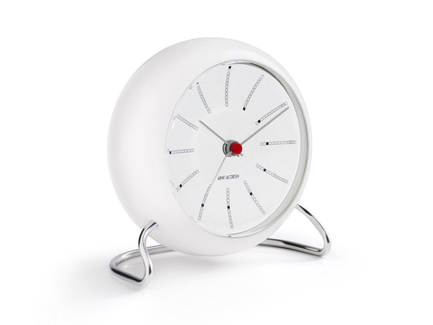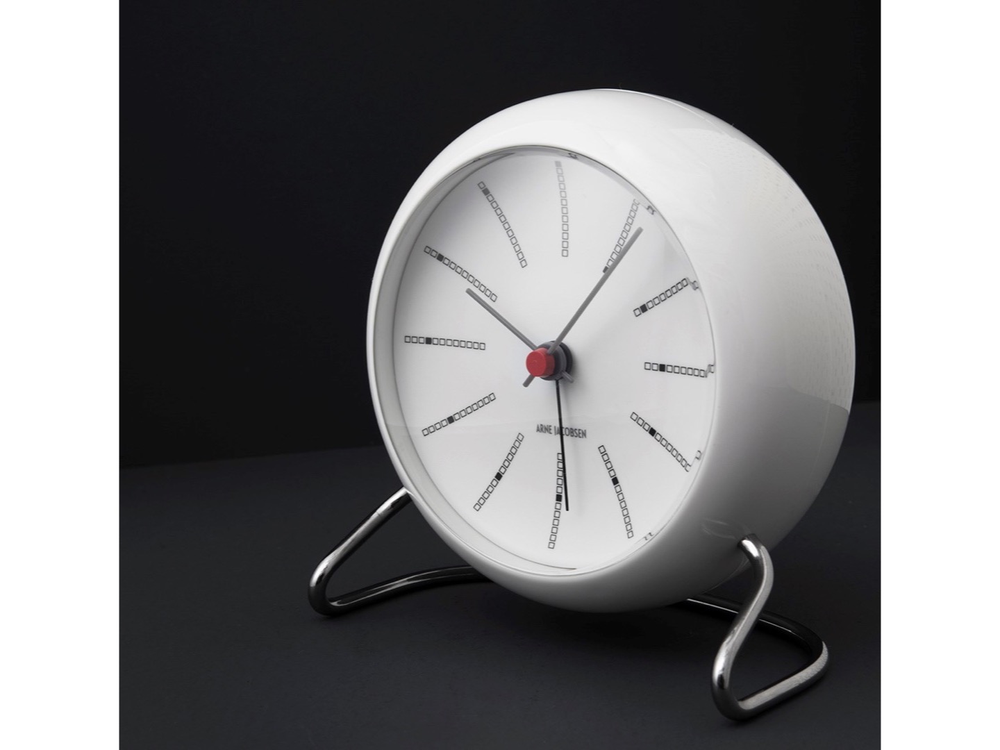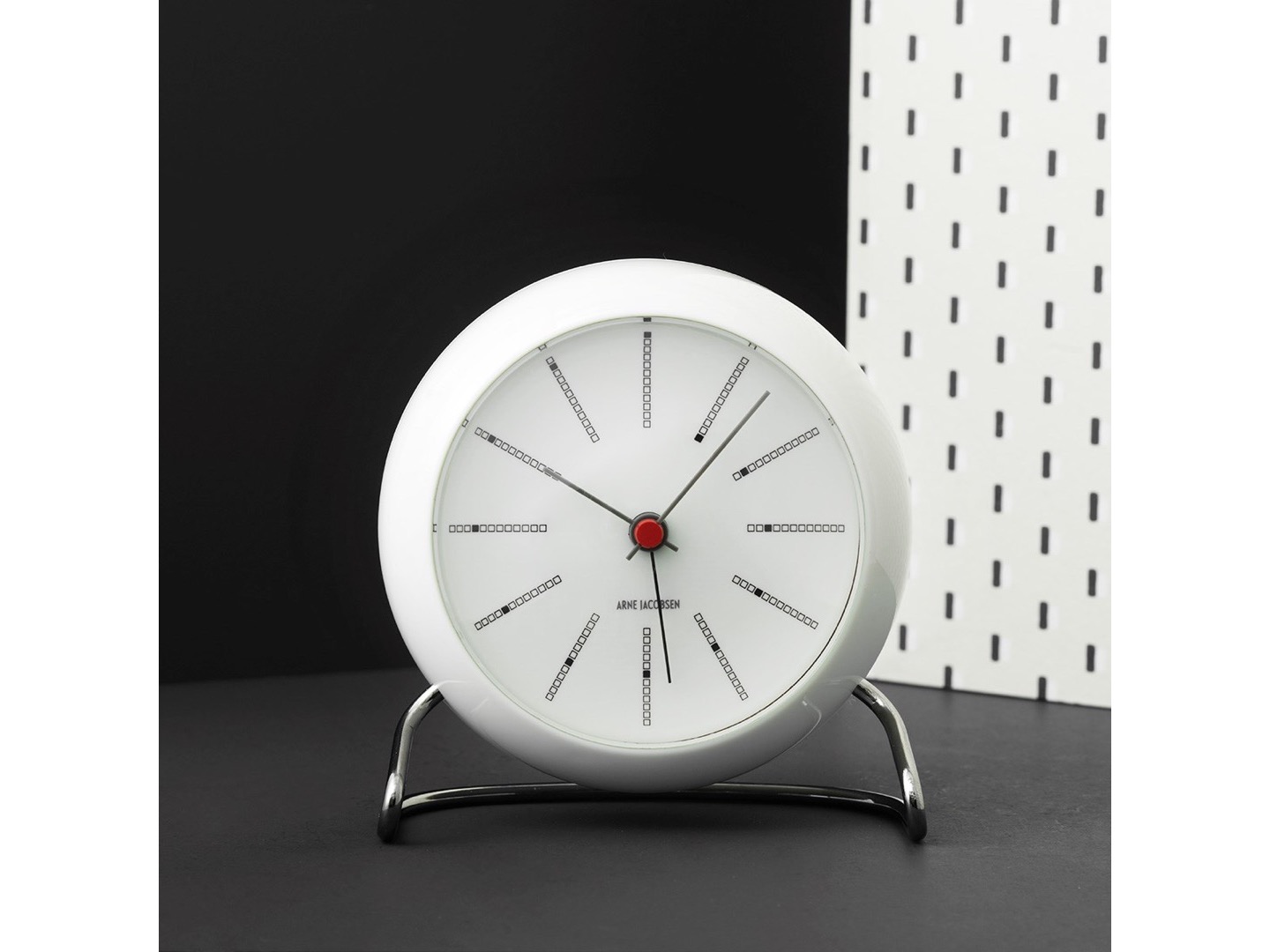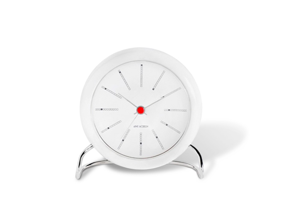 Arne Jacobsen Wall Table clock - budzik zaprojektowany przez Arne Jacobsena. Śliczny dodatek w skandynawskim stylu, który nie tylko ozdabia, ale także jest niezwykle praktyczny. Zaprojektowany w 1939 roku nawiązuje wzornictwem do krzesełek Ant i No.7. Wyposażony we współczesny mechanizm elektryczny zasilany dwoma bateriami AA.