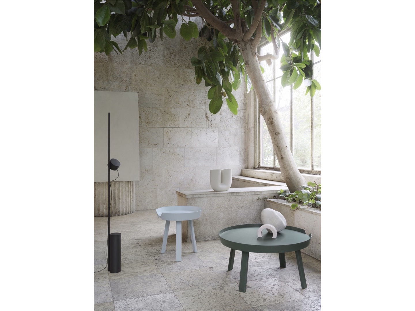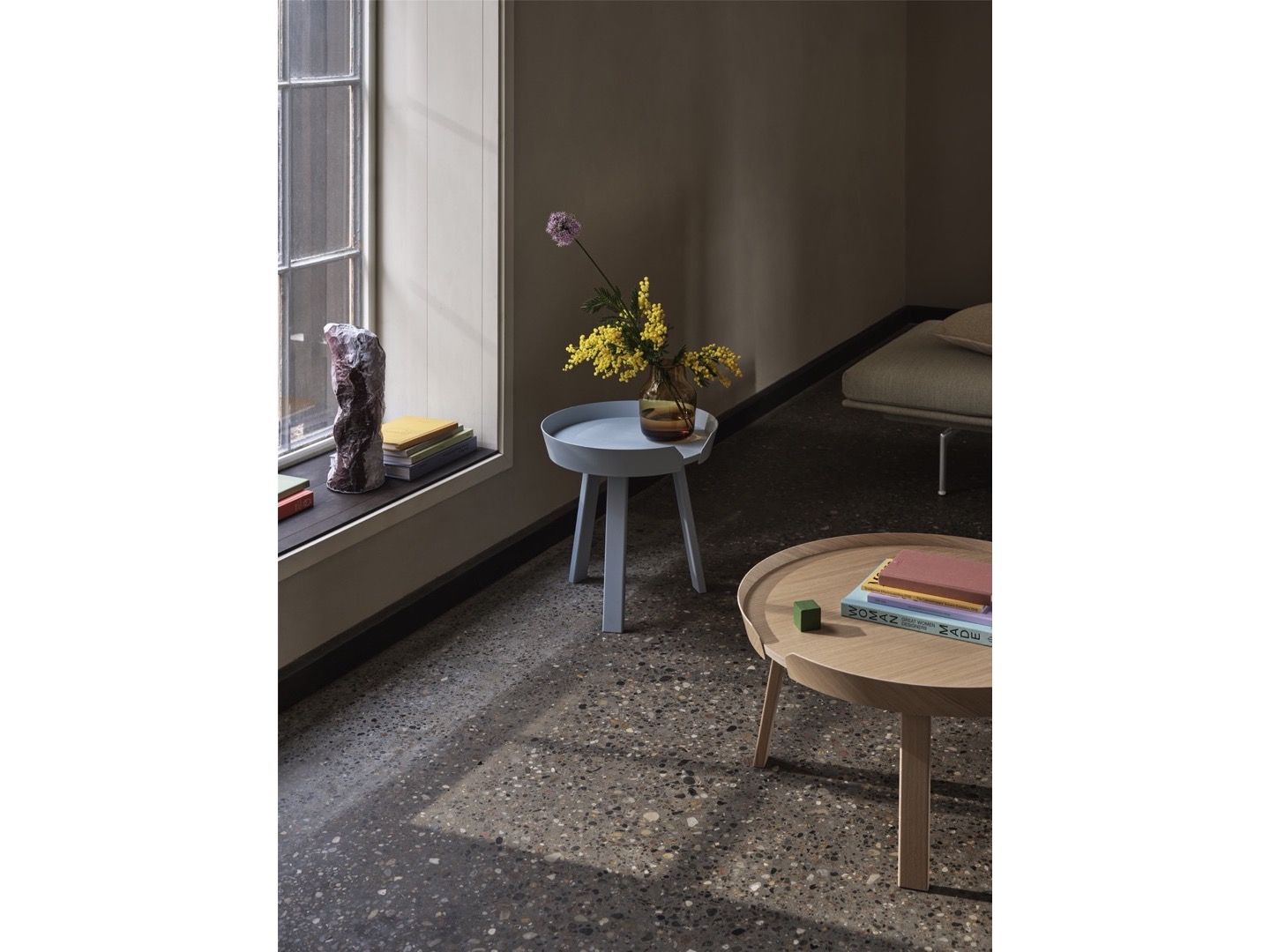 Stolik kawowy Around wnosi nową perspektywę do swojej typologii dzięki charakterystycznej drewnianej ramie z forniru biegnącej wzdłuż krawędzi stołu, nawiązując do idei skandynawskiego designu. Dzięki okrągłemu kształtowi i wielu rozmiarom stolik kawowy Around może być używany w wielu ustawieniach, samodzielnie lub w grupach w salonie, holu lub pokoju hotelowym.