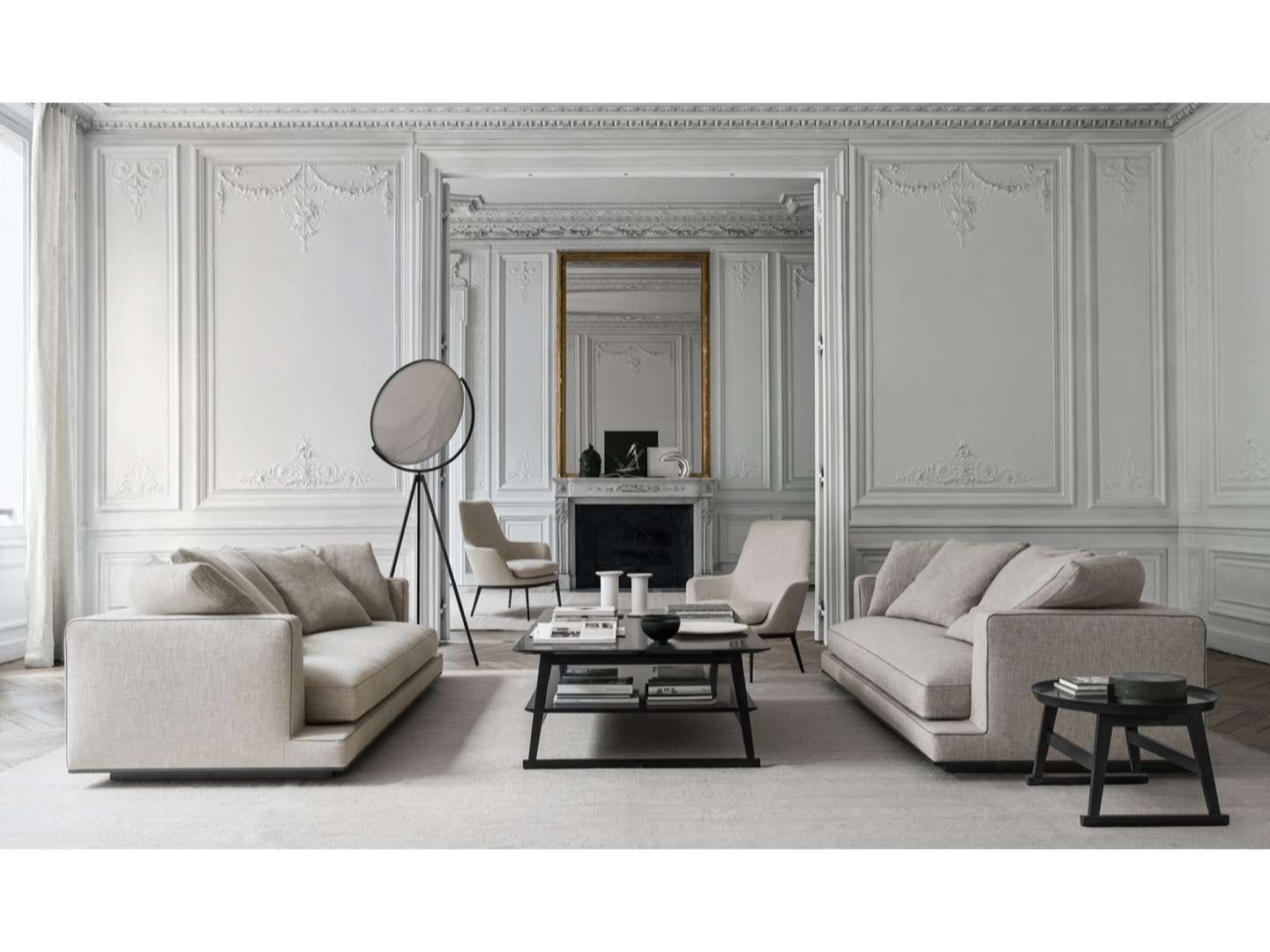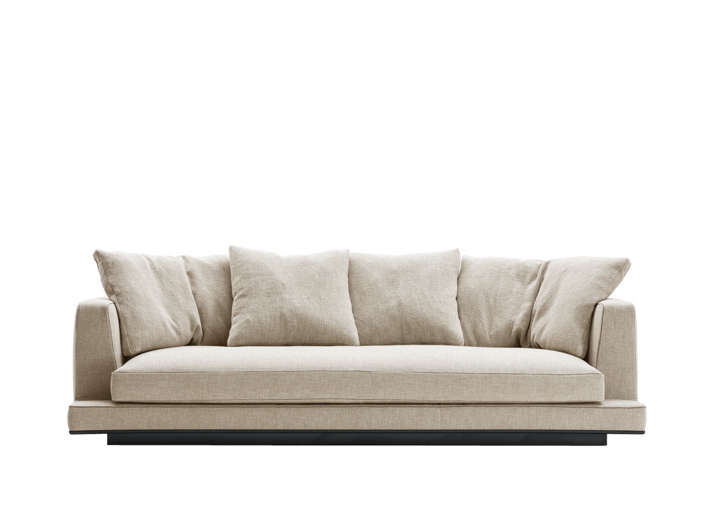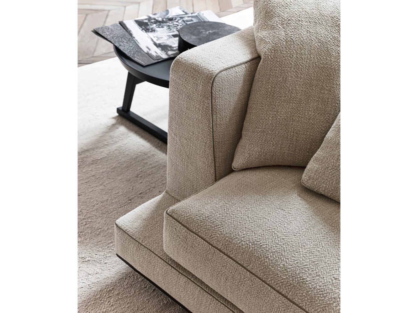 Geometryczne bryły uniesione ponad podłogę i miękkie, czyste, rygorystyczne linie to charakterystyczne cechy sof Aurae. Kolekcja ta oferuje wysoki poziom formalnej elegancji, z liniowymi siedzeniami w pięciu wymiarach i dużą głębokością (szerokość cm. 210-250-290-330-370 x głębokość cm. 105), uzupełnionymi miękkimi poduszkami oparciowymi, aby zagwarantować maksymalny komfort. Starannie wykonane, dopasowane detale na ekskluzywnej tapicerce z tkaniny są ozdobione wykończeniem ze sztucznej skóry, które definiuje kształt. Oprócz tapicerki z tkaniny dostępne są skórzane pokrowce ze szwami profilowanymi. Dolna krawędź obwodu dostępna jest w różnych lakierowanych metalowych wykończeniach: brązowym niklu, czarnym chromie, graficie i bursztynie.