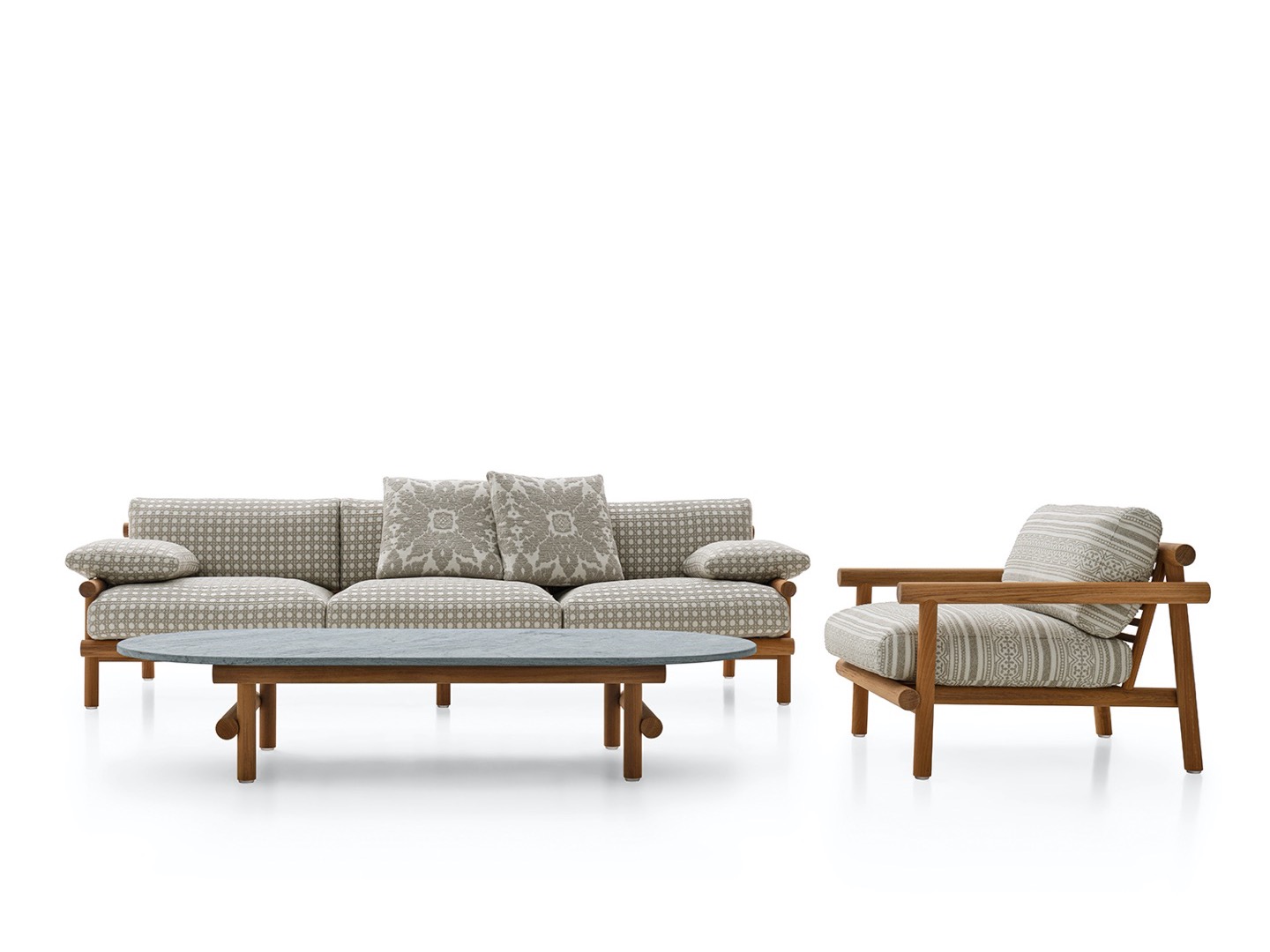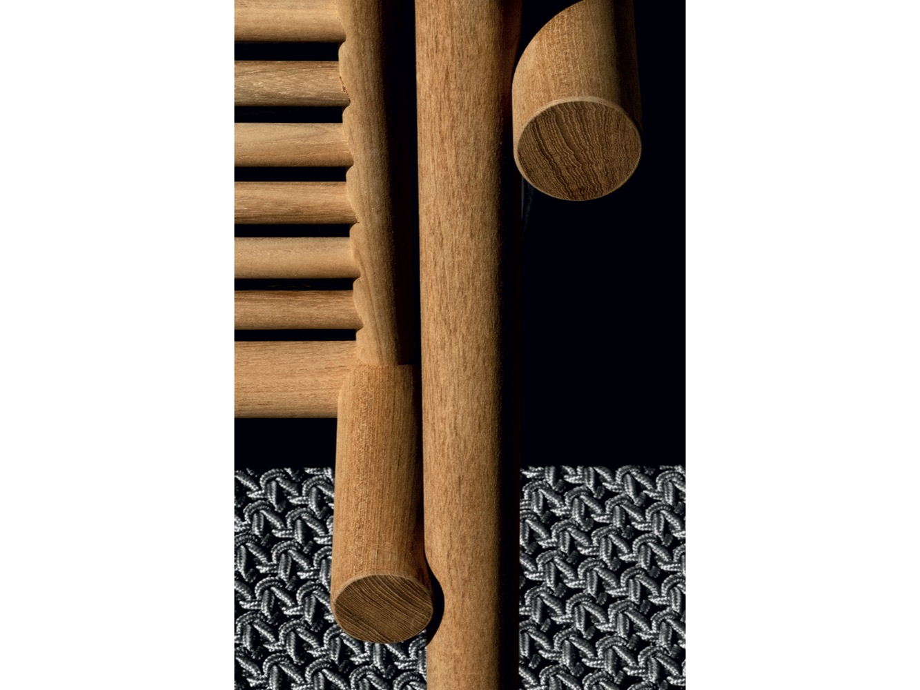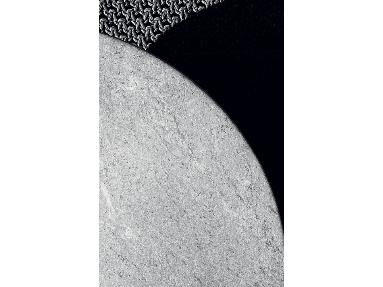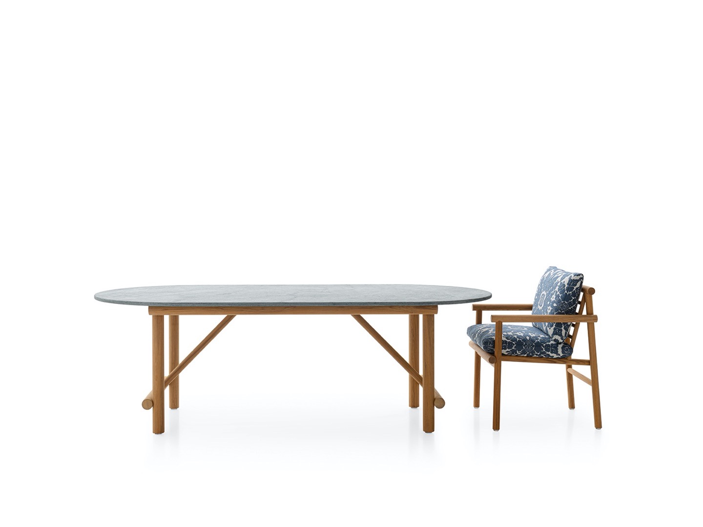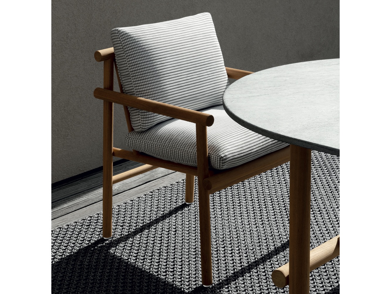 Krzesło do jadalni nawiązuje stylistycznie do innych siedzeń, zapewniając idealne poczucie spójności, dzięki strukturze z naturalnego drewna tekowego i dwóm obficie wyściełanym poduszkom pokrytym tkaniną. Stół wyróżnia się owalnym blatem w typowym kamieniu alpejskim. Konstrukcja nośna z naturalnego drewna tekowego wydaje się lekka, ale jest niezwykle wytrzymała, odporna na warunki atmosferyczne i podtrzymująca ciężki blat. Nawet stolik kawowy ma okrągłą strukturę z naturalnego drewna tekowego, z blatem z serpentyny.