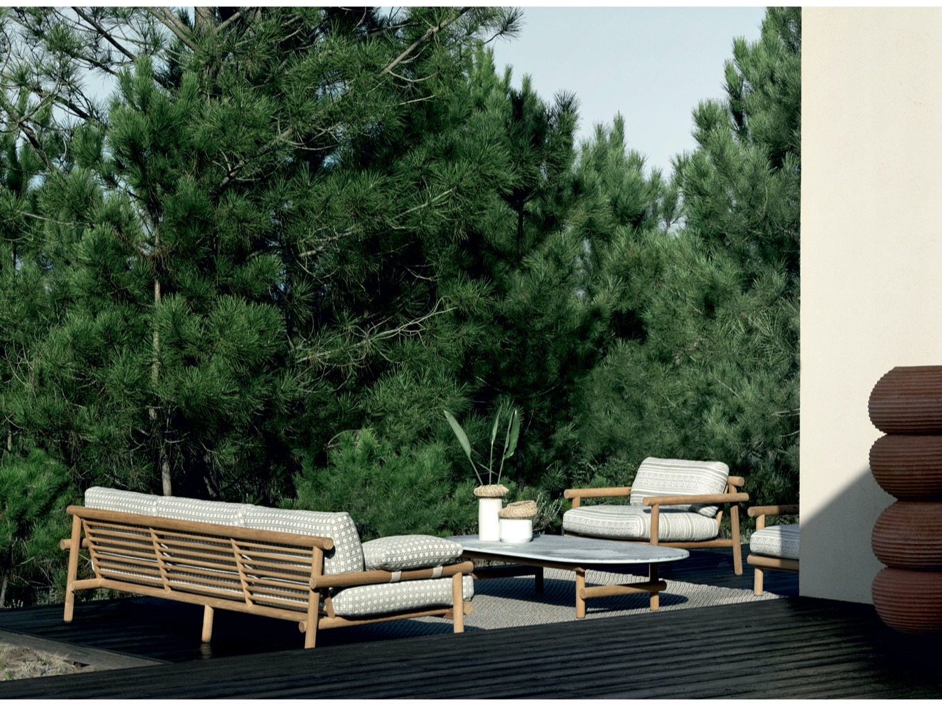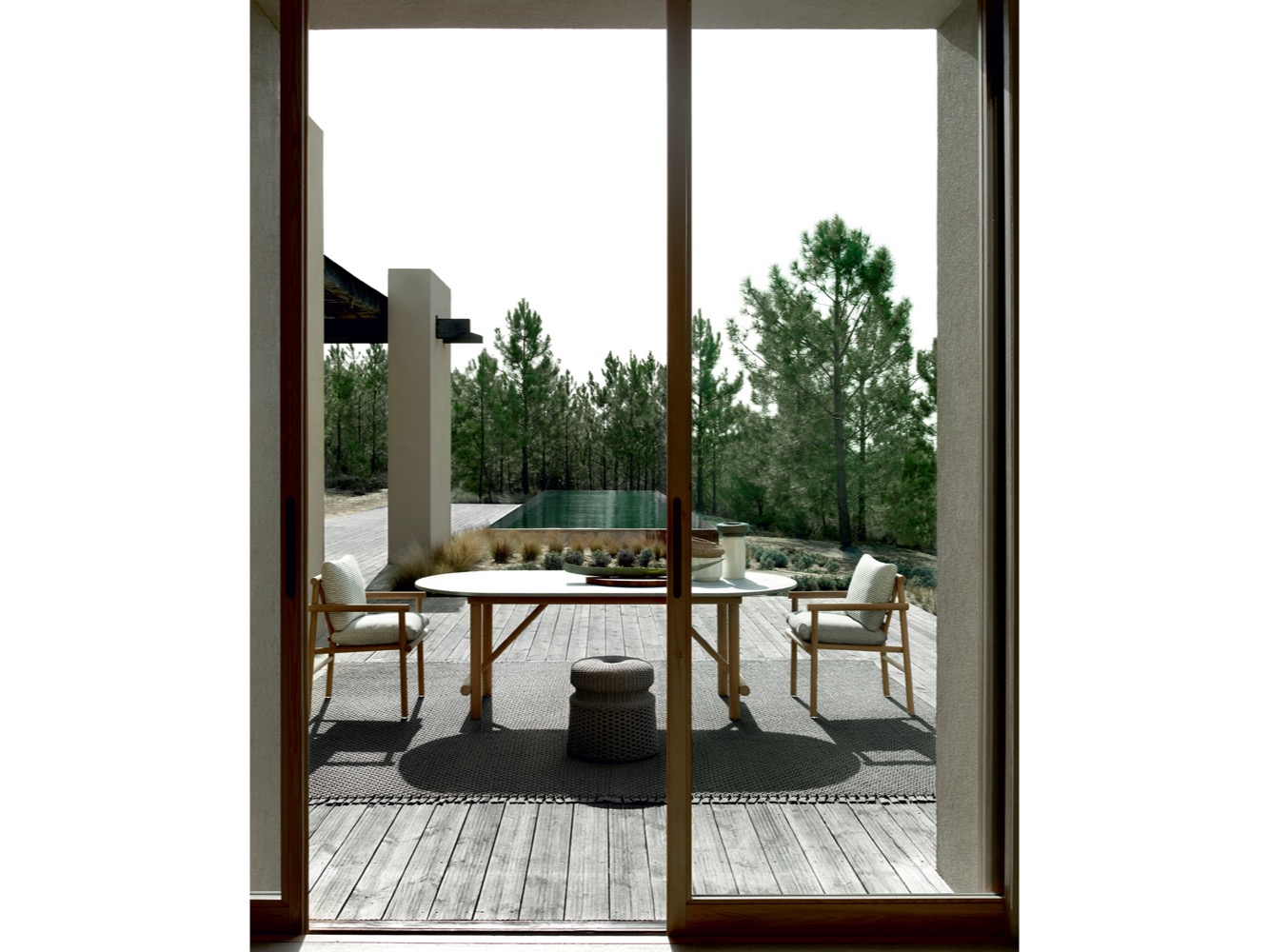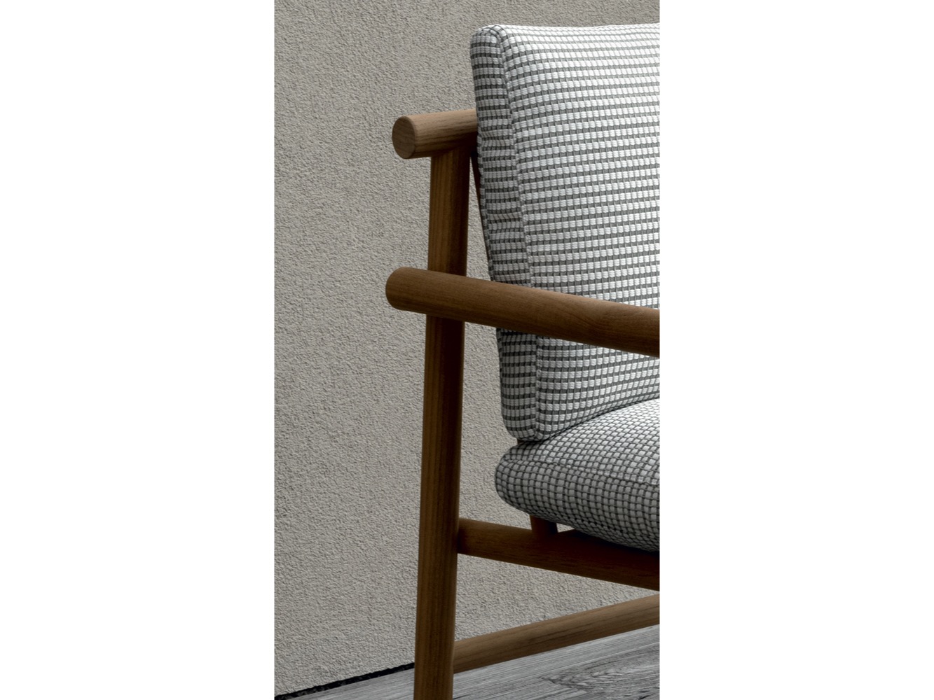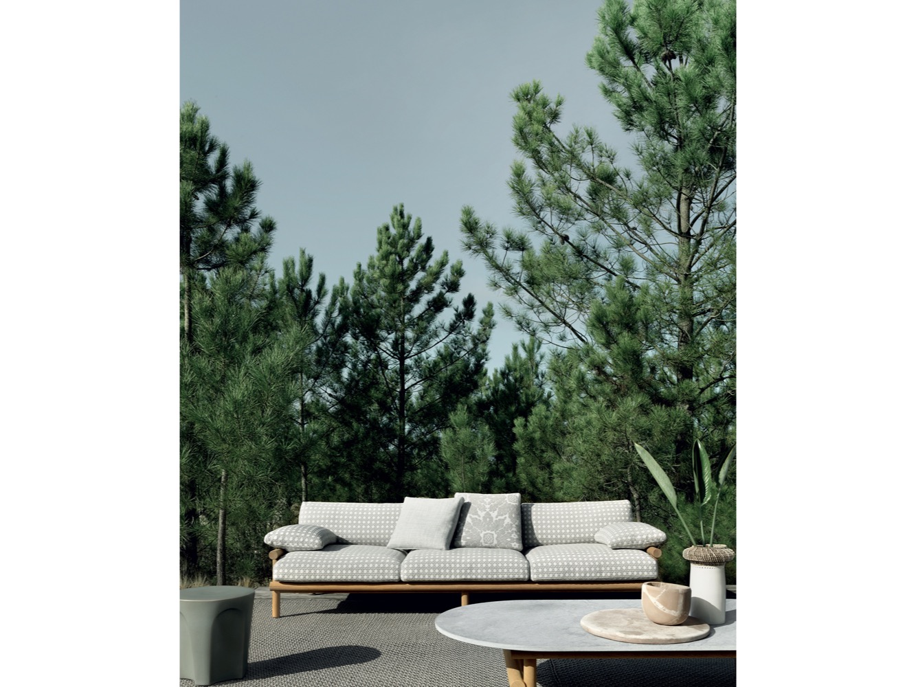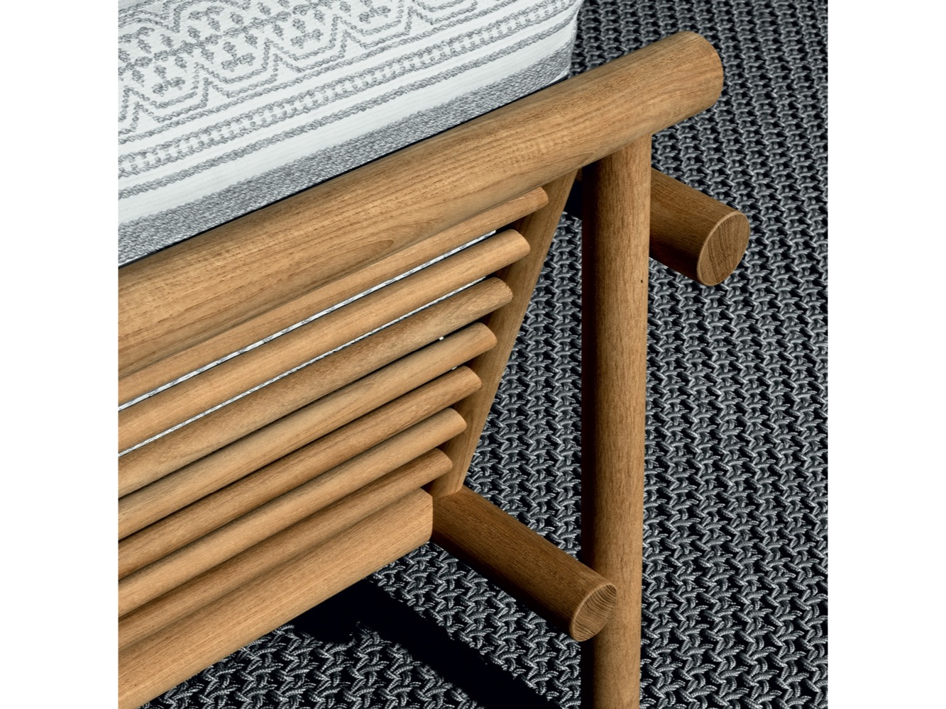 Krzesło do jadalni nawiązuje stylistycznie do innych siedzeń, zapewniając idealne poczucie spójności, dzięki strukturze z naturalnego drewna tekowego i dwóm obficie wyściełanym poduszkom pokrytym tkaniną. Stół wyróżnia się owalnym blatem w typowym kamieniu alpejskim. Konstrukcja nośna z naturalnego drewna tekowego wydaje się lekka, ale jest niezwykle wytrzymała, odporna na warunki atmosferyczne i podtrzymująca ciężki blat. Nawet stolik kawowy ma okrągłą strukturę z naturalnego drewna tekowego, z blatem z serpentyny.