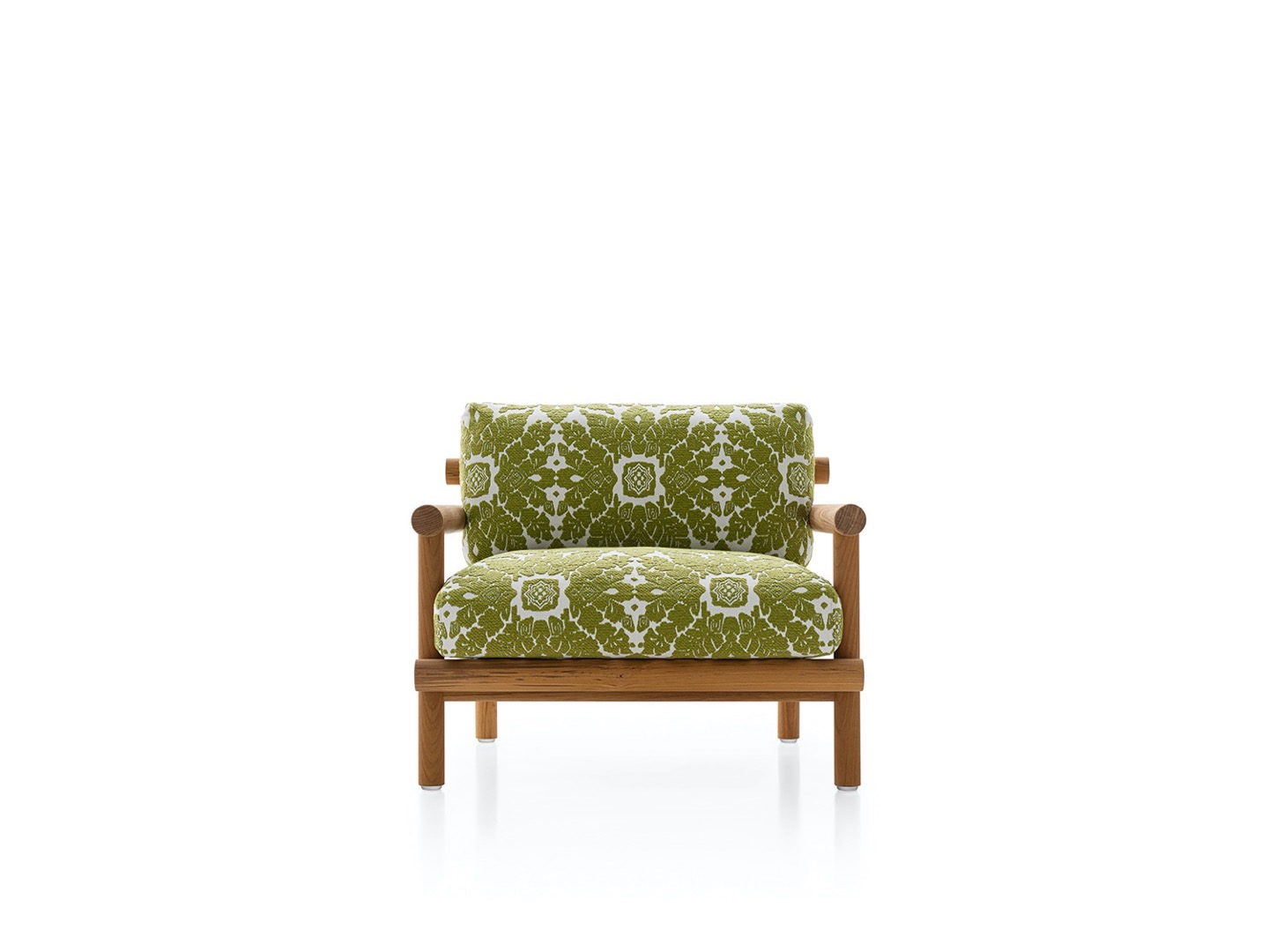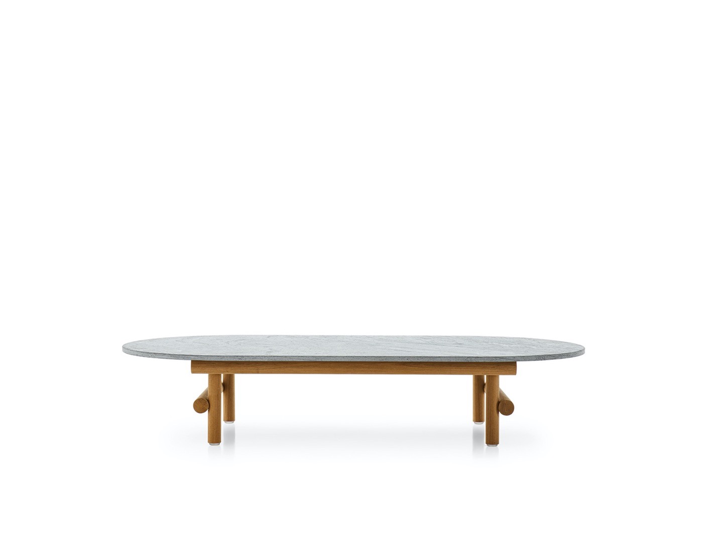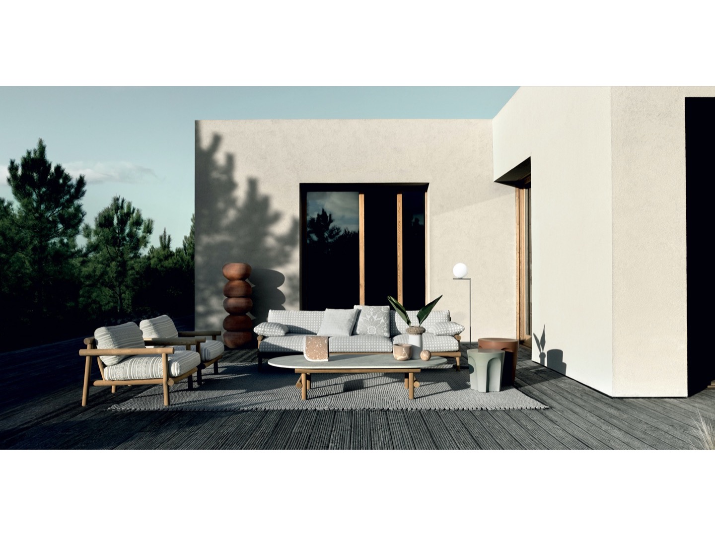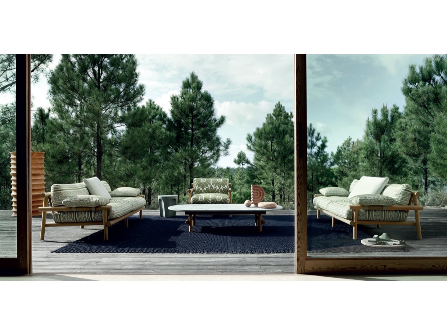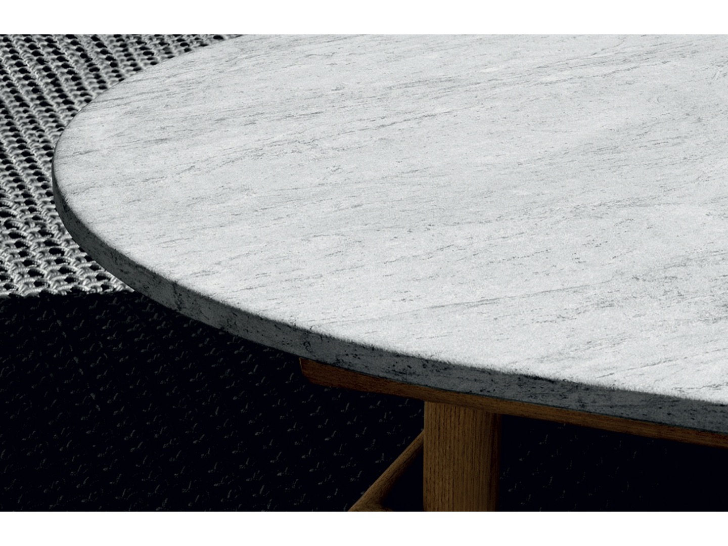 Krzesło do jadalni nawiązuje stylistycznie do innych siedzeń, zapewniając idealne poczucie spójności, dzięki strukturze z naturalnego drewna tekowego i dwóm obficie wyściełanym poduszkom pokrytym tkaniną. Stół wyróżnia się owalnym blatem w typowym kamieniu alpejskim. Konstrukcja nośna z naturalnego drewna tekowego wydaje się lekka, ale jest niezwykle wytrzymała, odporna na warunki atmosferyczne i podtrzymująca ciężki blat. Nawet stolik kawowy ma okrągłą strukturę z naturalnego drewna tekowego, z blatem z serpentyny.