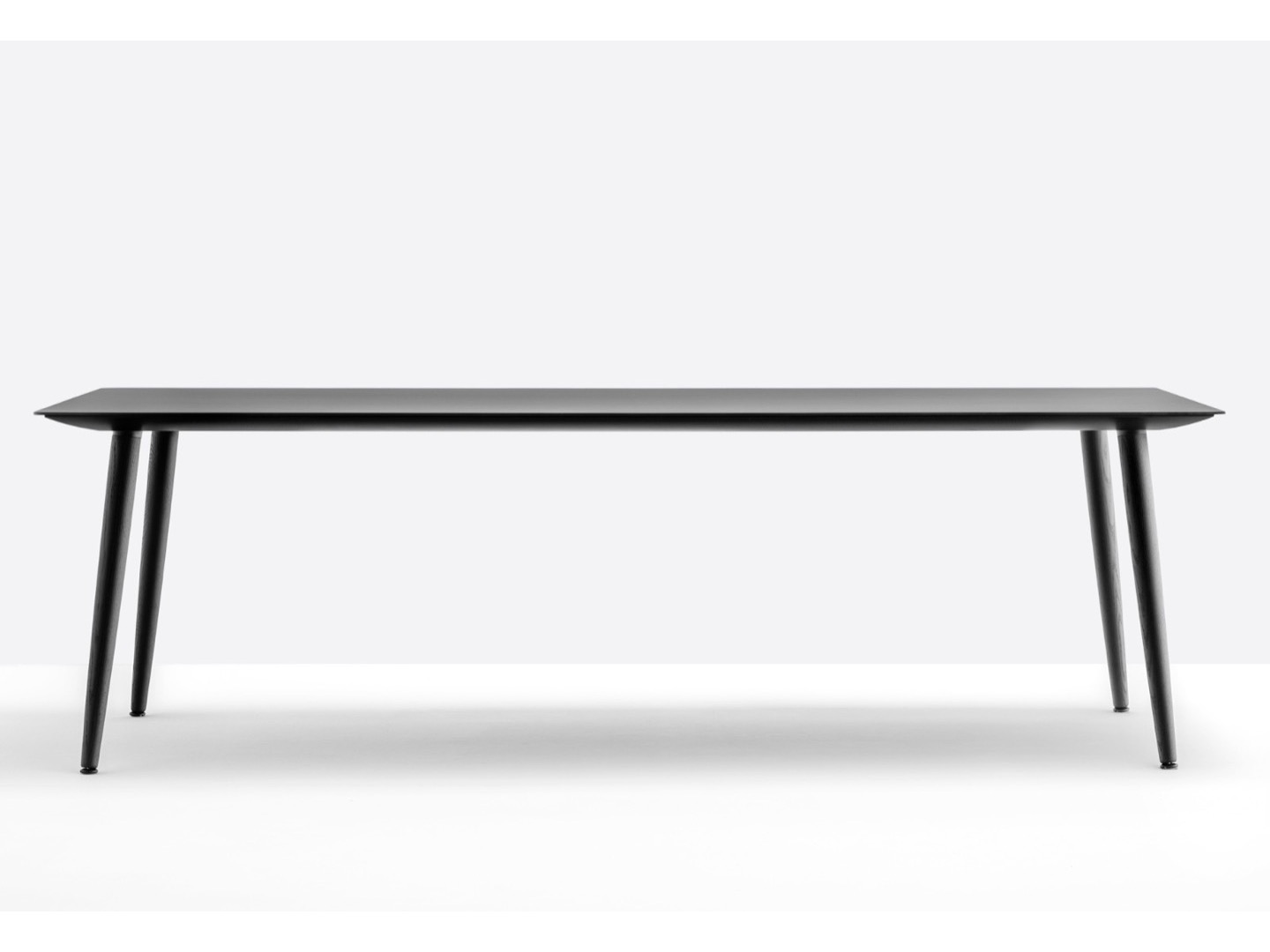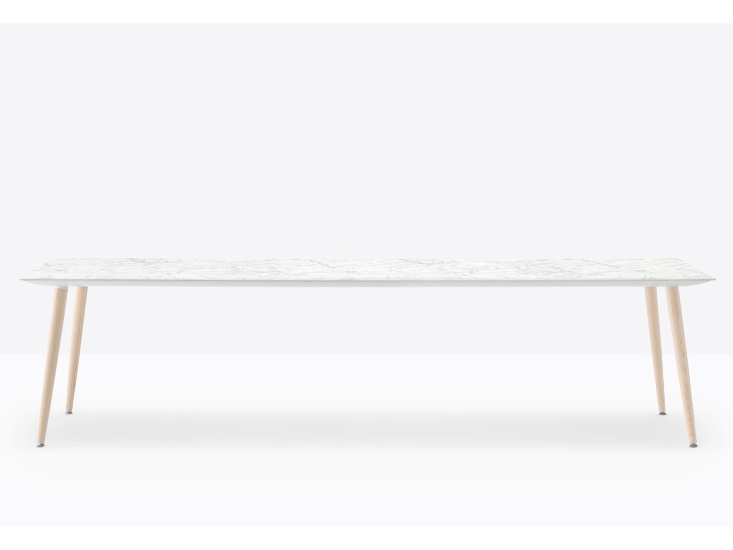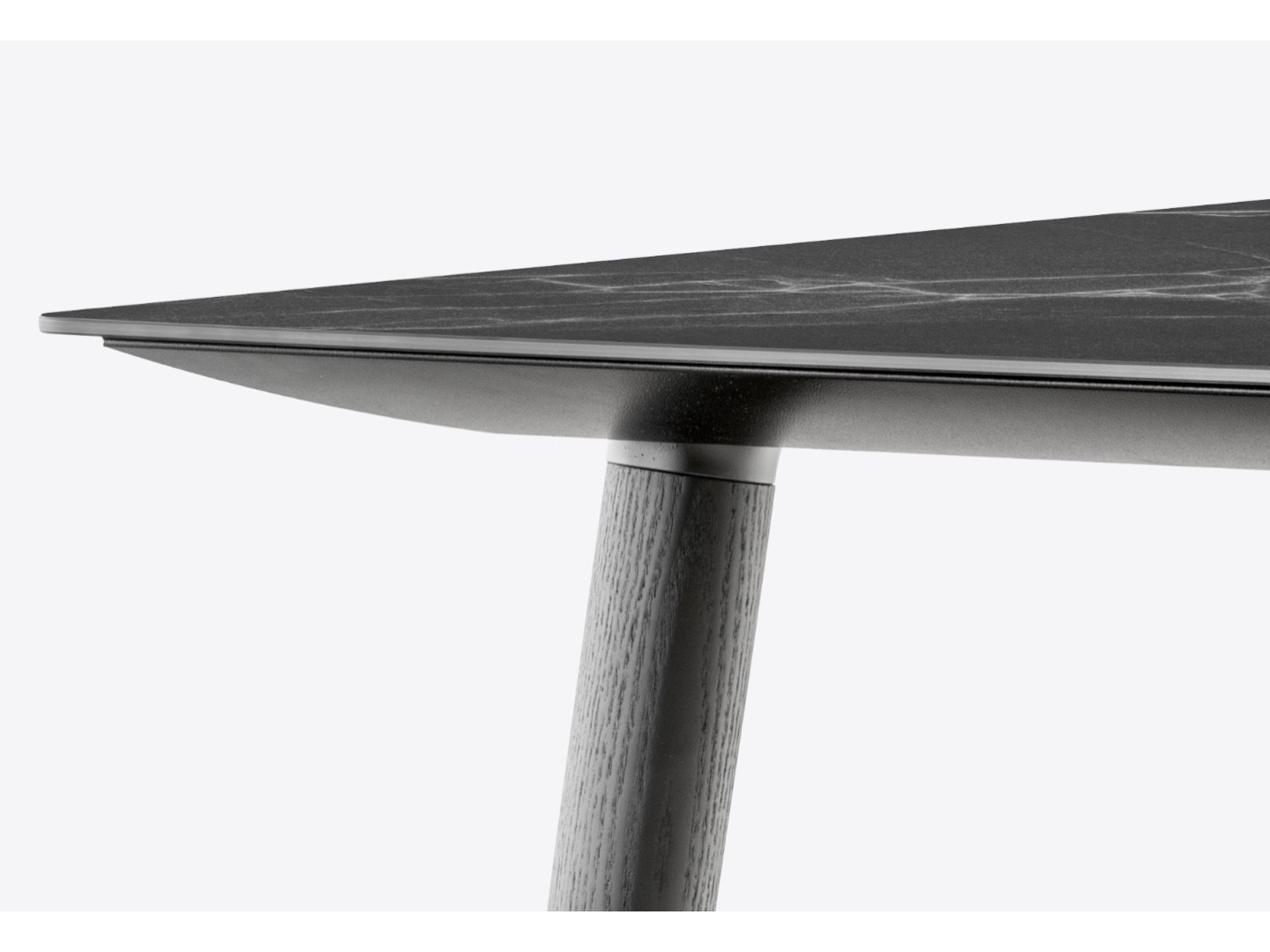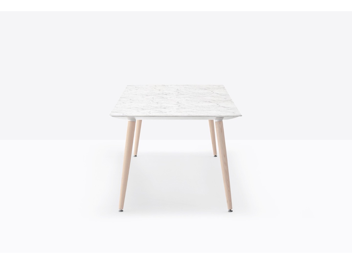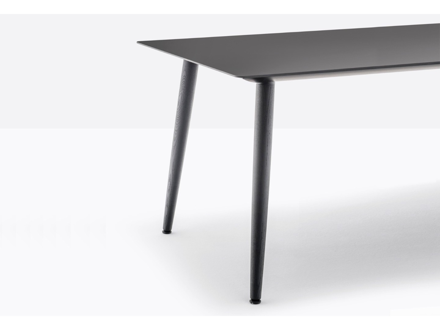 Stół Babila łączy surowe linie i naturalne drewno nóg z litego jesionu z ultracienkim kwadratowym, okrągłym lub prostokątnym blatem z laminatu, wspieranym przez wytłaczaną aluminiową ramę.