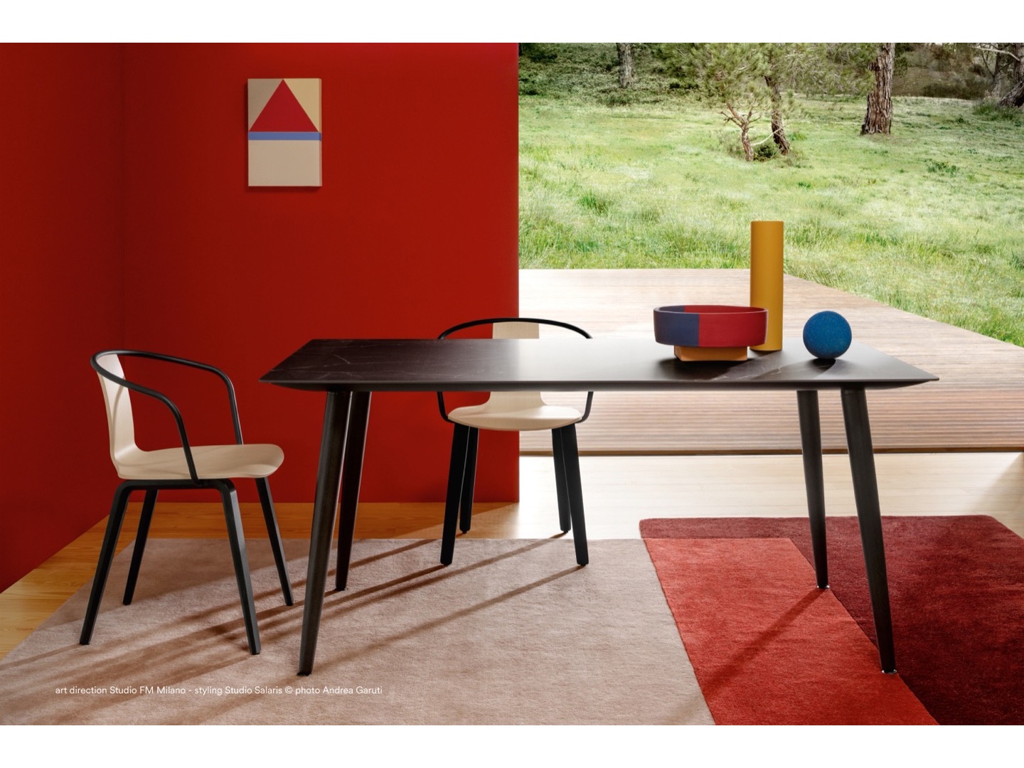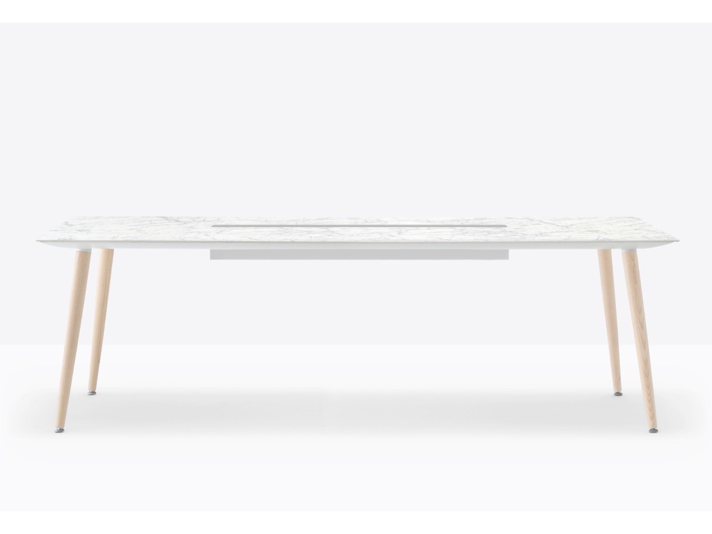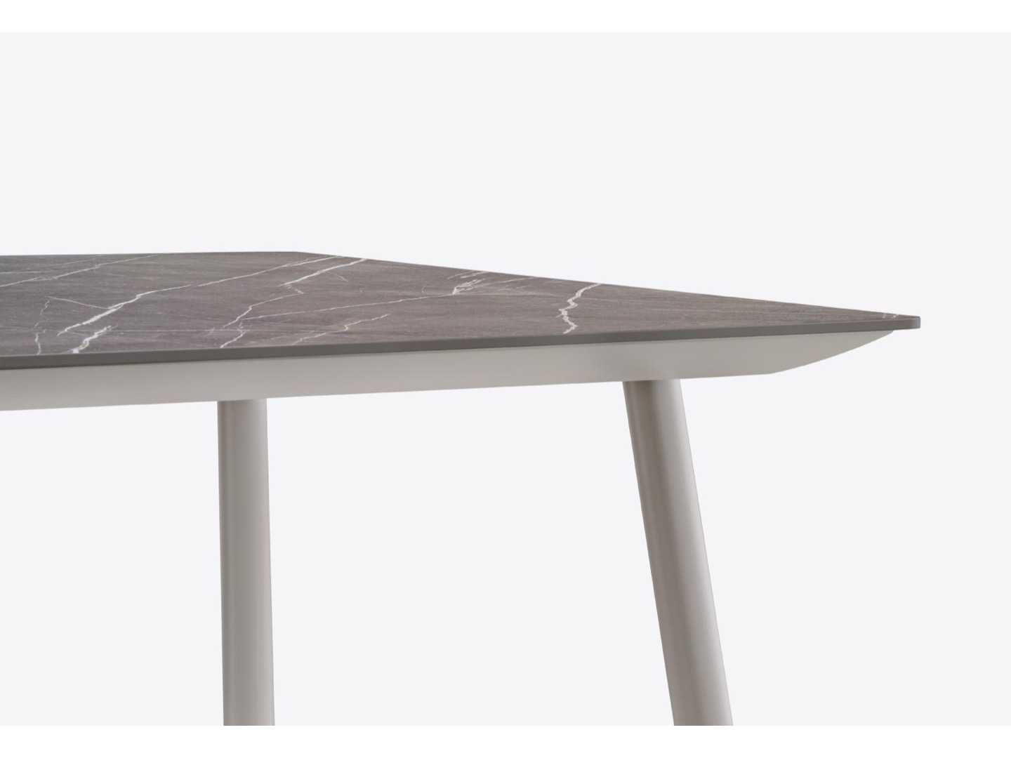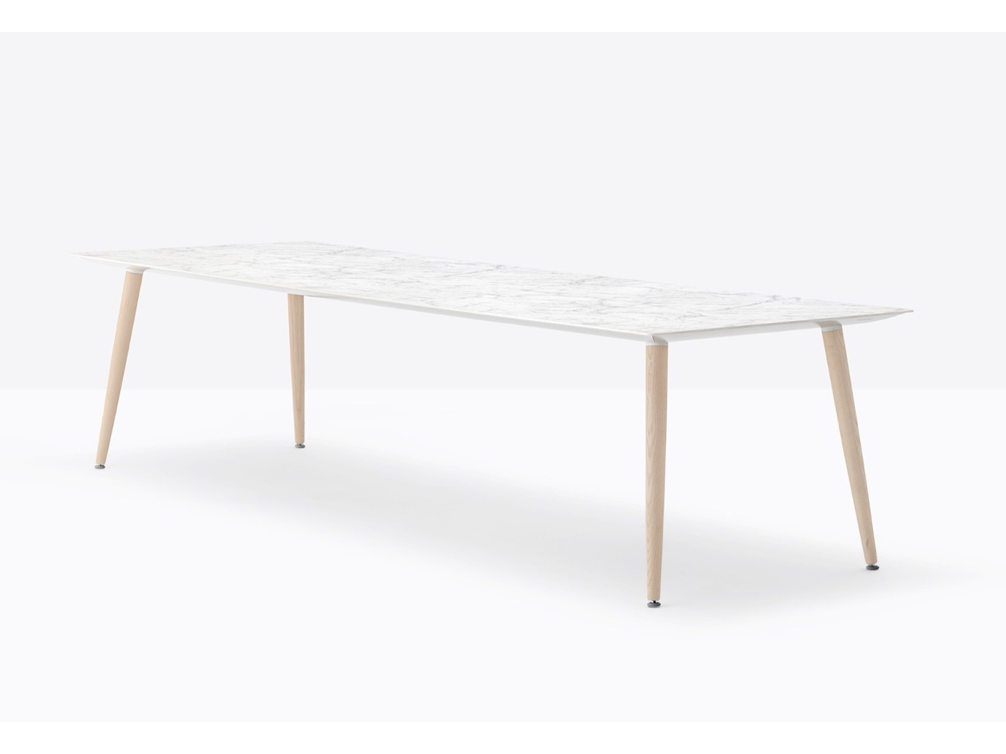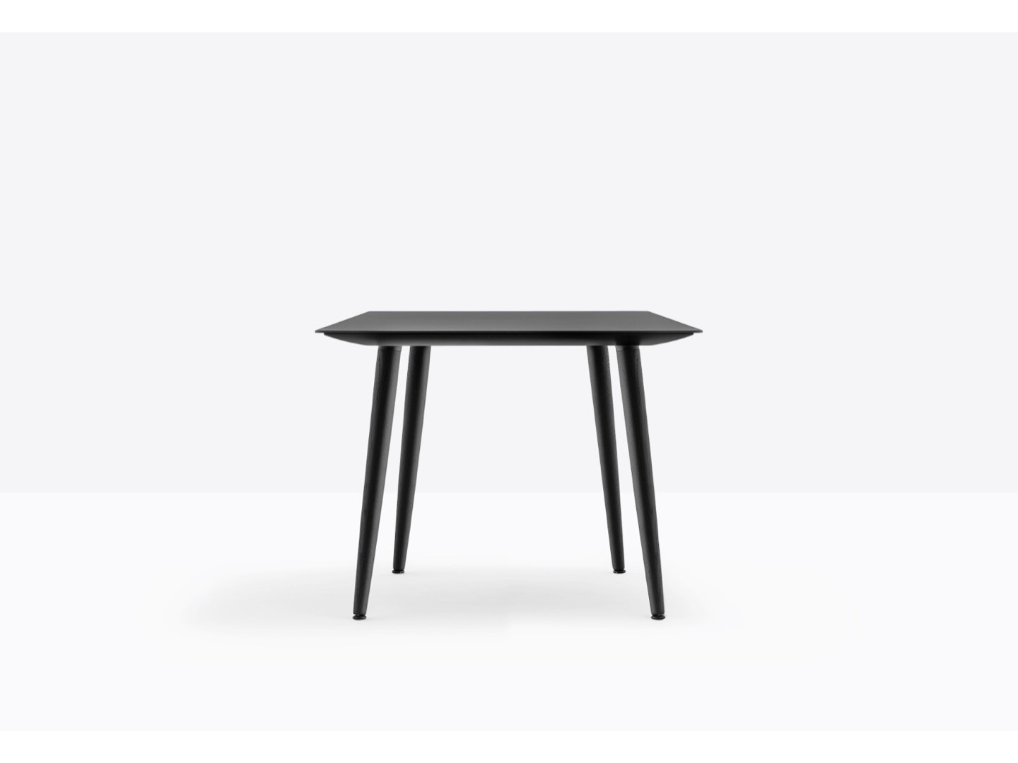 Stół Babila łączy surowe linie i naturalne drewno nóg z litego jesionu z ultracienkim kwadratowym, okrągłym lub prostokątnym blatem z laminatu, wspieranym przez wytłaczaną aluminiową ramę.