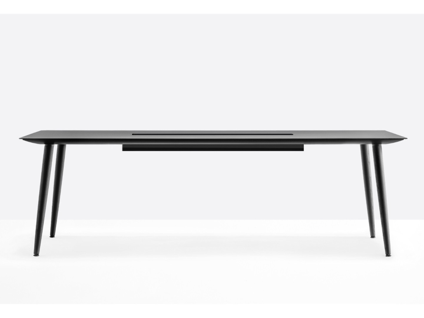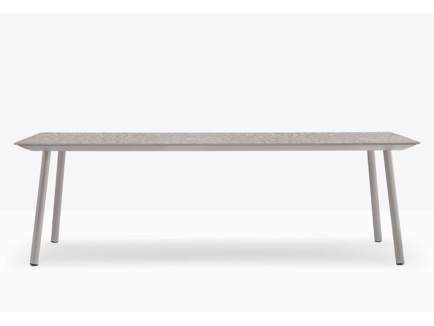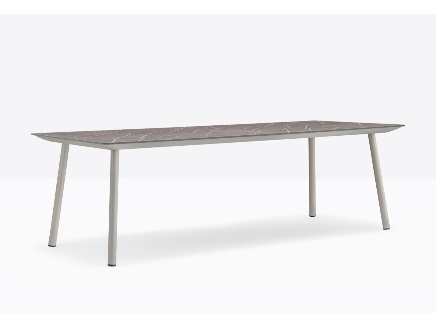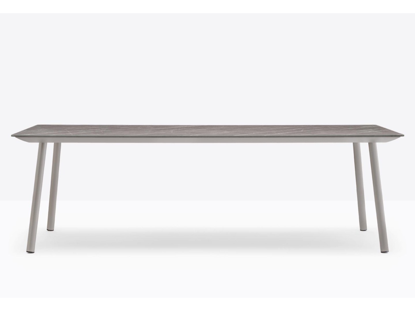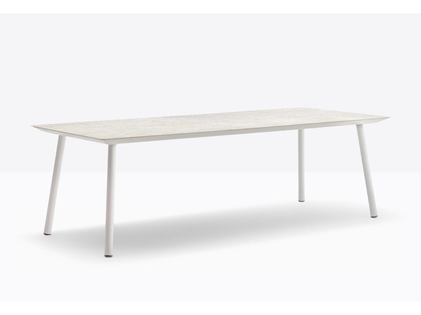 Stół Babila łączy surowe linie i naturalne drewno nóg z litego jesionu z ultracienkim kwadratowym, okrągłym lub prostokątnym blatem z laminatu, wspieranym przez wytłaczaną aluminiową ramę.