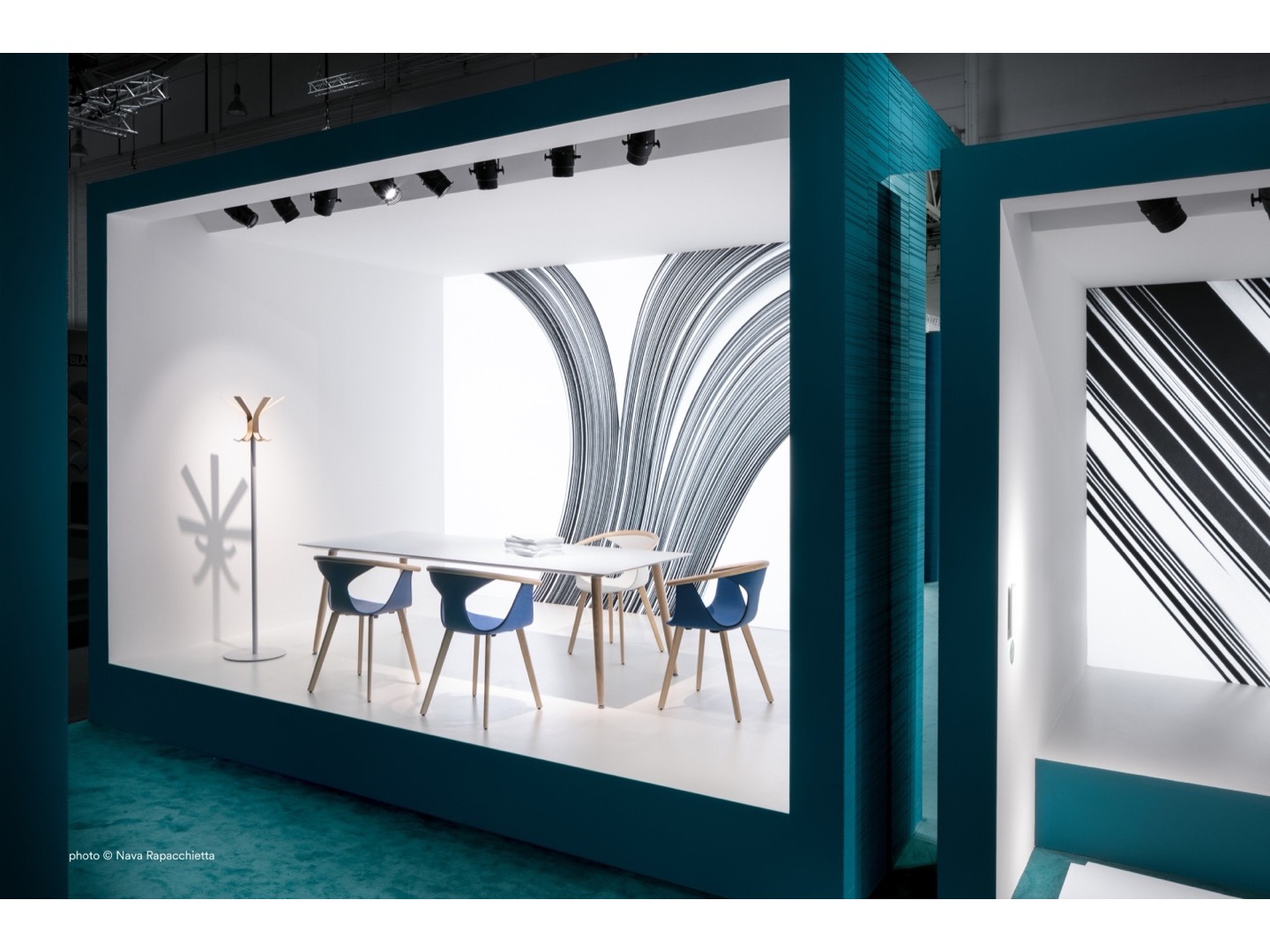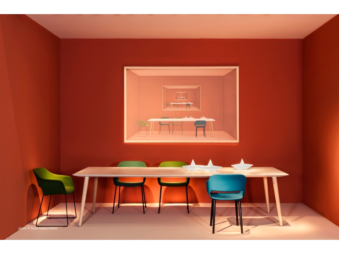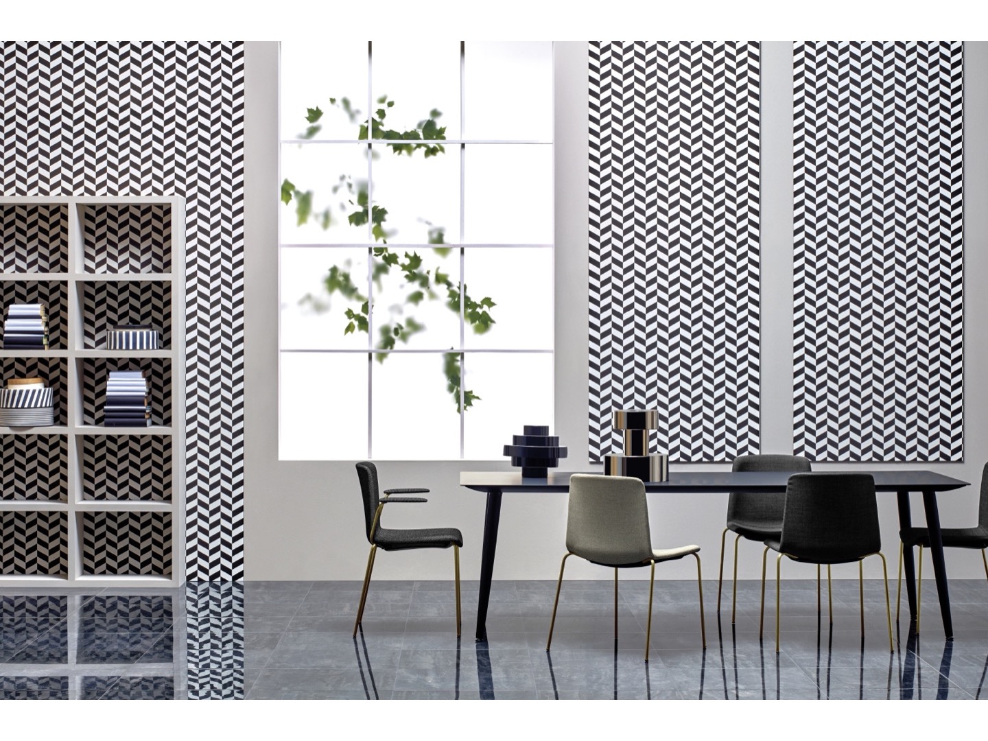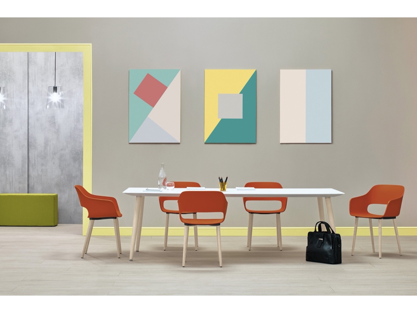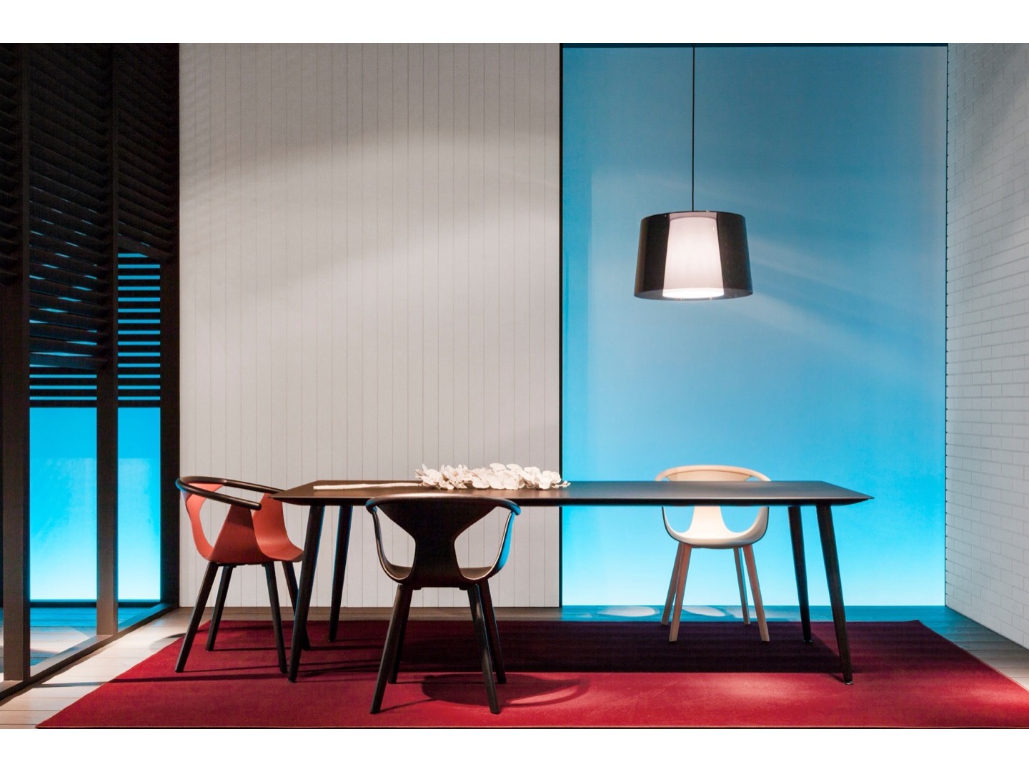 Stół Babila łączy surowe linie i naturalne drewno nóg z litego jesionu z ultracienkim kwadratowym, okrągłym lub prostokątnym blatem z laminatu, wspieranym przez wytłaczaną aluminiową ramę.