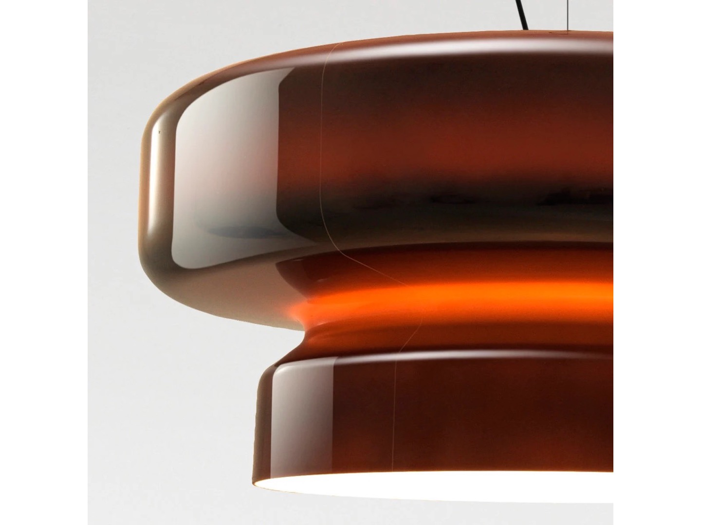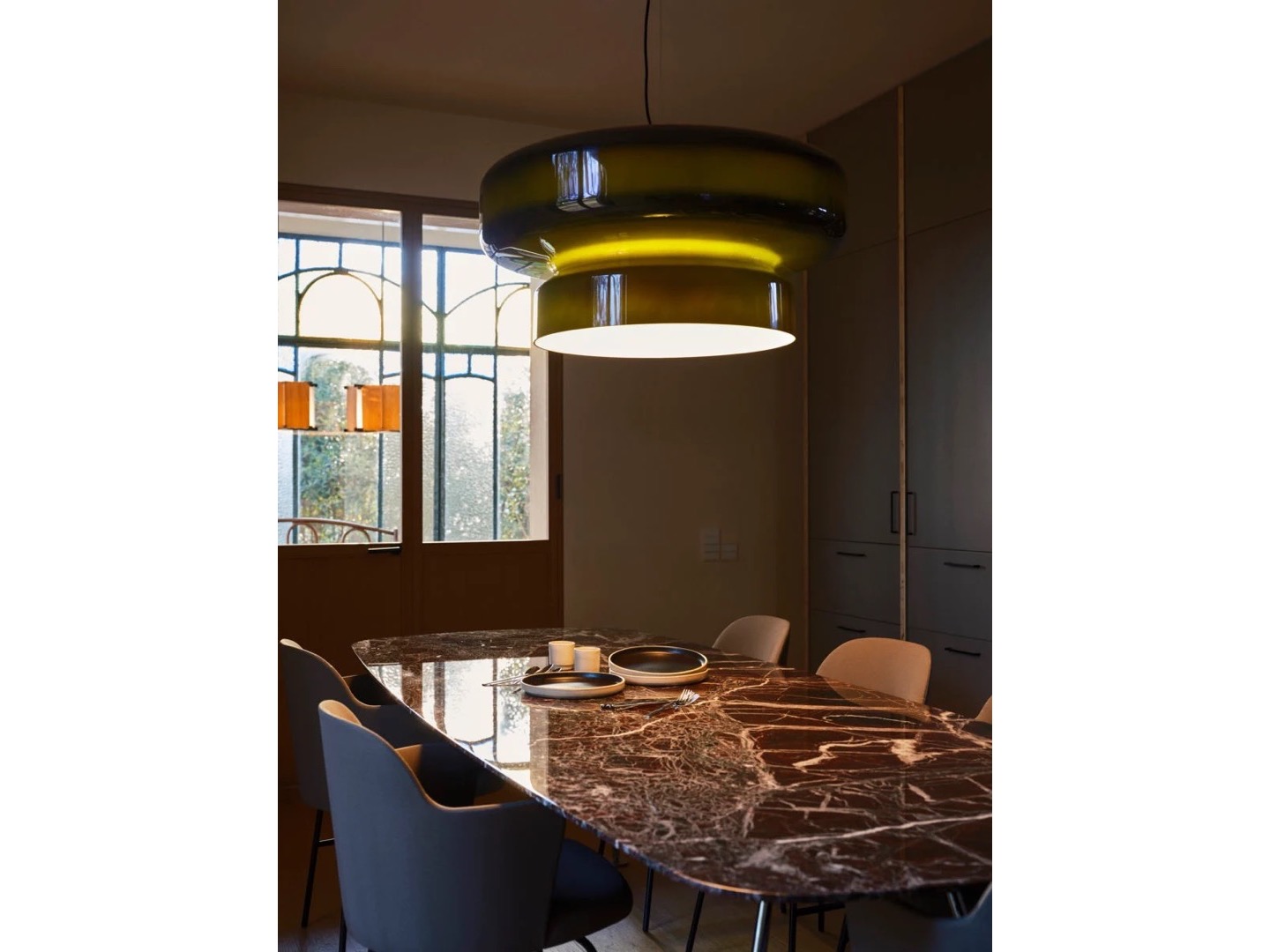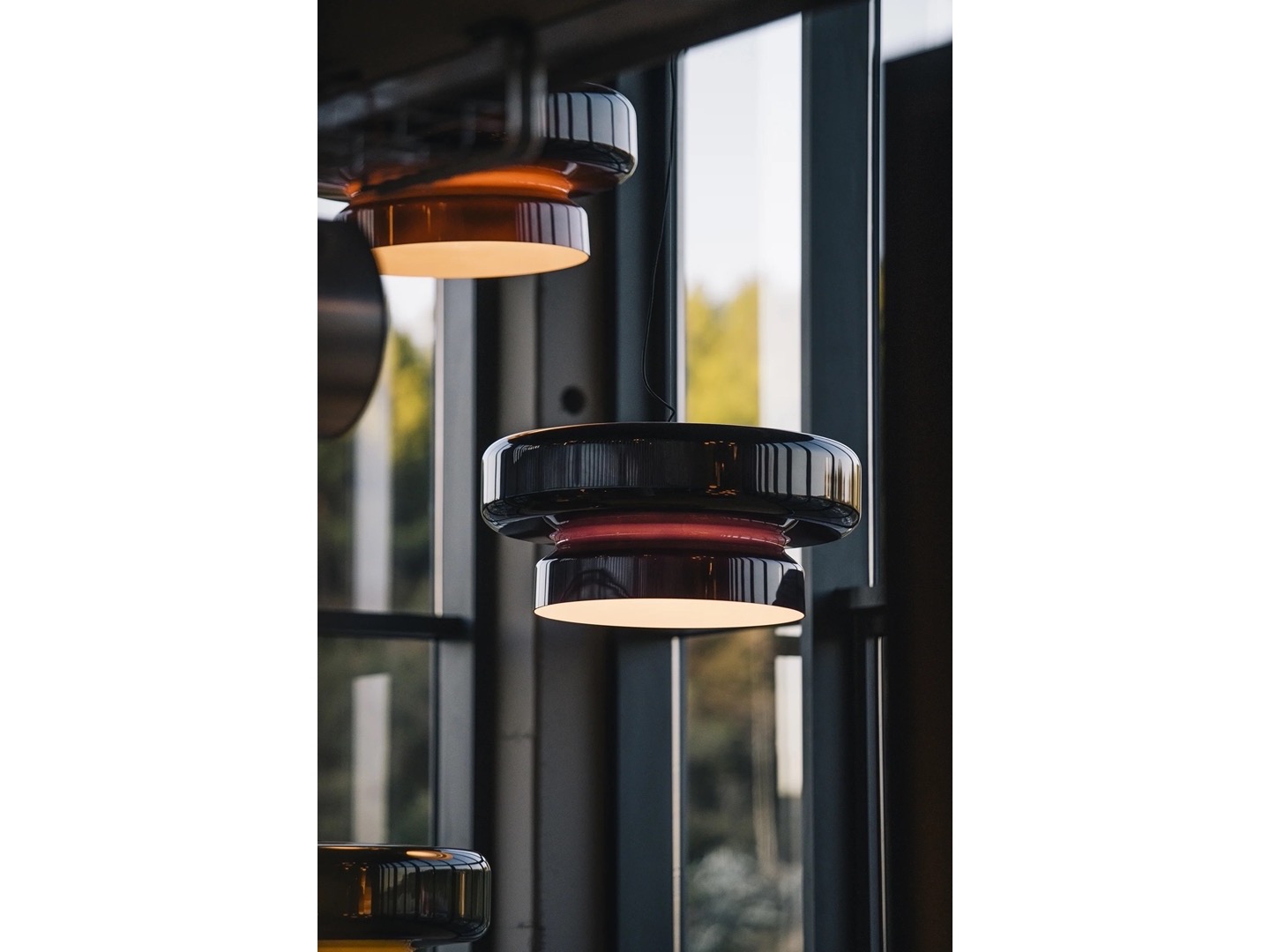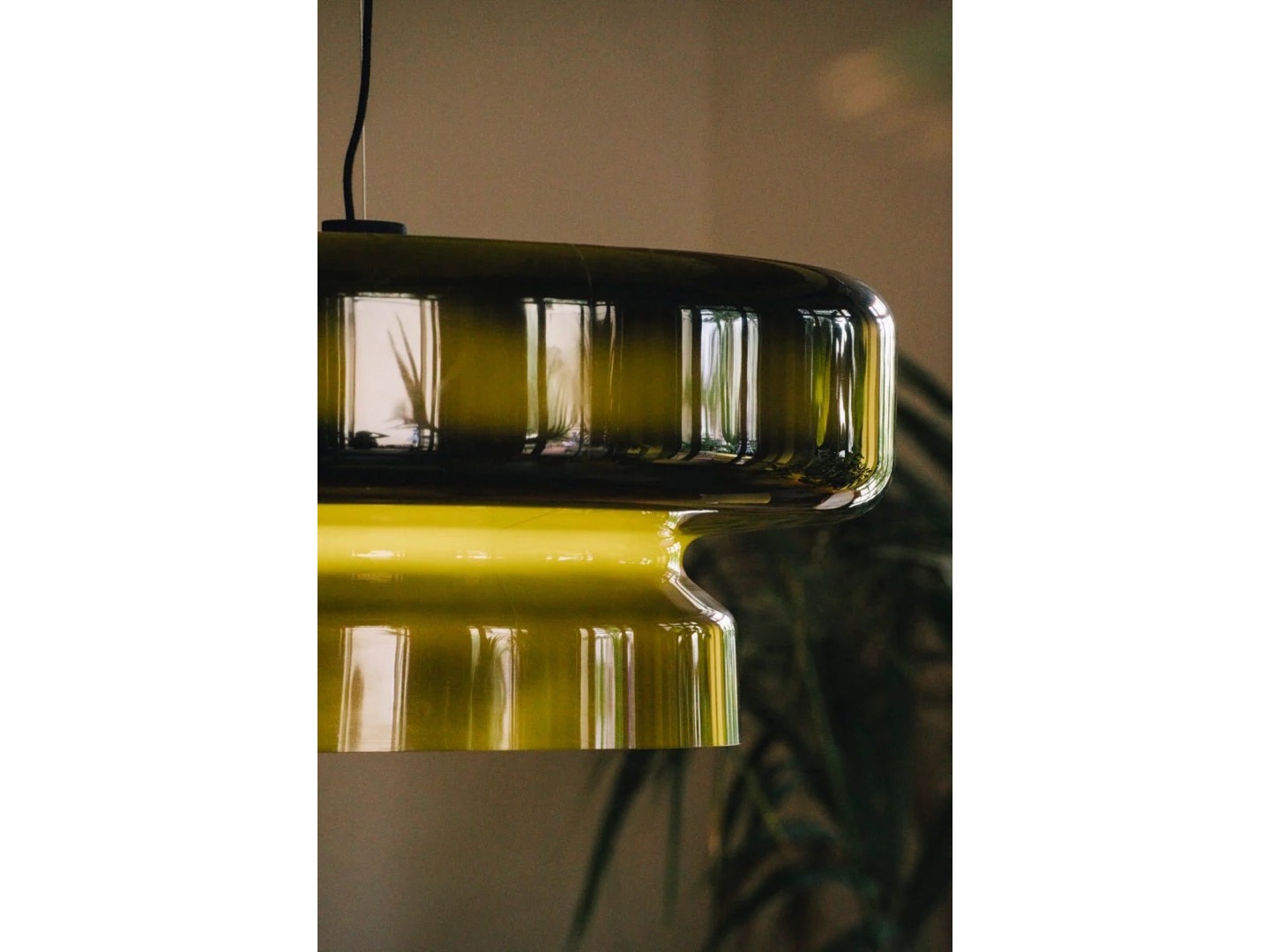 Organiczny, półprzezroczysty profil, łączy dwie objętości w jeden kształt. Pozwala to na uzyskanie dużego klosza w różnych kolorach, które nie kolidują z białym wnętrzem lampy, zapewniając nienaganne oświetlenie.