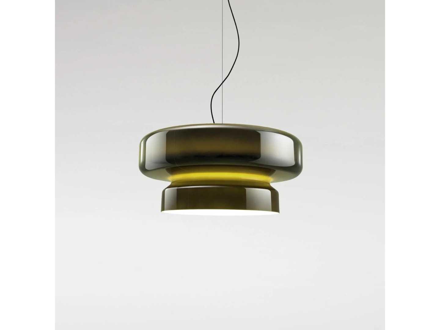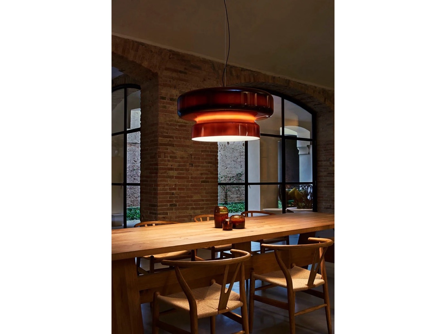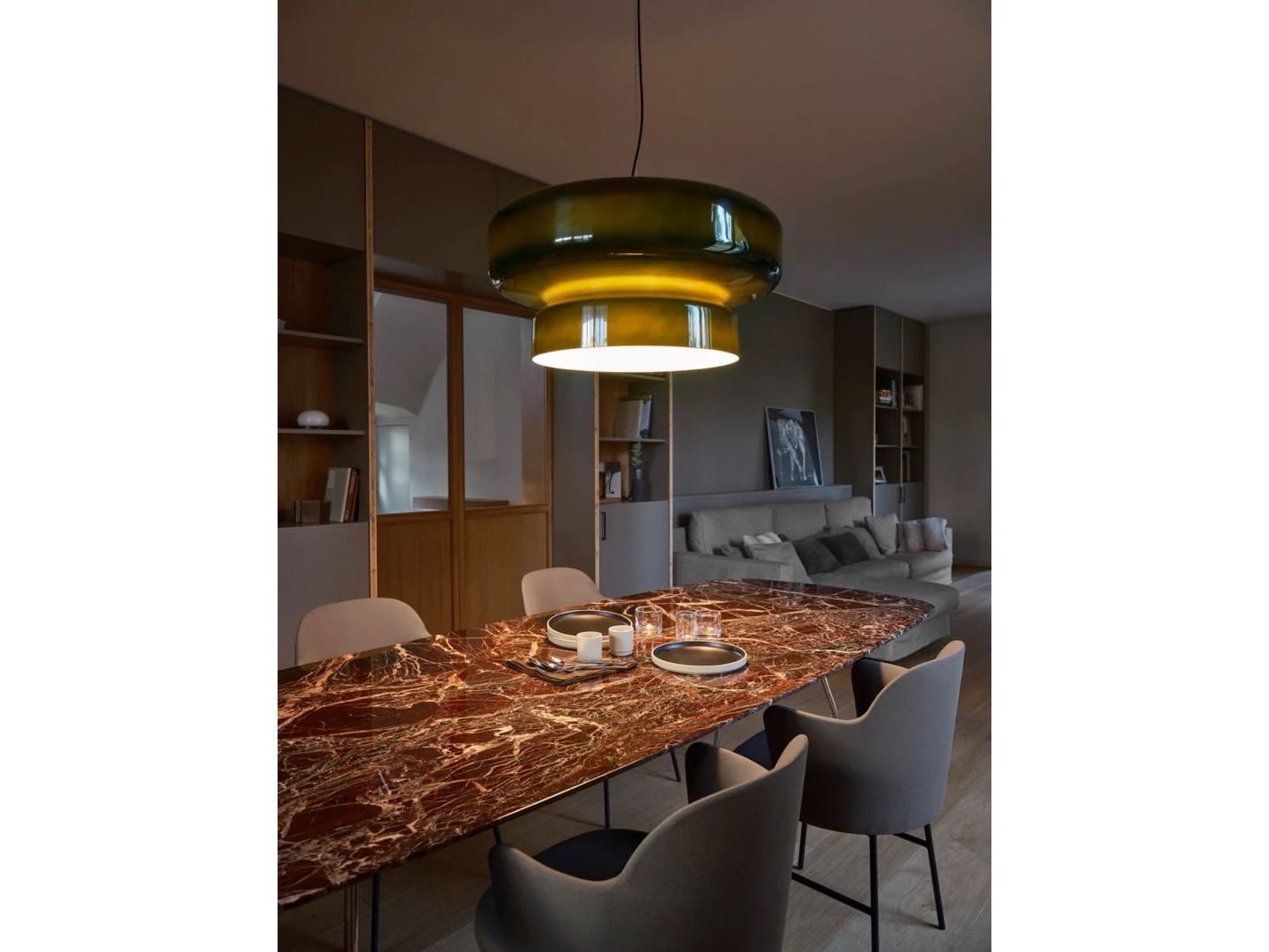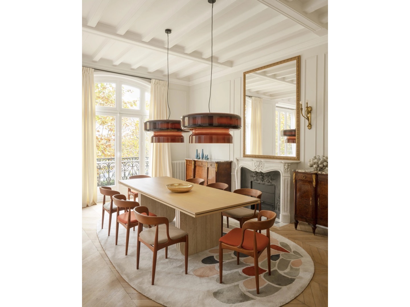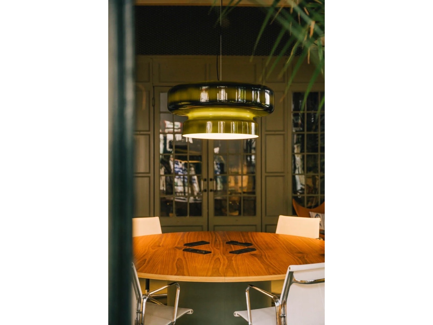 Organiczny, półprzezroczysty profil, łączy dwie objętości w jeden kształt. Pozwala to na uzyskanie dużego klosza w różnych kolorach, które nie kolidują z białym wnętrzem lampy, zapewniając nienaganne oświetlenie.