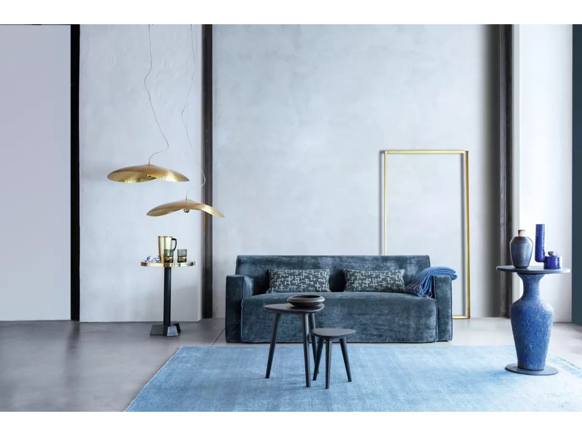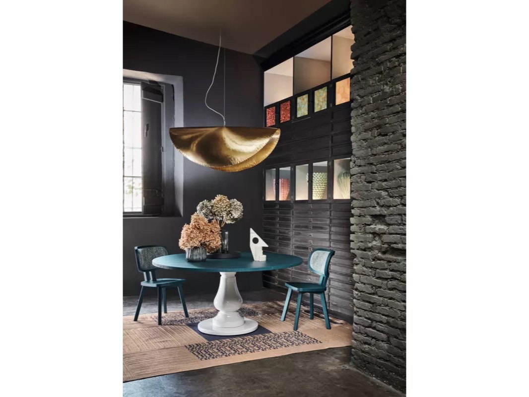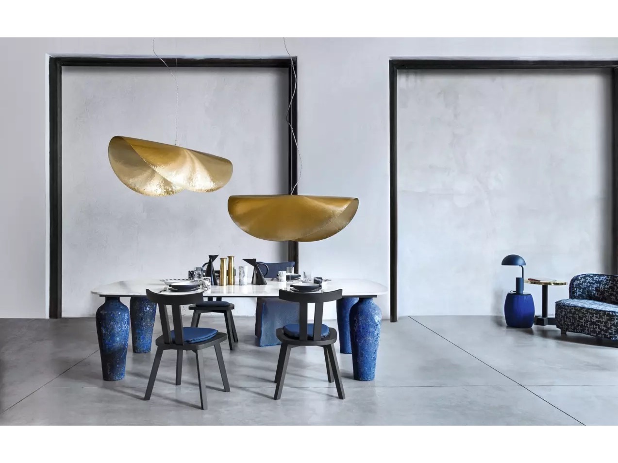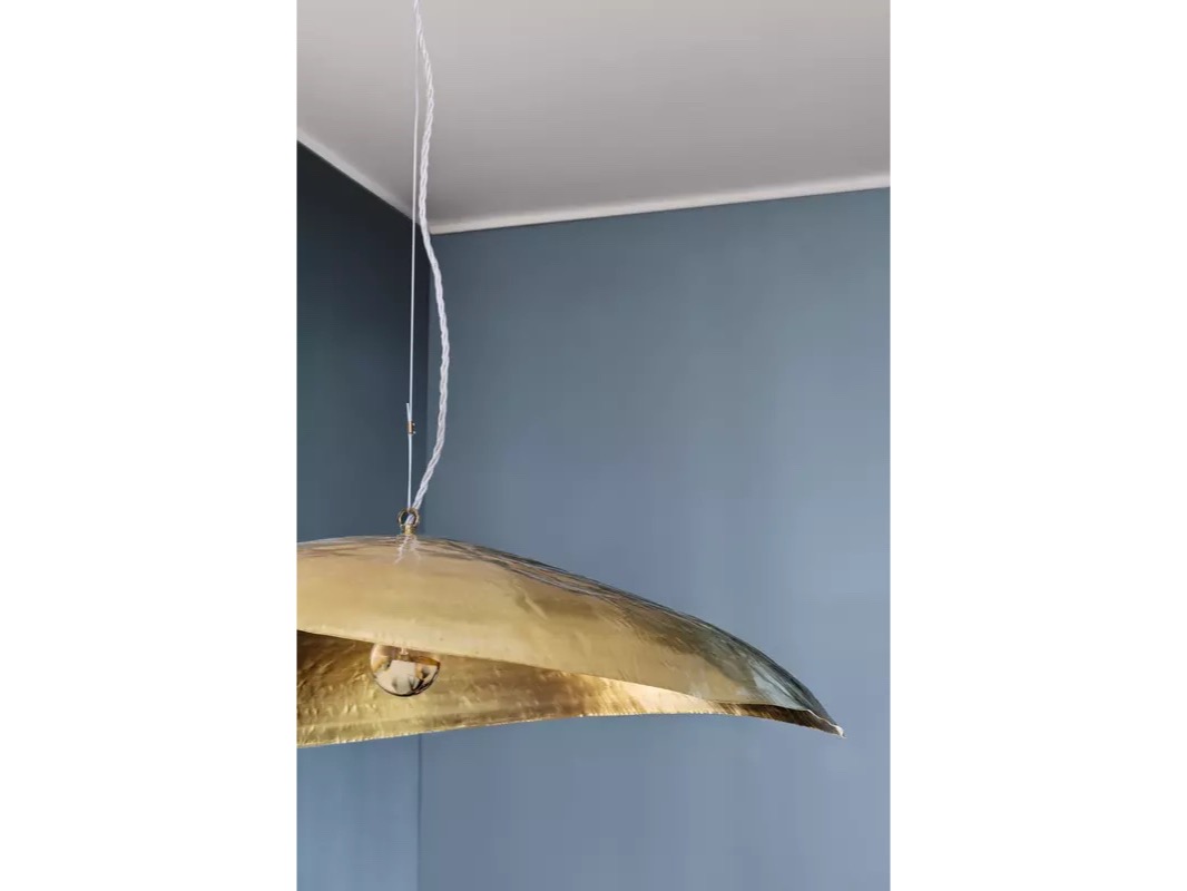 Dzięki silnemu efektowi dekoracyjnemu, kolekcja lamp BRASS wykorzystuje plastyczność mosiądzu i jego zdolność do ozdabiania wnętrz ciepłymi i złotymi refleksami światła. Lampy mają delikatny kształt: lekki mosiężny krążek z lekką krzywizną w mniejszej wersji lub mocno zaakcentowany w większej, która unosi się w powietrzu odbijając światło. Można je stosować pojedynczo lub łączyć ze sobą, aby uzyskać jeszcze bardziej filmowy efekt.
