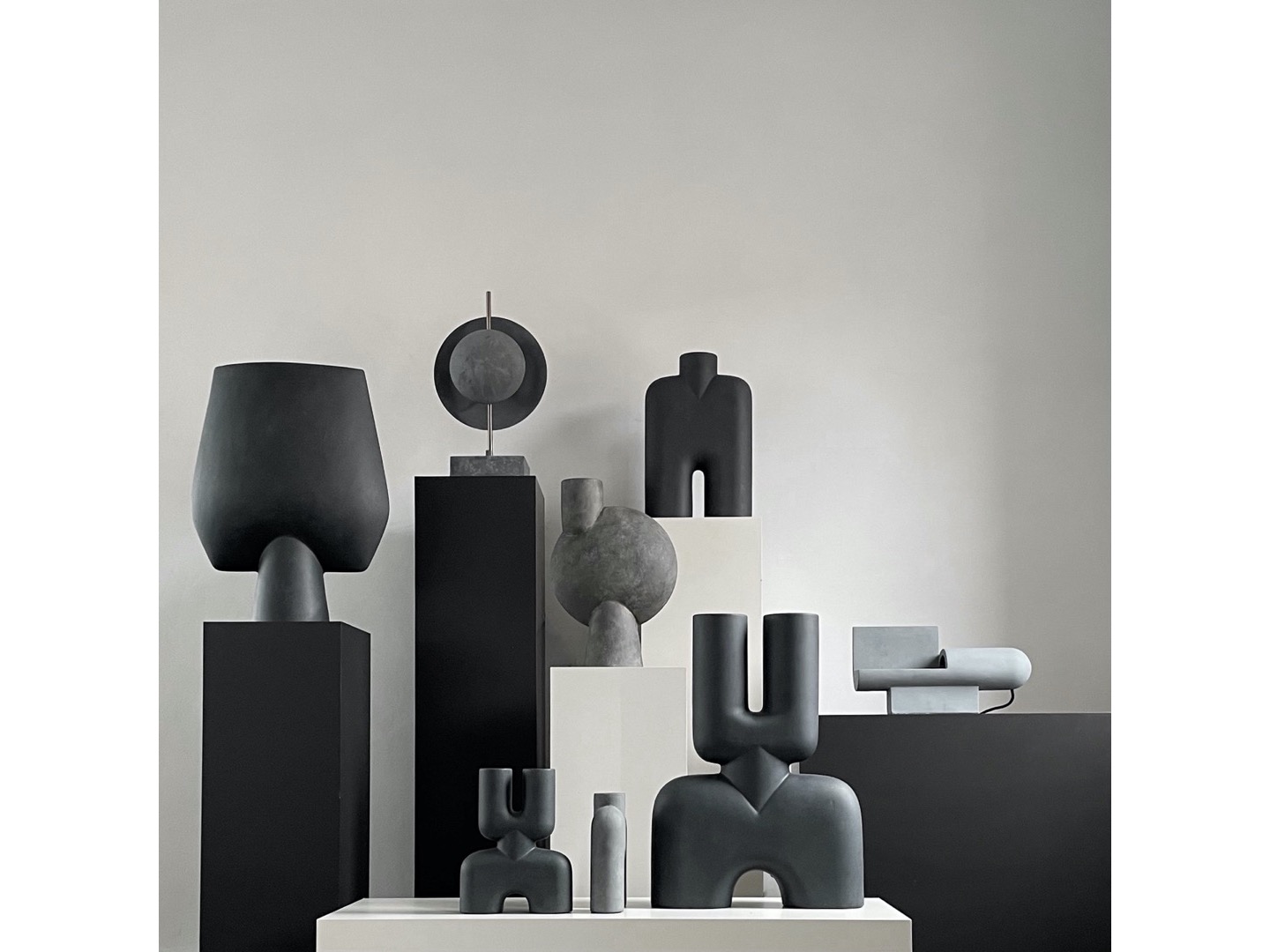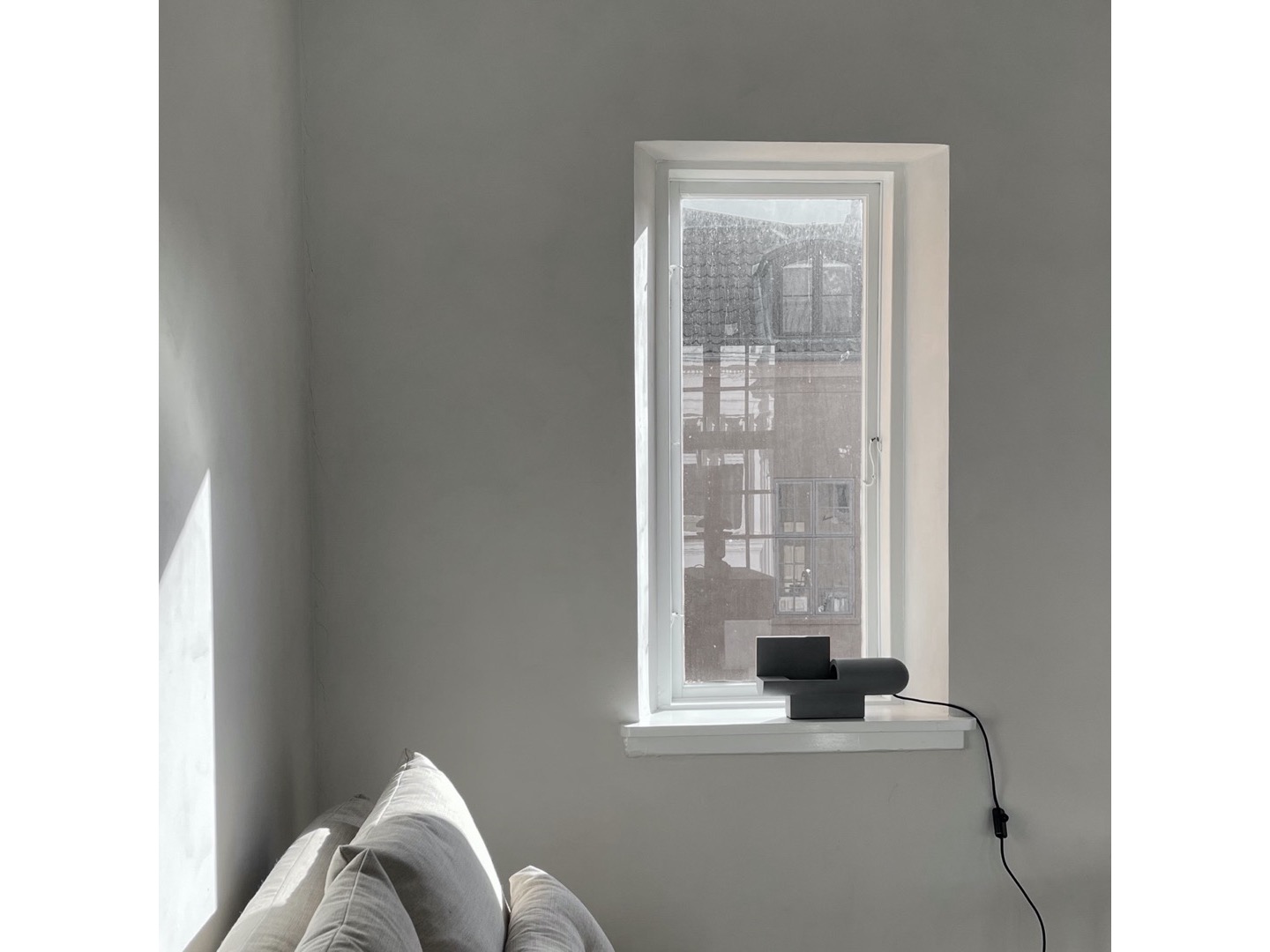 Kontrastowy materiał betonowy tworzy zniuansowaną powierzchnię, która pięknie odbija regulowane źródło światła.