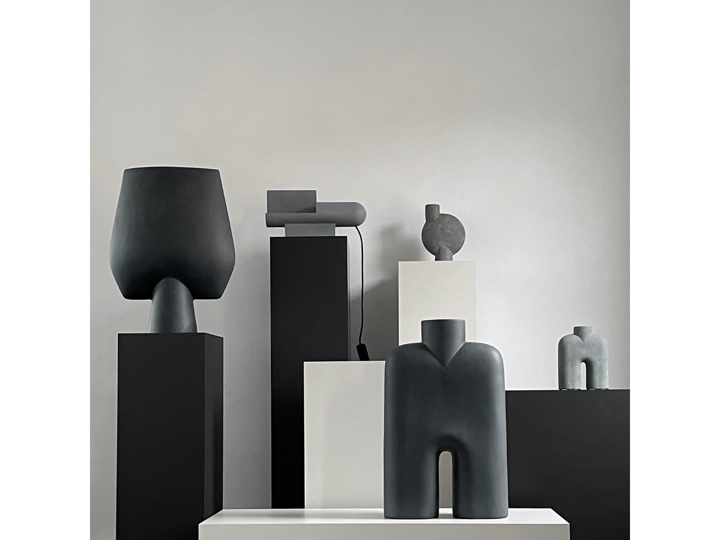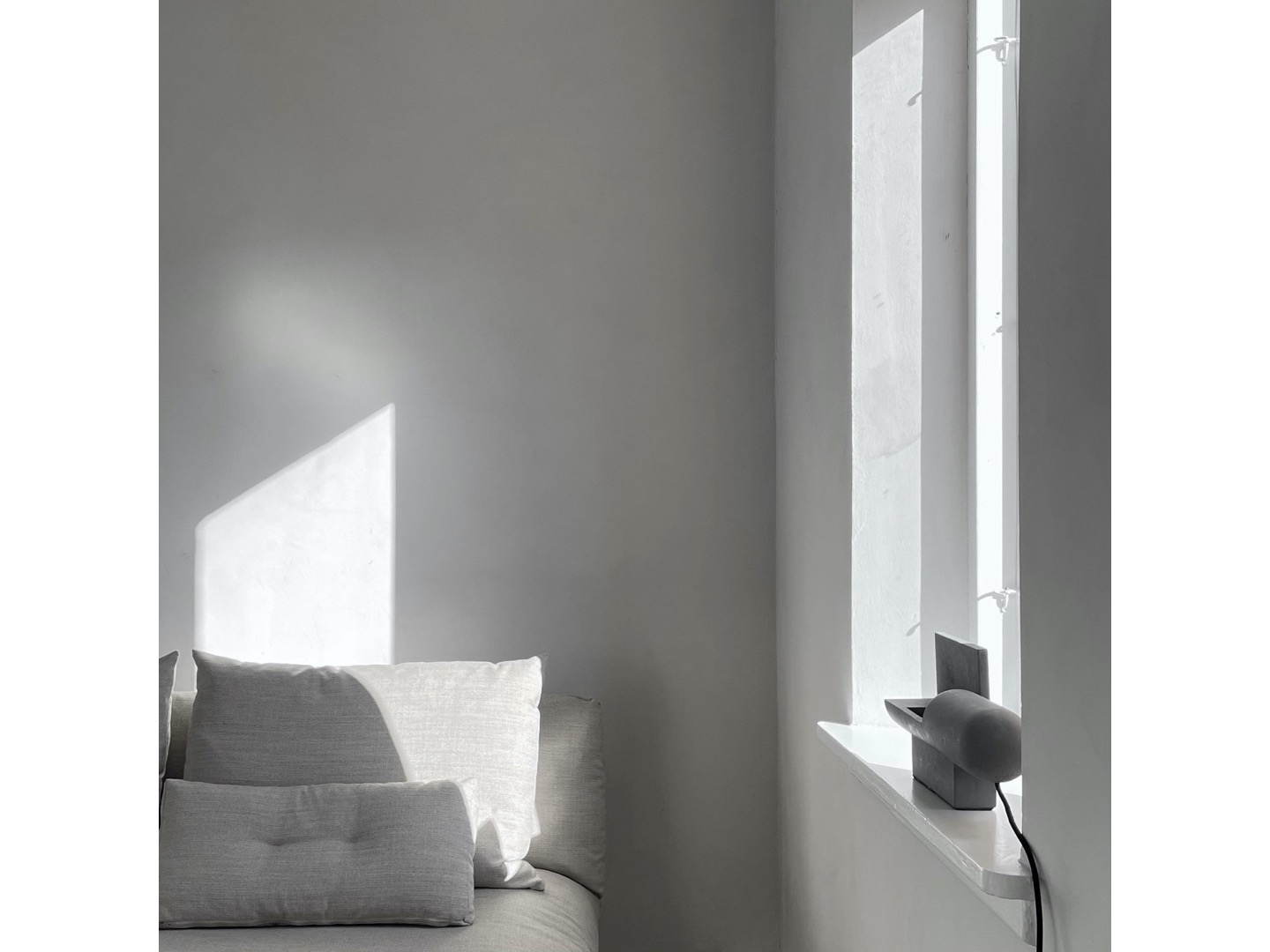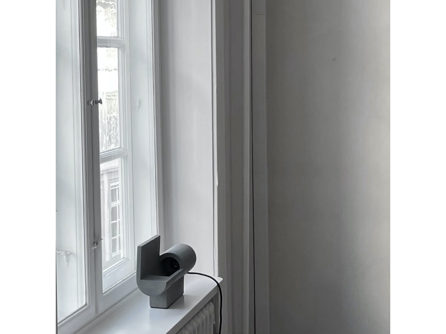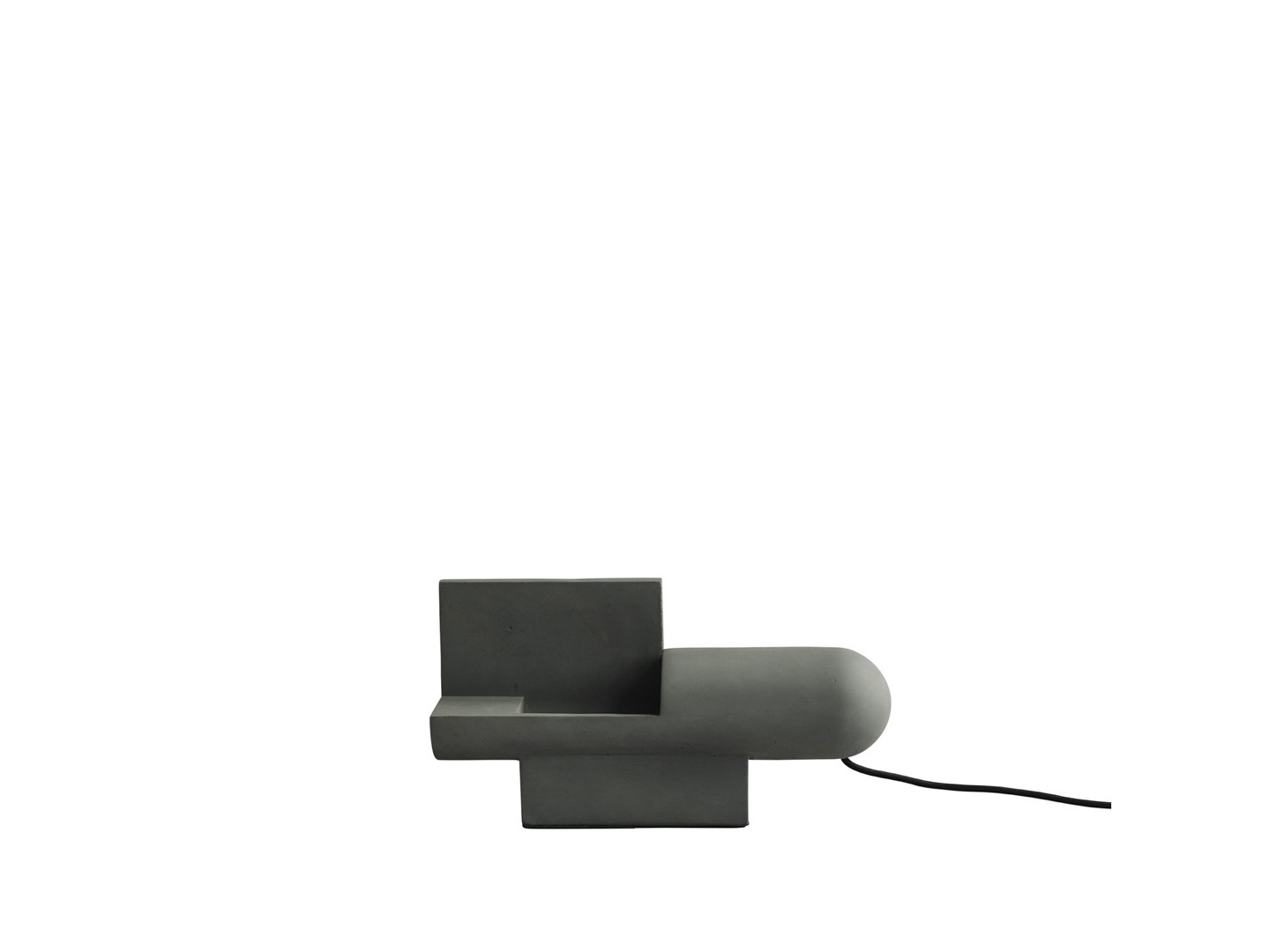 Brutalist to rzeźbiarska lampa stołowa wykonana z odlewanego lekkiego betonu z ukrytym źródłem światła.