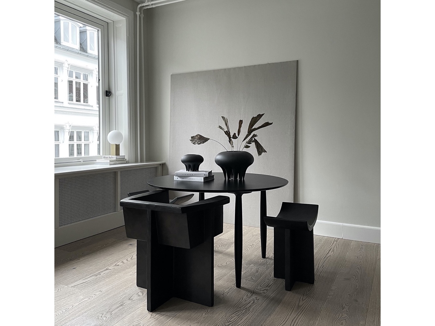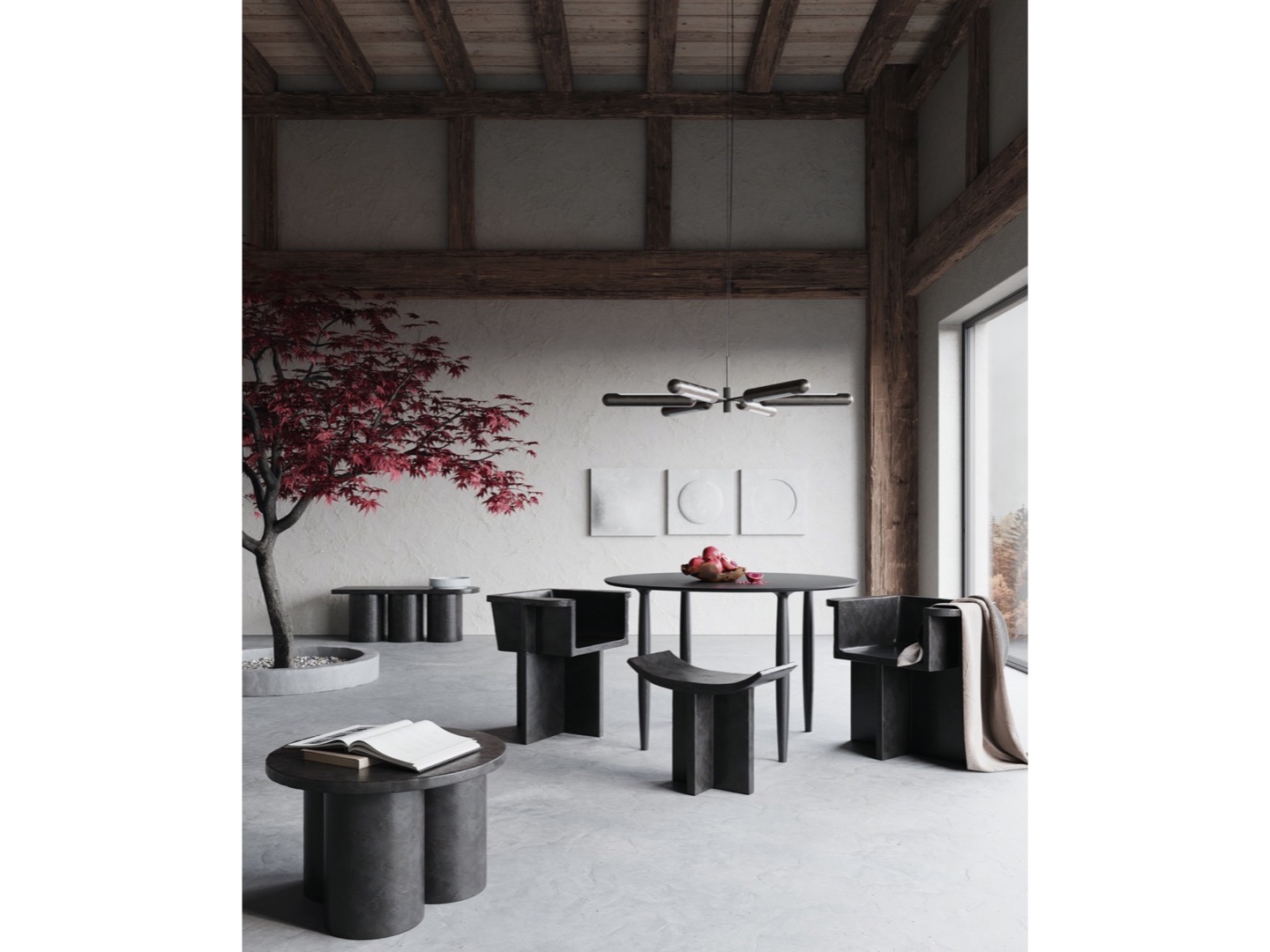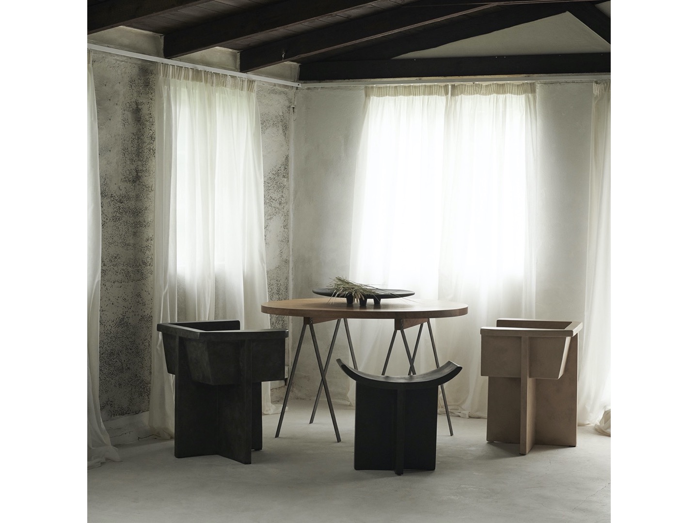 Zainspirowana ruchem architektury brutalistycznej z połowy XX wieku, kolekcja Brutus składa się z krzesła do jadalni, fotela wypoczynkowego, stołka i stolika kawowego odlanych z lekkiego betonu włóknistego, tworzącego unikalną powierzchnię zwiększającą mobilność. Każdy element jest ręcznie malowany, aby stworzyć, niepowtarzalną teksturę. Kolekcja podkreśla subtelną równowagę między ostrymi liniami architektonicznymi a nieco bardziej miękką krzywizną oparcia i podłokietnika.
