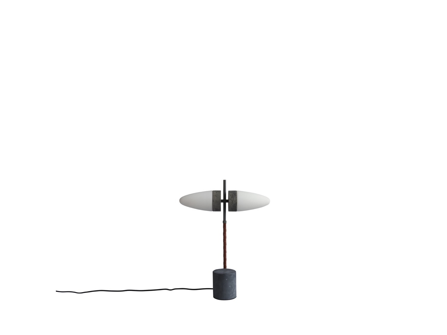 Bull składa się z nieoszlifowanej czarnej, marmurowej podstawy, uzupełnionej ramieniem lampy z oksydowanego aluminium i pokrytej skórą w kolorze koniaku.