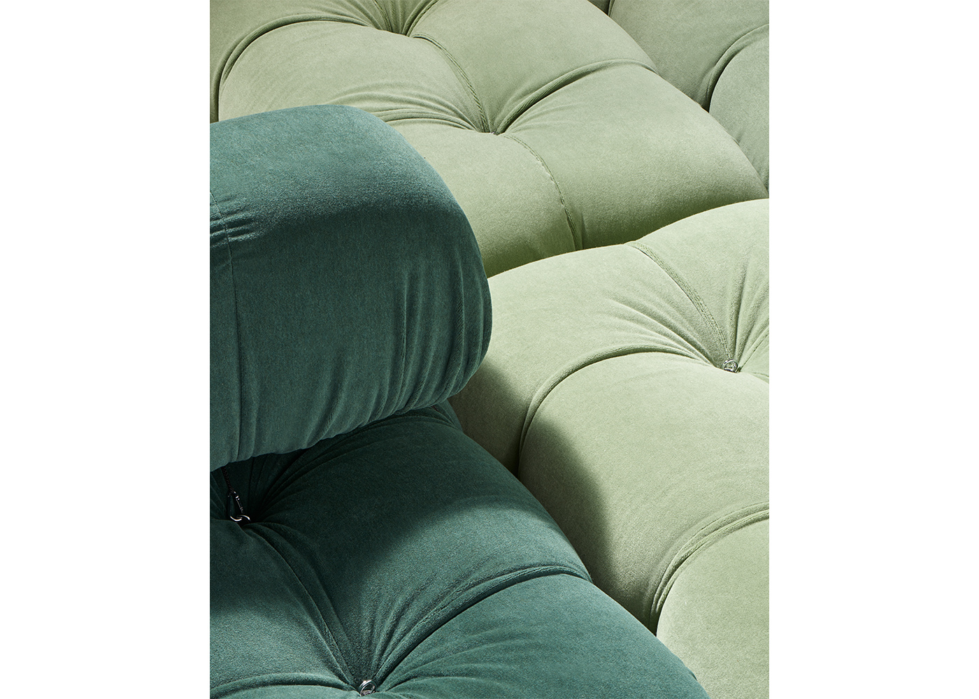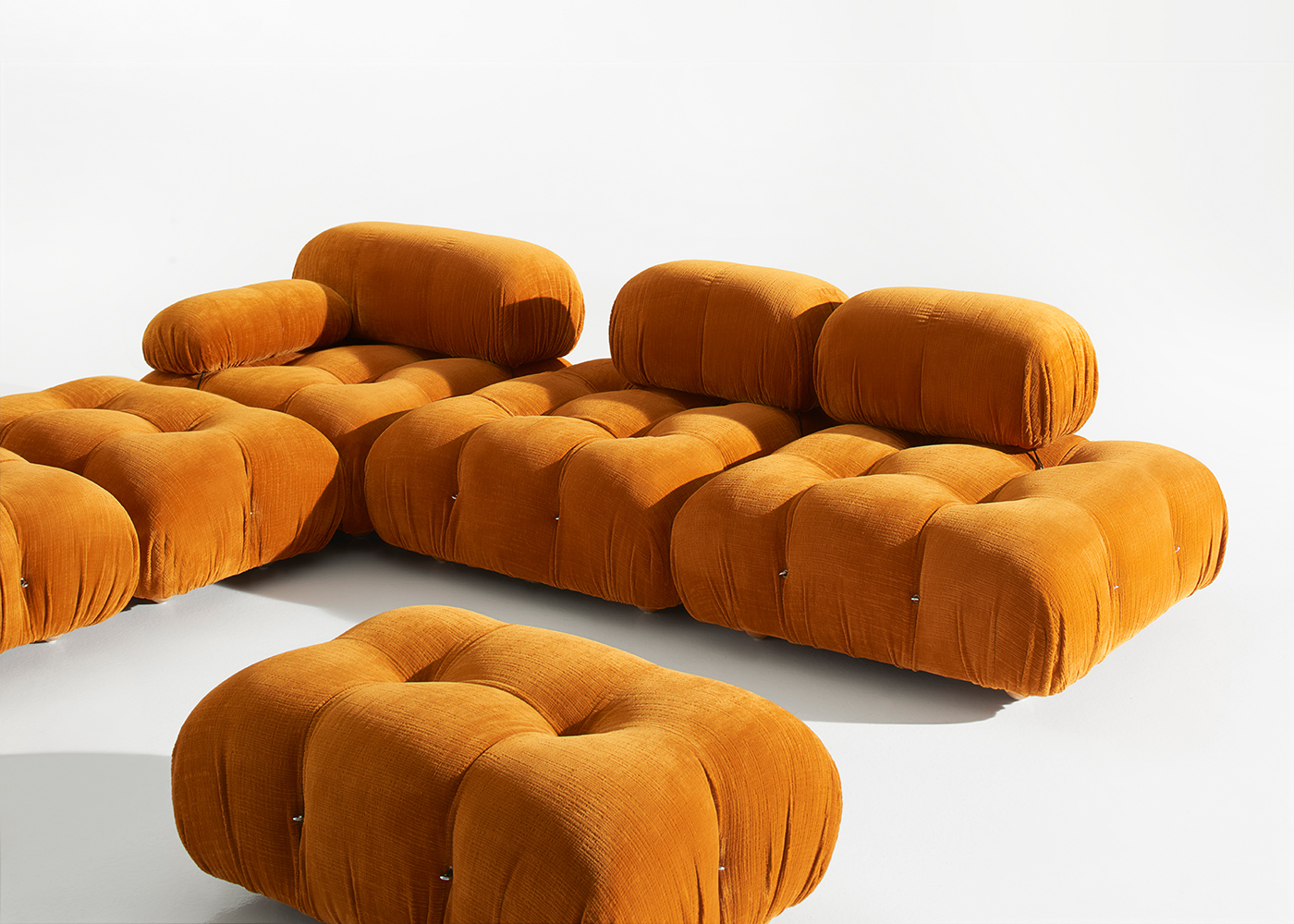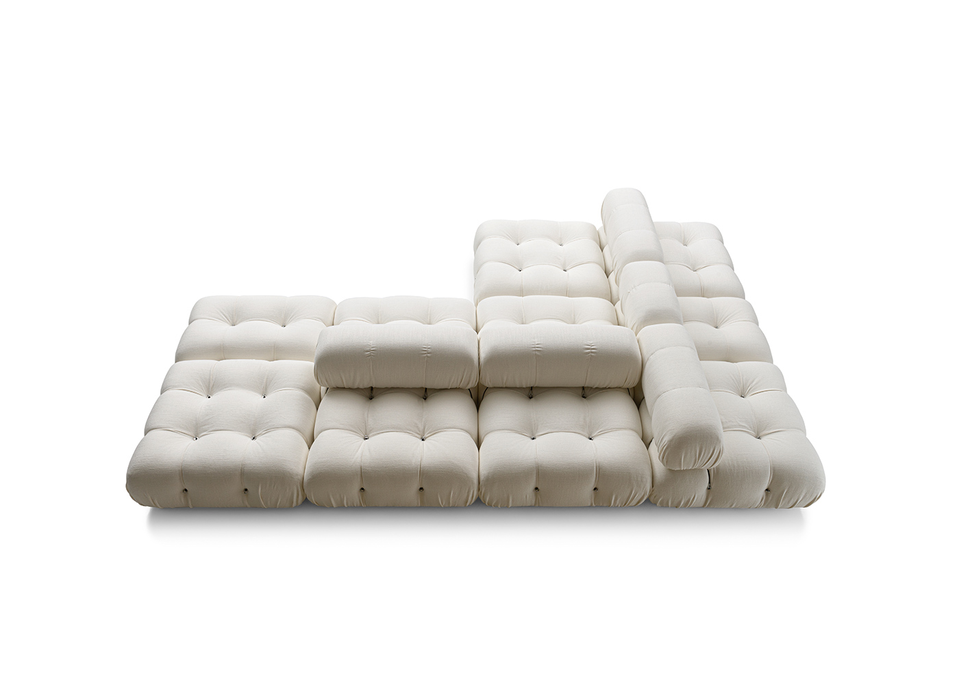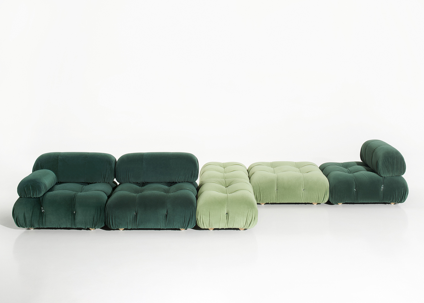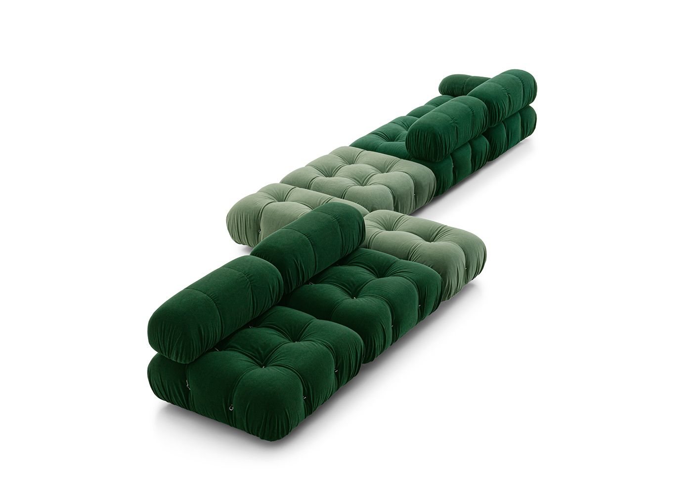 Podstawową cechą Camaleondy jest jej nieograniczona modułowość i geometryczny wzór, który pozwala każdemu elementowi stać się osobną częścią. Dzięki podpinaniu i odczepianiu siedzeń, oparć i podłokietników możesz cieszyć się zmianą aranżacji przestrzeni tyle razy, ile chcesz. Pomysł, który jest bliski Mario Belliniemu: „Ze wszystkich obiektów, które zaprojektowałem, Camaleonda jest chyba najlepsza pod względem poczucia wolności. Istnieje nieskończona liczba możliwych konfiguracji ”. Wyściółka została gruntownie zaktualizowana przez Centrum Badań i Rozwoju B&B Italia, dzięki czemu jest jeszcze wygodniejsza niż w wersji oryginalnej. W ten sposób potwierdza się magiczna równowaga między rygorystyczną geometrią kwadratu a przyjazną okrągłością wyściółki, co dodatkowo podkreśla elastyczność, która charakteryzuję wiele projektów Mario Belliniego.