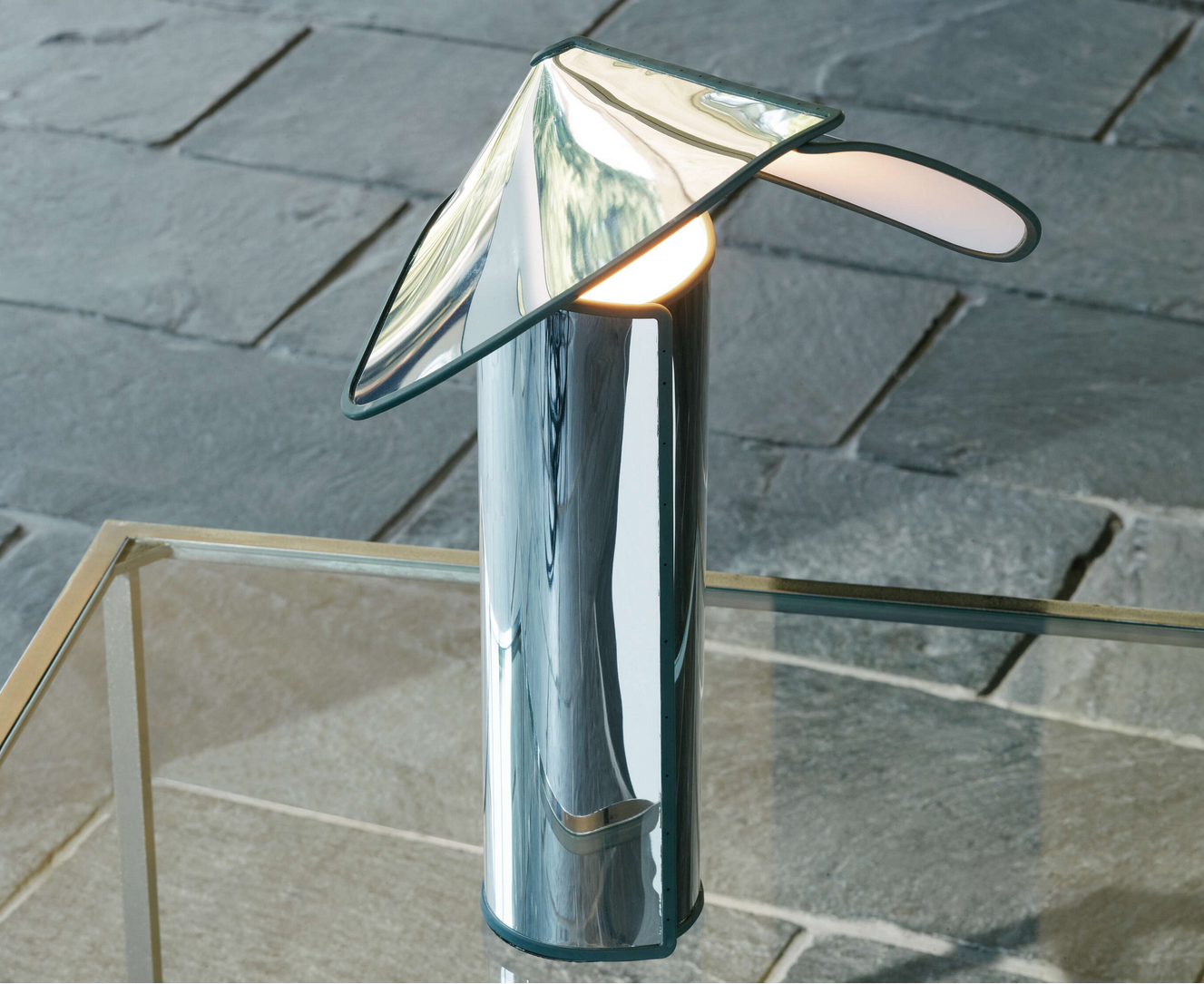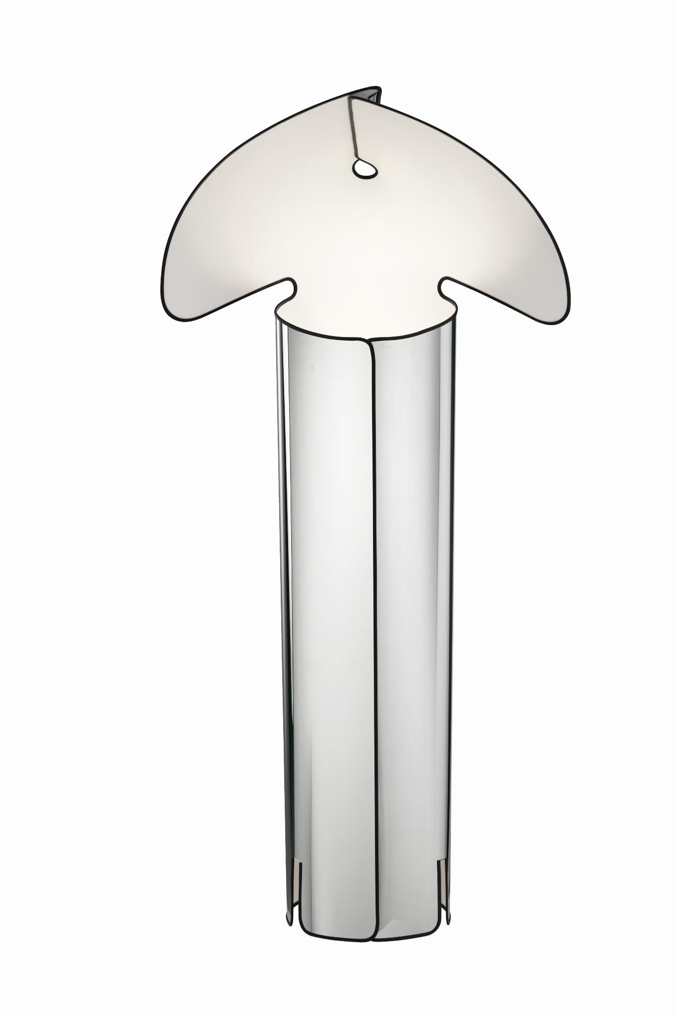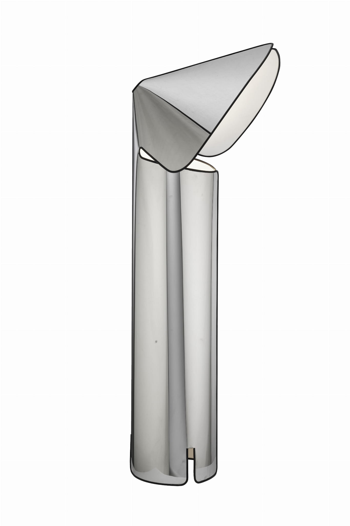Lampa stołowa składająca się z odblaskowego korpusu z aluminium w 3 wariantach kolorystycznych, wykończonego od wewnątrz nieprzezroczystą białą folią z tworzywa sztucznego, składanego i zamykanego za pomocą haczyków przynitowanych do blachy. Wzdłuż całego profilu korpusu biegnie kolorowa uszczelka z formowanego tpu. Wewnętrzna podstawa z wytłaczanego aluminium jest przymocowana do korpusu w celu zapewnienia stabilności, a także podtrzymuje gniazdo żarówki. Kabel zasilający ma przełącznik ściemniania do regulacji jasności. Użyteczna długość kabla: 1,9 m.