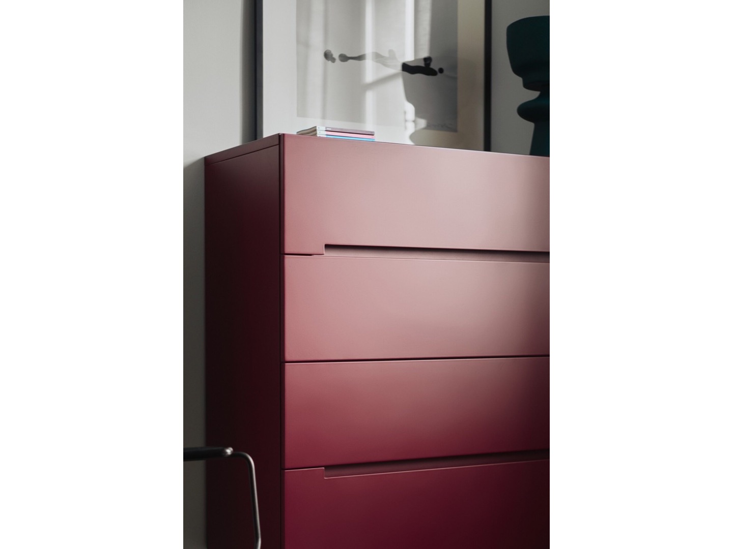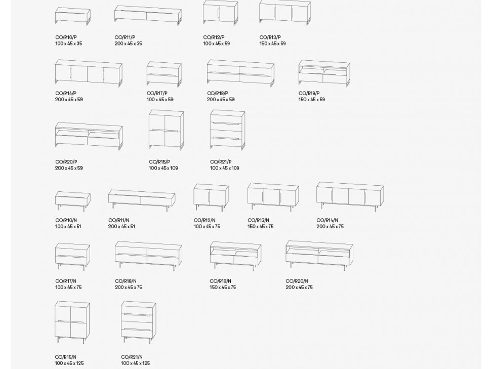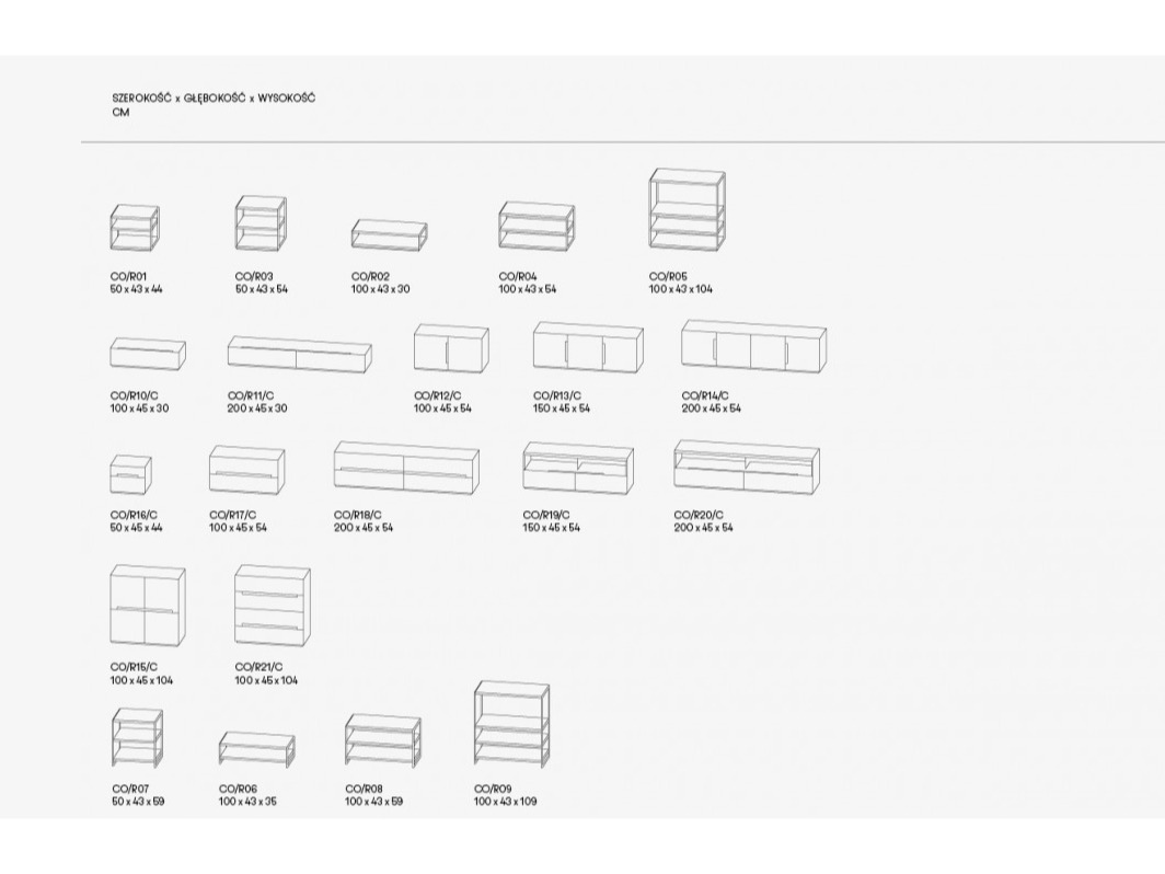 Moduły dostępne są w szerokiej gamie kolorów lakierów i oklein drewnianych. Mogą być ustawione na nóżkach, płozach lub cokole.