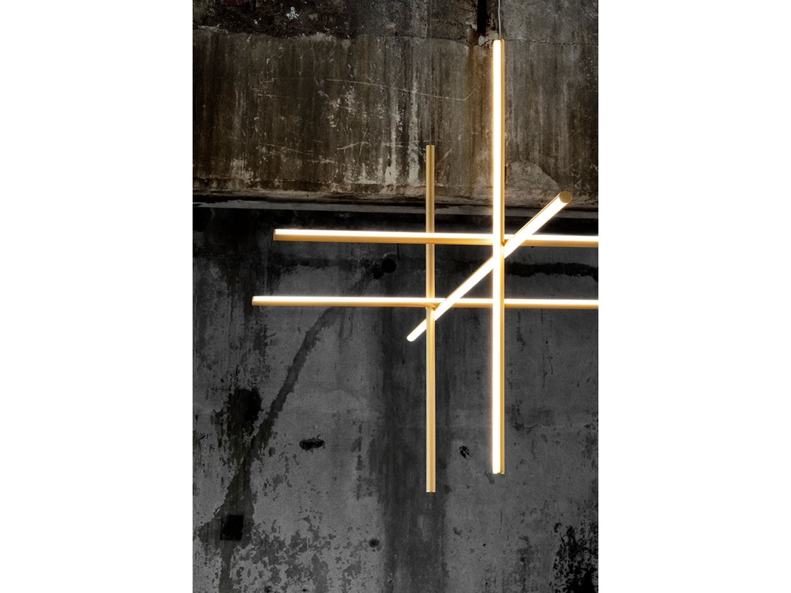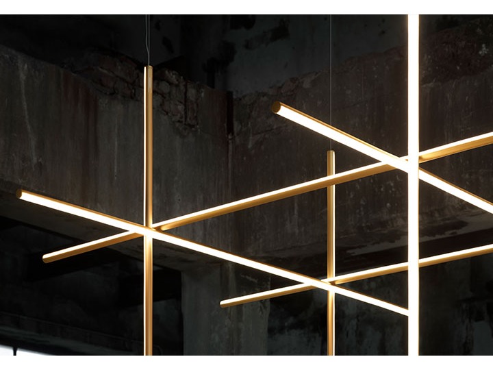 Coordinates Suspension 4 to system oświetlenia składający się z poziomych i pionowych opraw rozmieszczonych w jasnej siatce o różnych kształtach i złożoności, dający rozproszone światło.