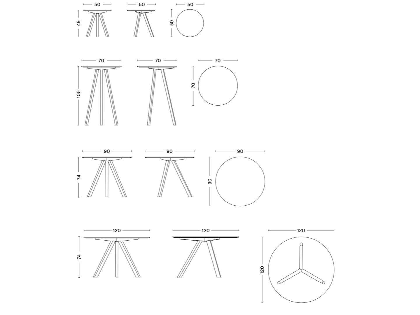 Stół: sr. 90 cmm h 74 cm, śr. 120 cm h 74 cm