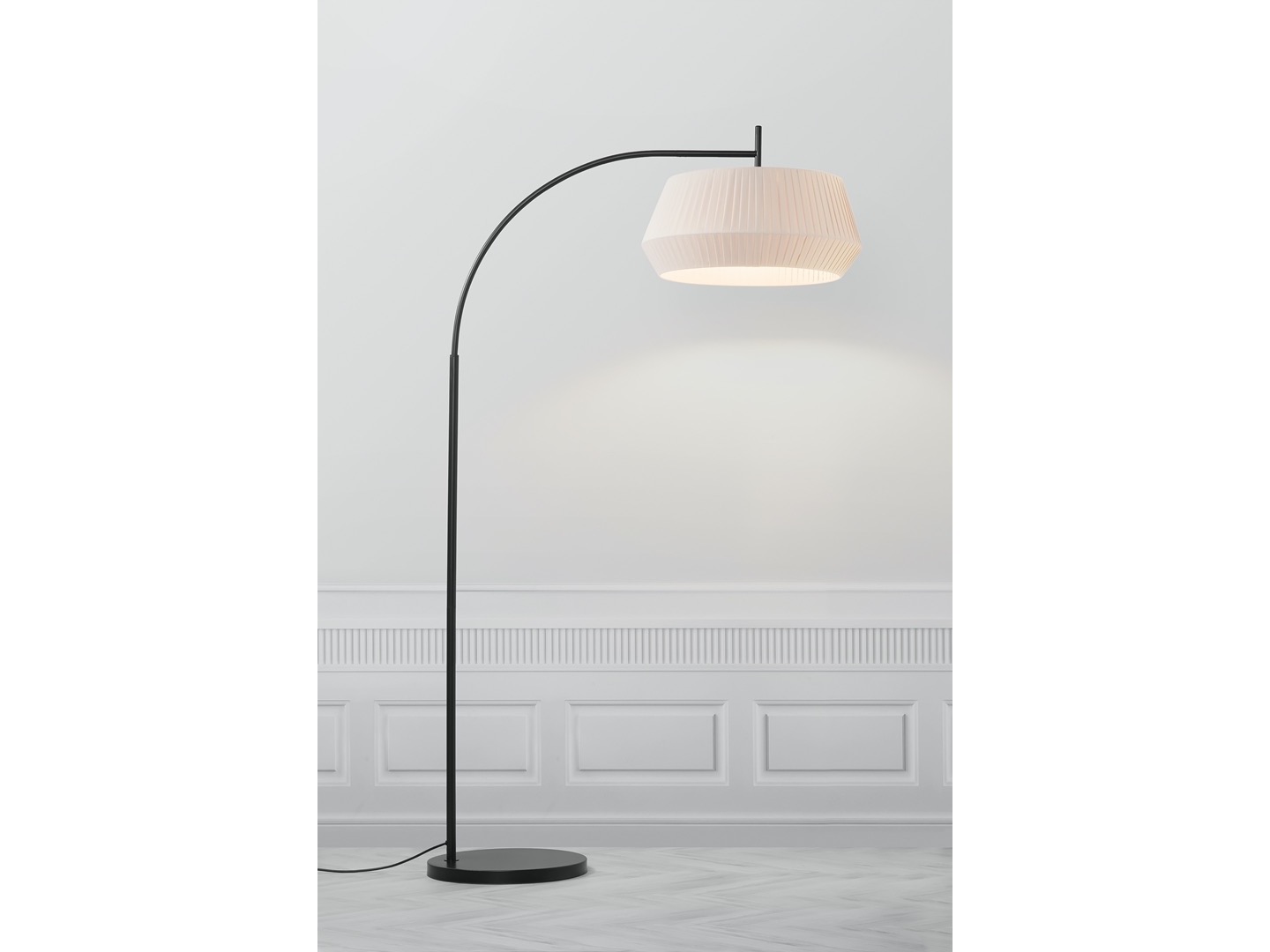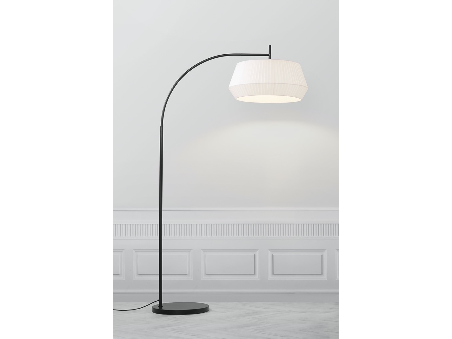 Seria Dicte jest wykonana z miękkiej, ręcznie tkanej tkaniny, która dodaje przytulności i domowej atmosfery każdemu pomieszczeniu. Duży klosz z plisowanej bawełny zapewnia miękkie i rozproszone światło, które jest elegancko zawieszone na zakrzywionej podstawie lampy - idealne do pochylenia się nad fotelem lub stolikiem kawowym.