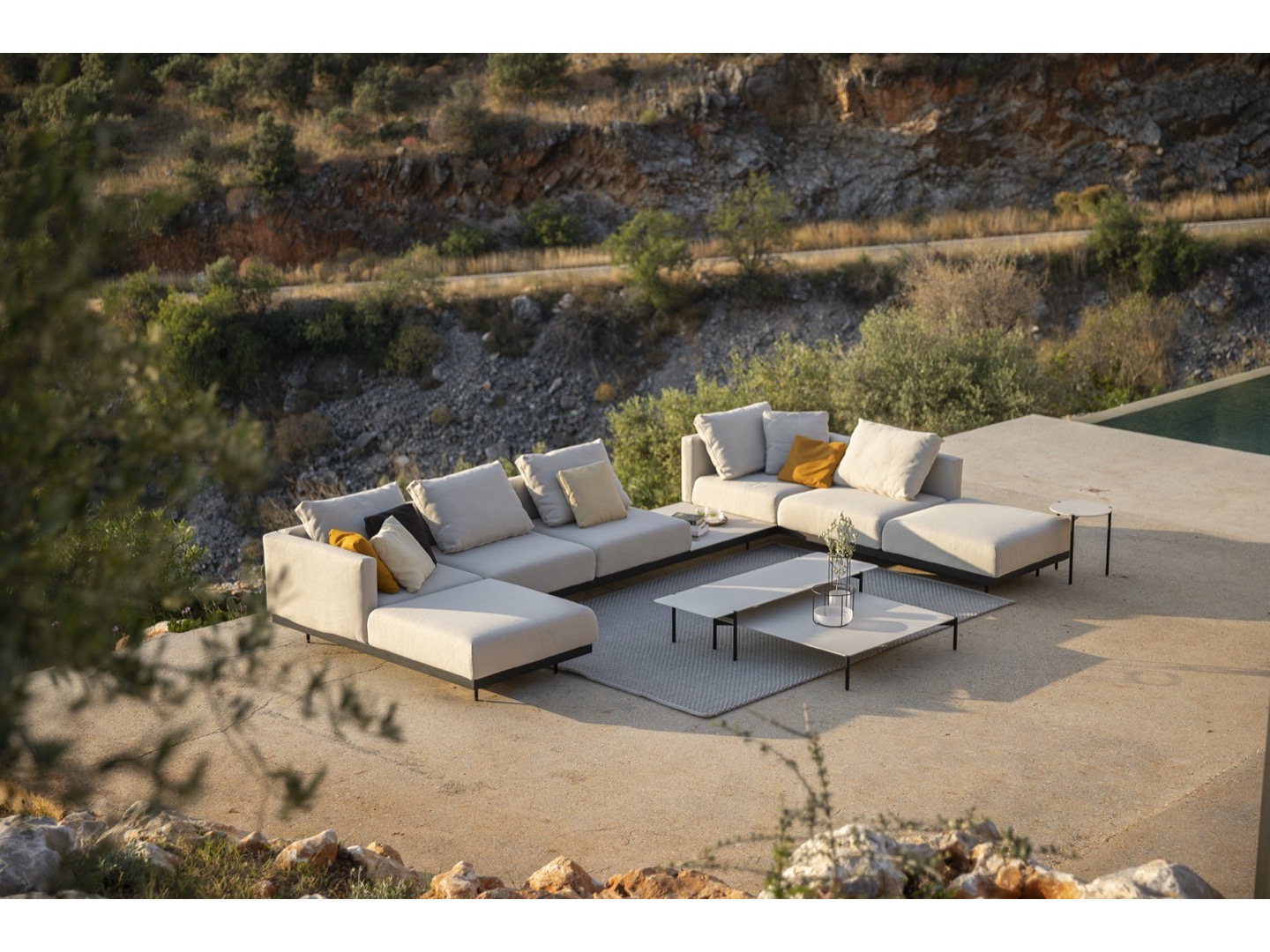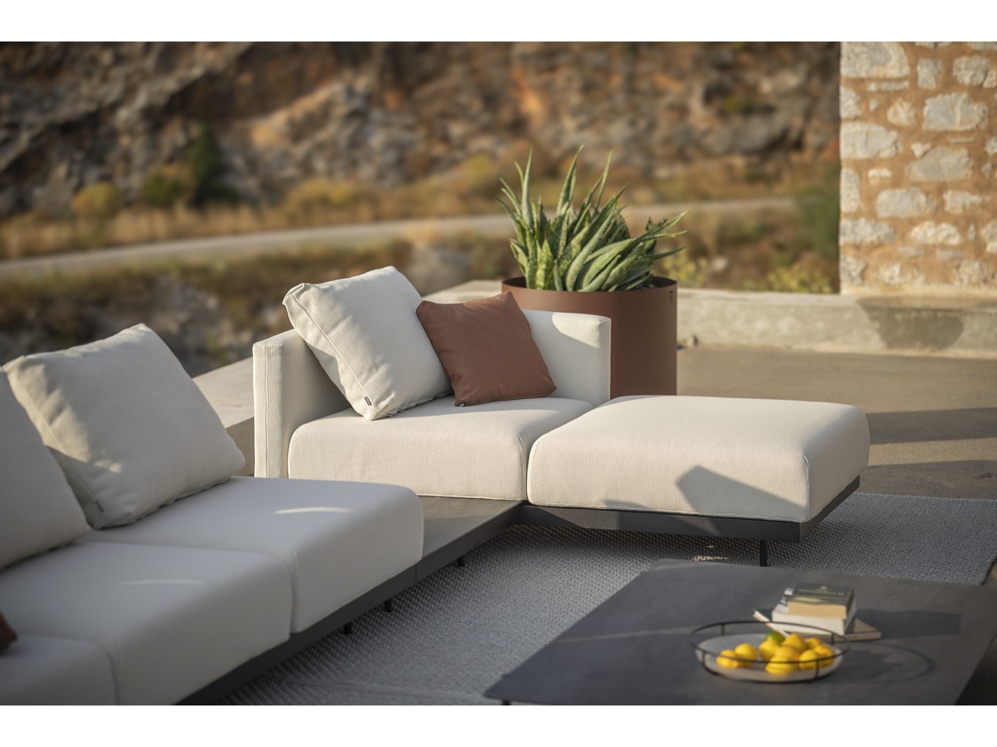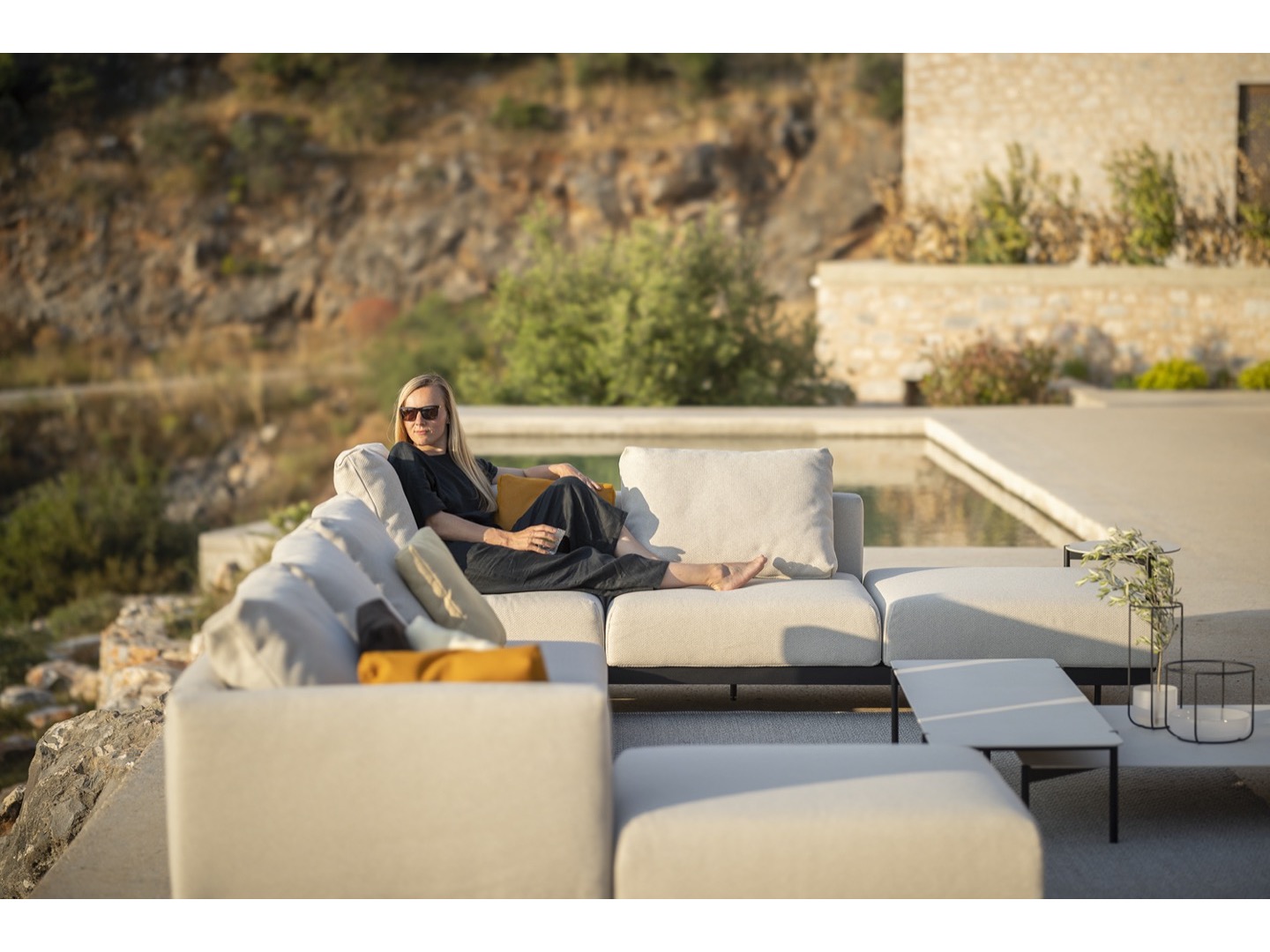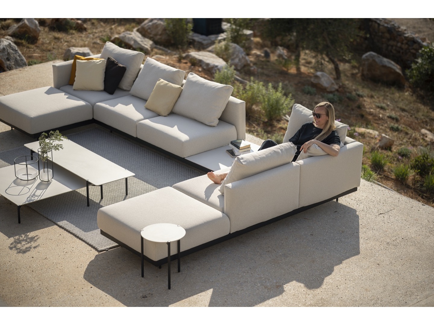 Sofa wykonana jest z wysokiej jakości materiałów odpornych na warunki atmosferyczne. Dzięki eleganckiej ramie ze stali nierdzewnej i wygodnym wyściełanym poduszkom oferuje idealne połączenie komfortu, wzornictwa i trwałości. Do sofy dołączono szereg dodatkowych stolików, które można zintegrować, dzięki czemu Dongo jest wszechstronnym rozwiązaniem dla każdego, kto szuka pięknej i funkcjonalnej przestrzeni na zewnątrz.