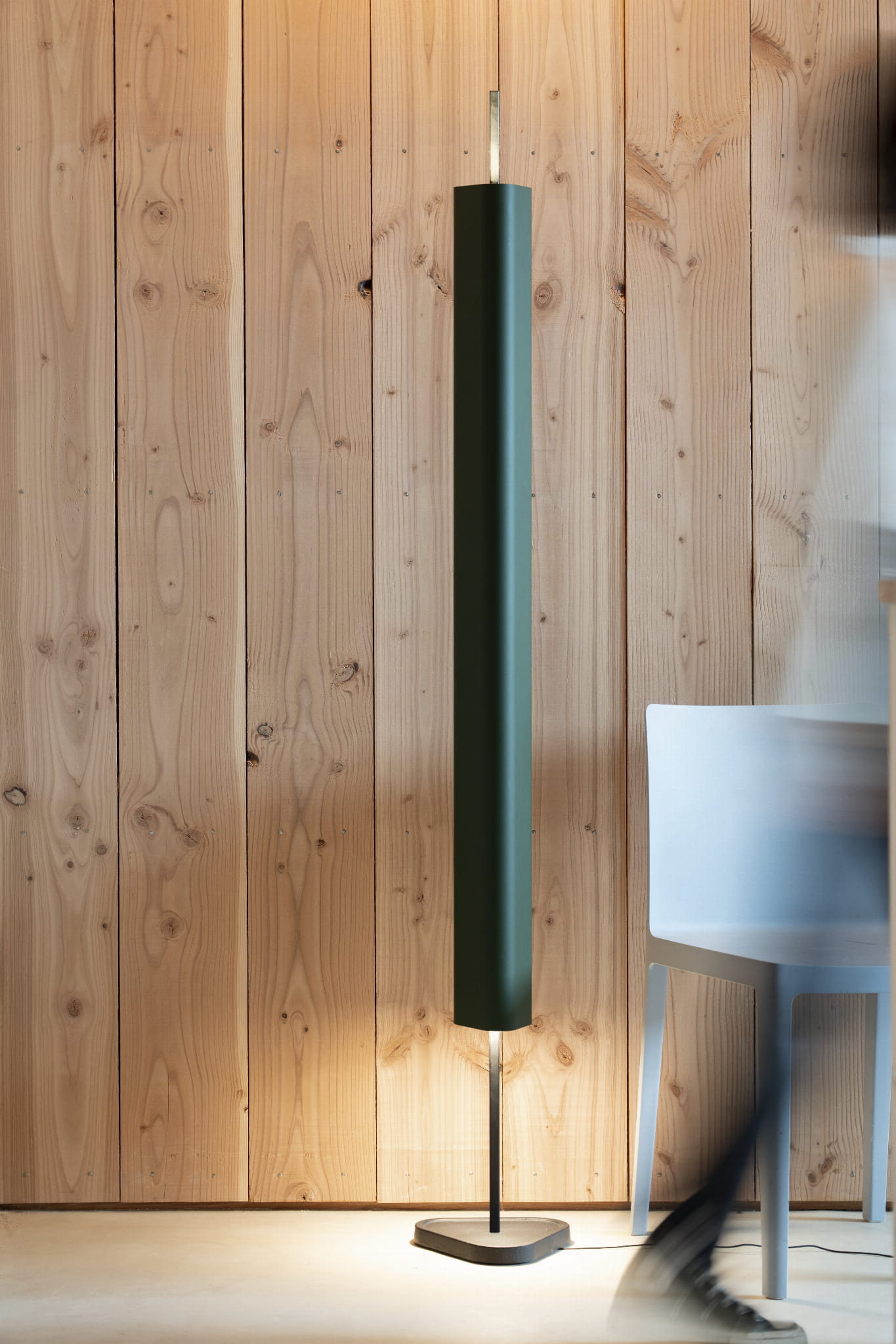 Emi Floor to lampa podłogowa o niskim poziomie olśnienia, wyposażona w pojemnościowe sensory Touch Dimming umieszczone na górze centralnego stela do niezależnej kontroli oświetlenia Up&Down, łącząca różne niewidoczne źródła światła w celu stworzenia paradoksalnego doświadczenia: narodziny światła z cienia. Konstrukcja z aluminium i PMMA.
