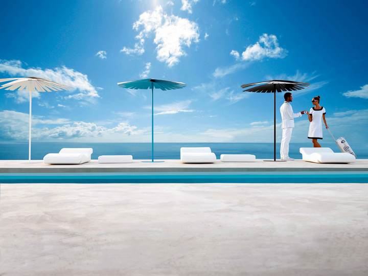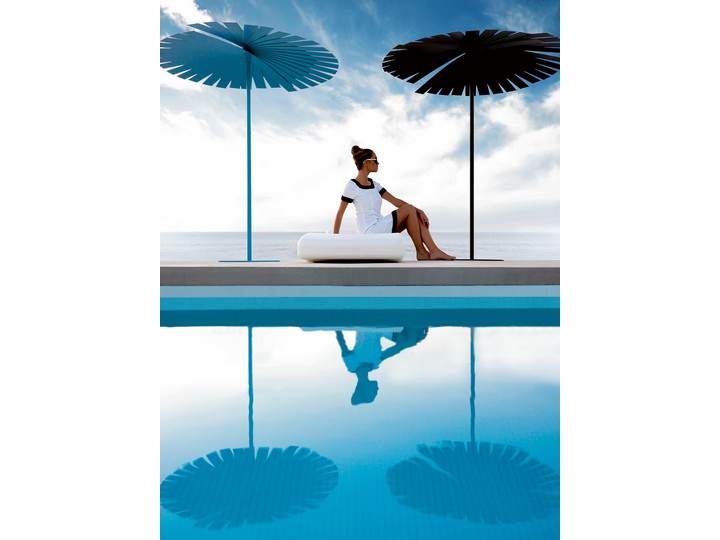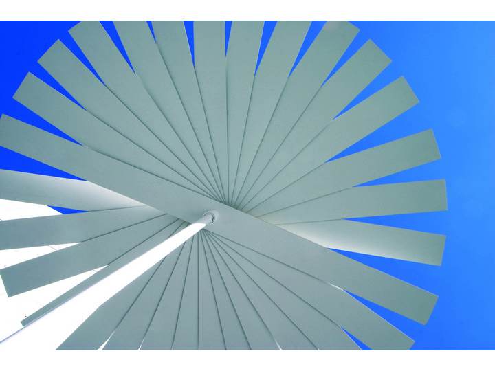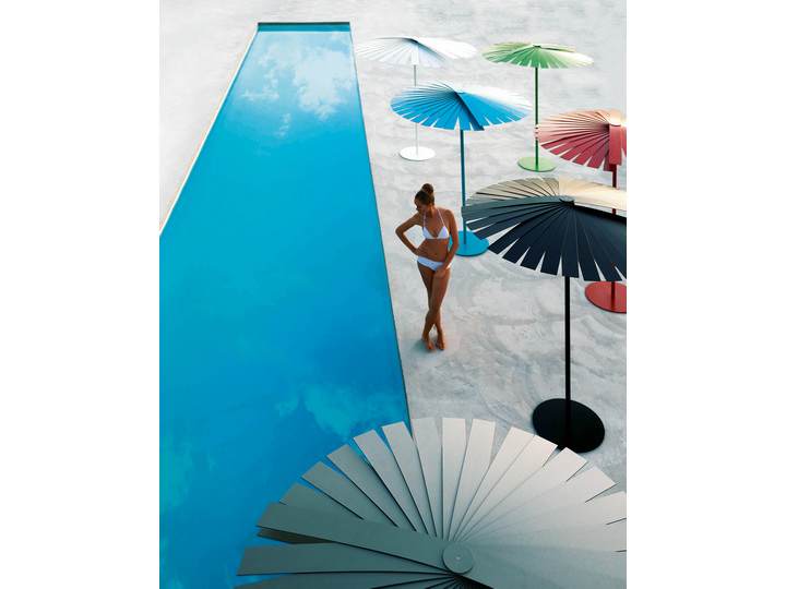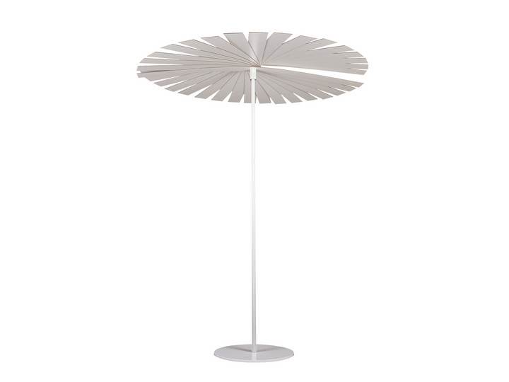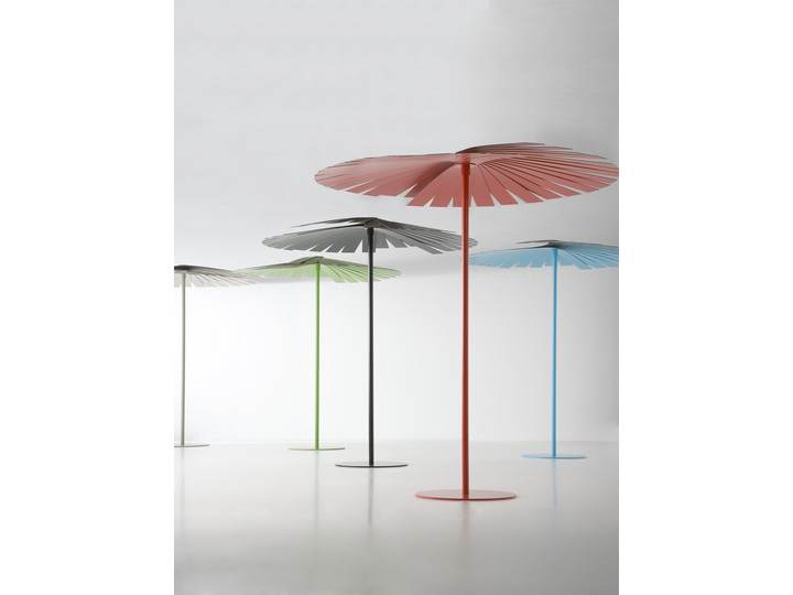 Podstawa wykonana z lakierowanej blachy stalowej, słup - lakierowana stal nierdzewna, natomiast paski tworzące parasol z plastiku