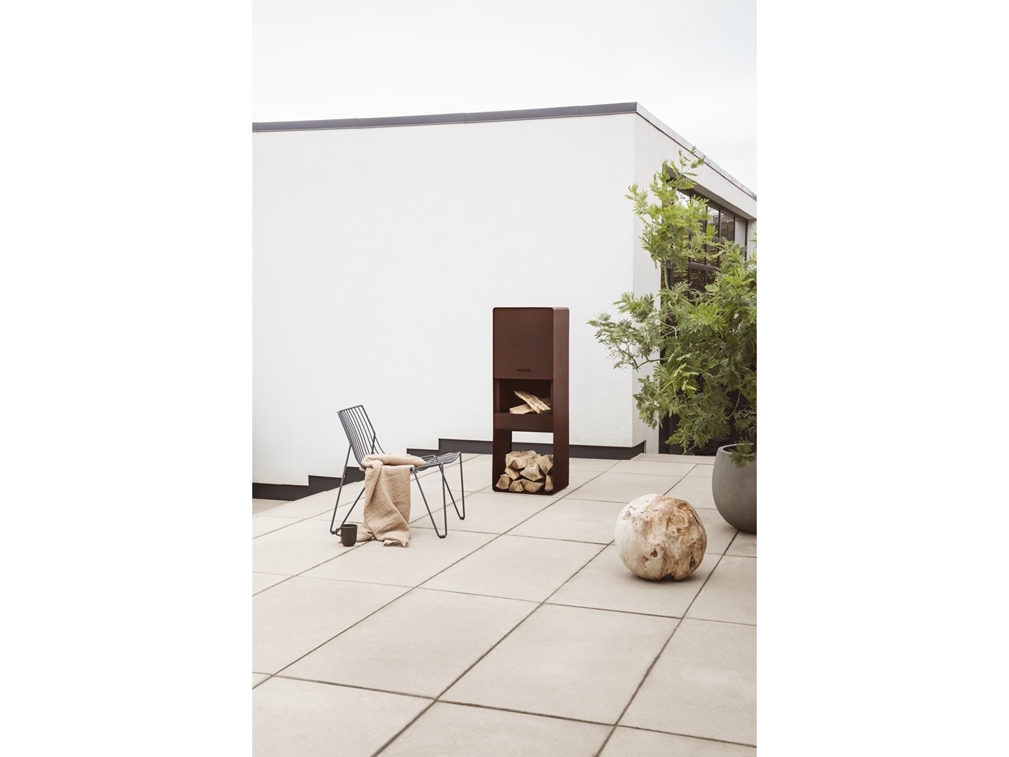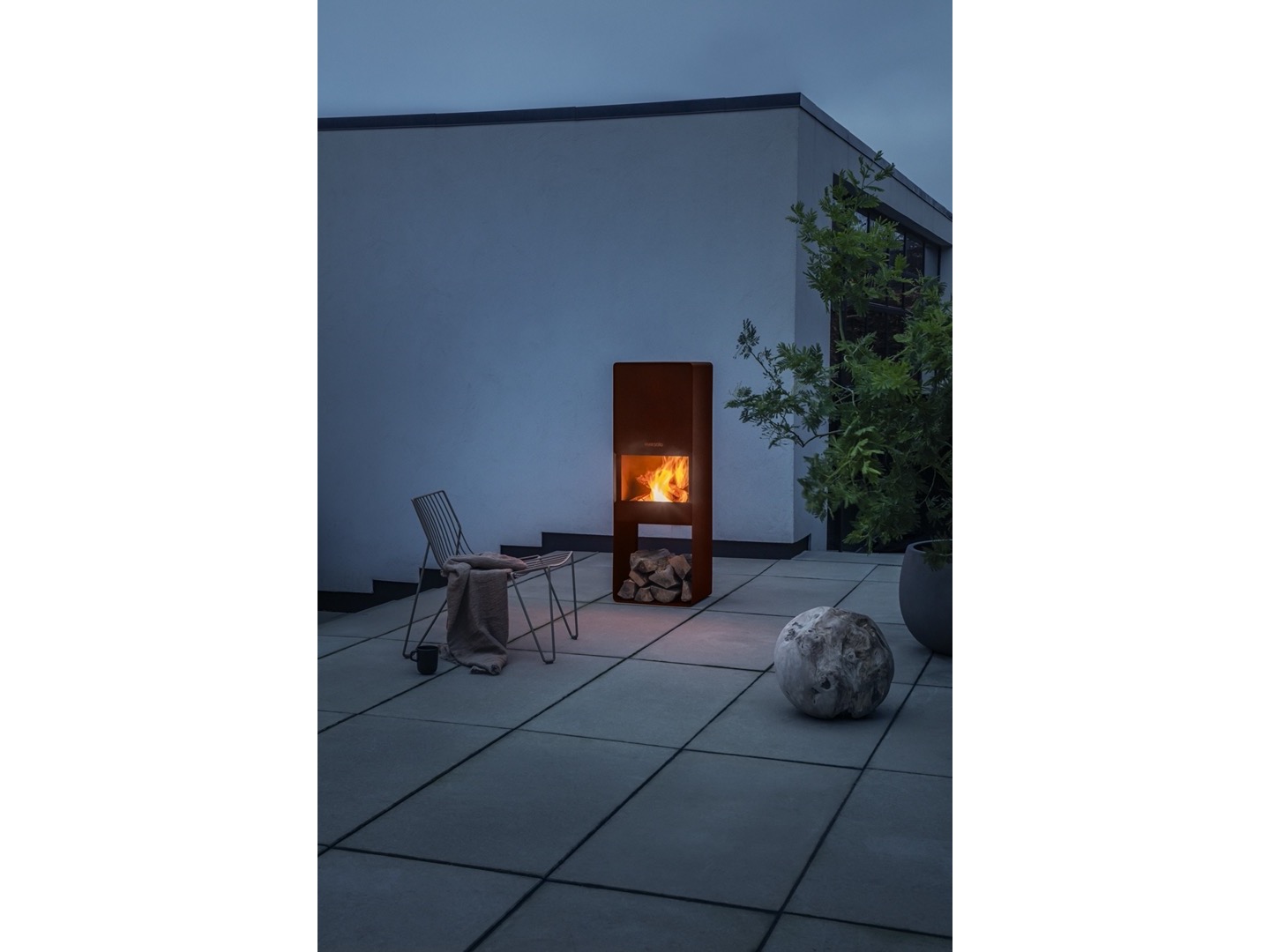 Dzięki prostemu i stylowemu wyglądowi FireBox nie zajmuje dużo miejsca i jest atrakcyjnym elementem do przestrzeni zewnętrznych. Ponadto zawiera miejsce na drewno opałowe, dzięki czemu masz je zawsze pod ręką. Wbudowany komin wyprowadza dym z tyłu FireBox, dzięki czemu nie będzie ci przeszkadzał. Kominek jest odporny na warunki atmosferyczne dlatego można pozostawić go na zewnątrz przez cały rok.
