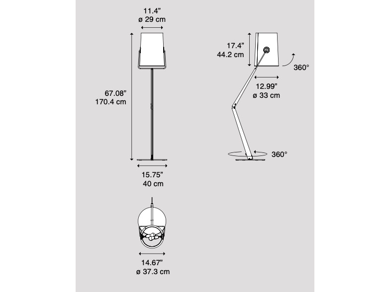 Wymiary: średnica podstawy 40 x średnica klosza 29 x wysokość 170.4 cm