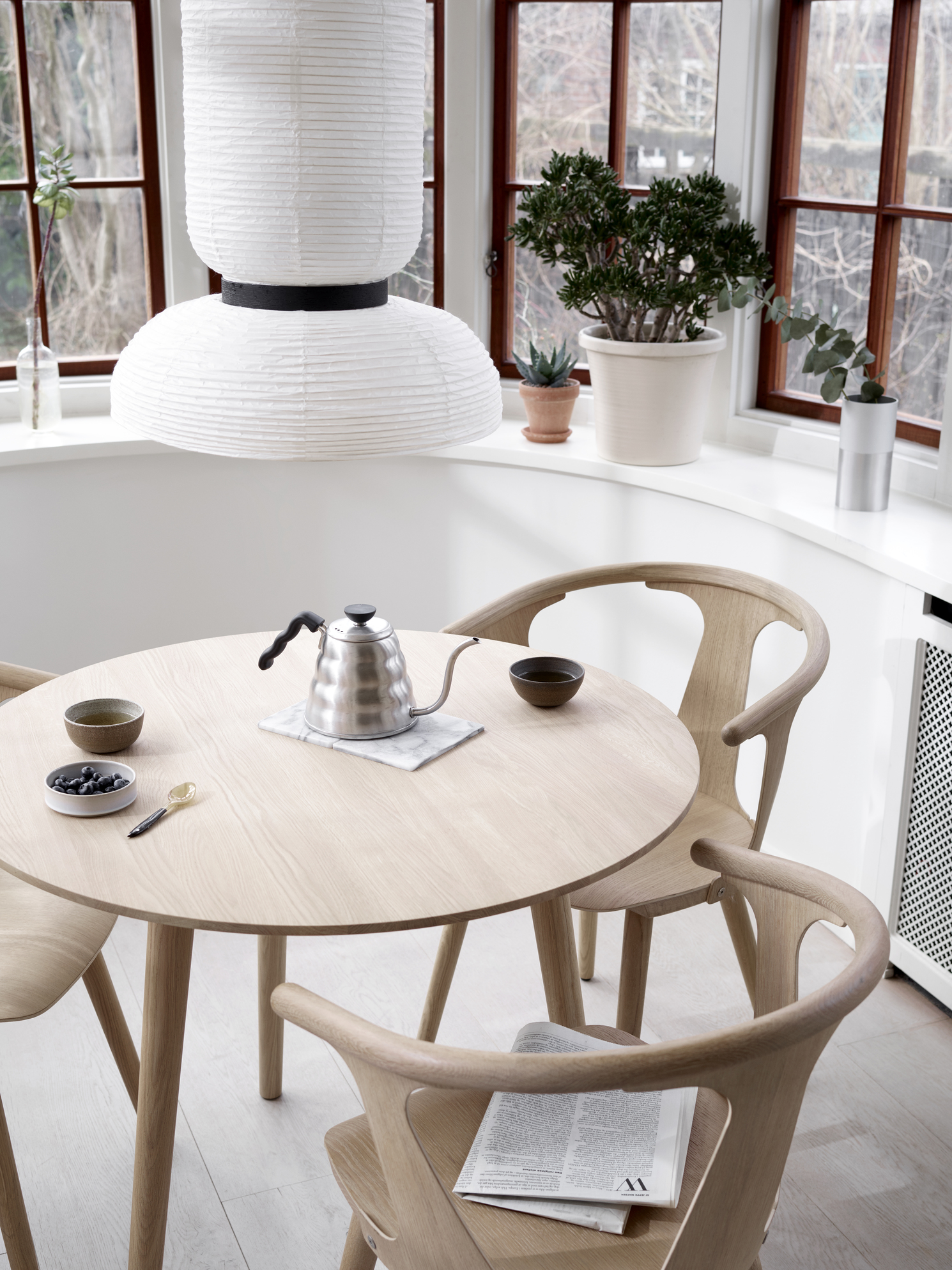 Oda do azjatyckiego designu widziana przez pryzmat skandynawskiego minimalizmu – piękno lamp wiszących Formakami tkwi w delikatności użytych materiałów. Zaprojektowane przez Jaime Hayona i wykonane ręcznie z papieru – zwiewny, bulwiasty kształt podkreślony jest przez stabilną podstawę z czarnego barwionego dębu – efektowna kompozycja wizualna odzwierciedlona w całej serii.