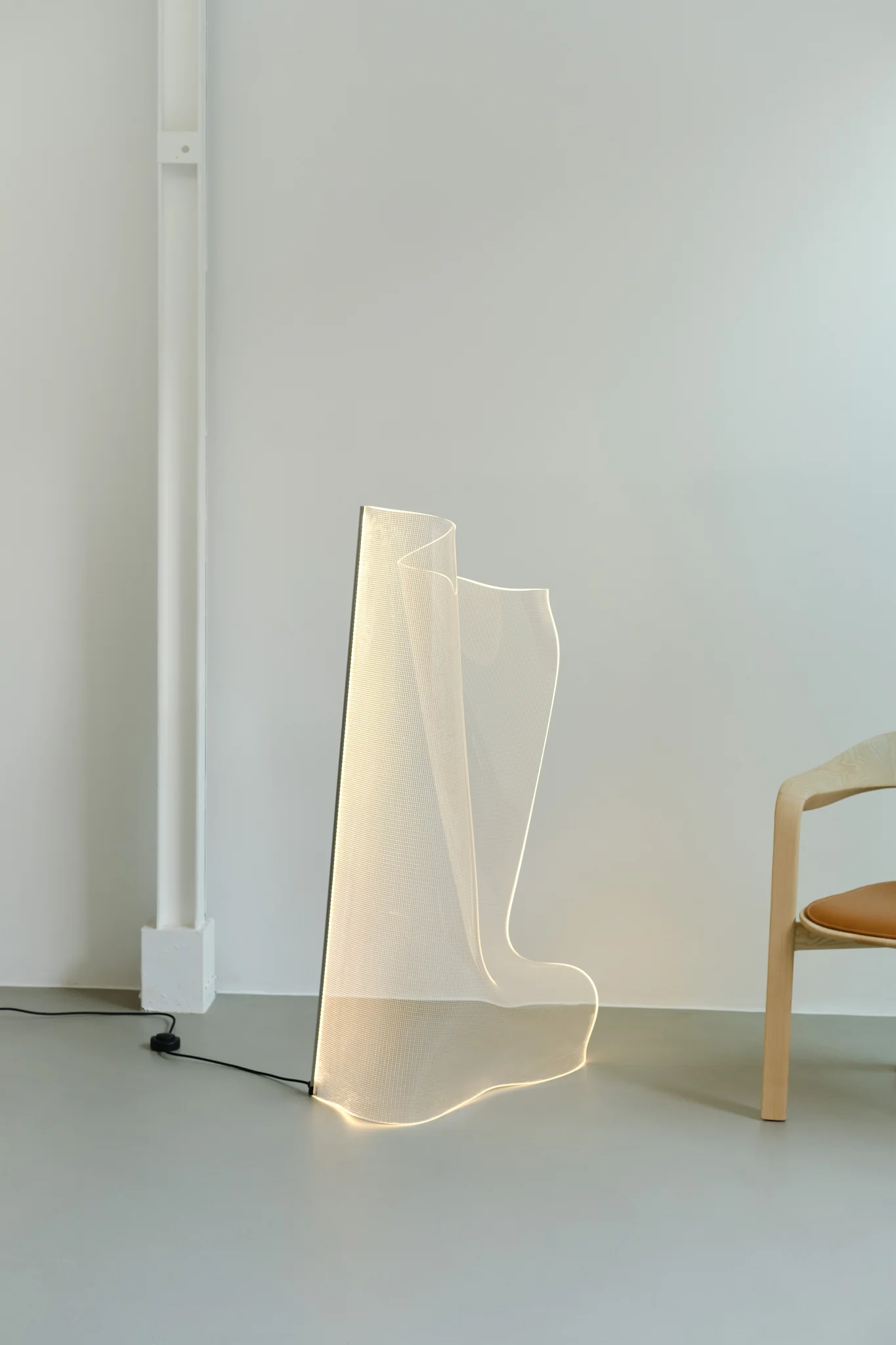 Lampa podłogowa. Ręcznie formowana, przezroczysta konstrukcja z akrylu. Taśma LED osadzona w profilu z wytłaczanego aluminium, anodowanego na kolor złoty lub srebrny.
