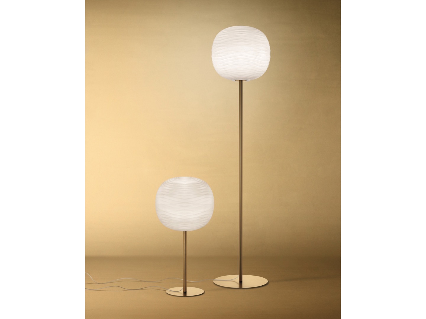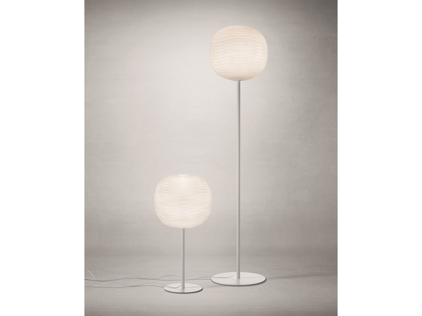 Gem charakteryzuje się graficznym, pofałdowanym wzorem fal na całej powierzchni, dzięki czemu lampa jest niepowtarzalna nawet po wyłączeniu. Lampa podłogowa Gem, będąca częścią Mix & Match firmy Foscarini, jest dostępna w trzech kolorach i można ją łączyć z innymi elementami z kolekcji dla dopełnienia wnętrza.
