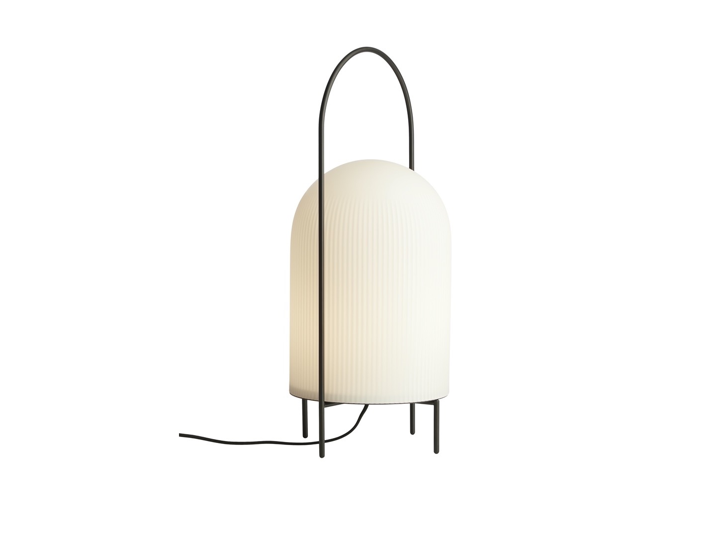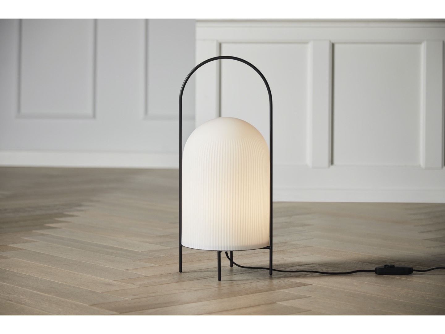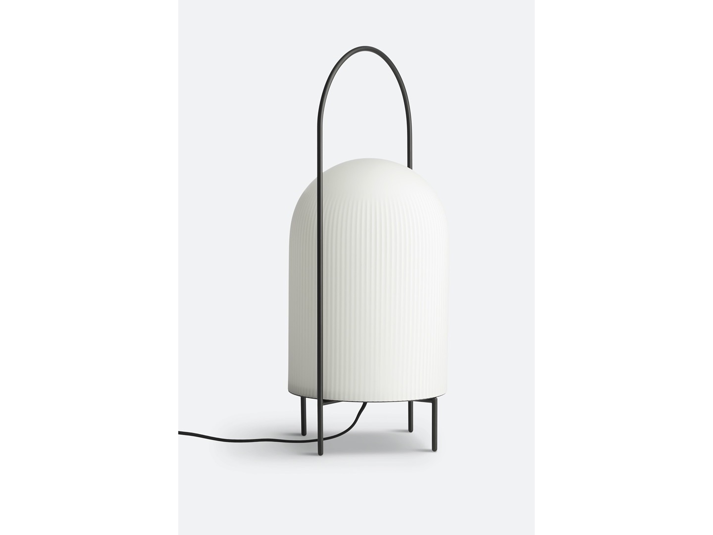 Lampa podłogowa Ghost to nowoczesna interpretacja przenośnych lamp naftowych. Smukły metalowy pręt otacza klosz w sposób ochronny i pełni funkcję uchwytu do przenoszenia lampy. Wykonany z prześwitującego, opalowego szkła, klosz daje złudzenie białej tkaniny narzuconej na źródło światła. Przypomina wyglądem przyjaznego ducha. Subtelny wzór pionowych rowków na powierzchni stopniowo zanika ku górze, podkreślając wyrafinowany rzeźbiarski charakter lampy. Przewód jest wyposażony w ściemnialny przełącznik.