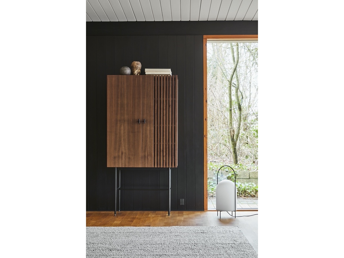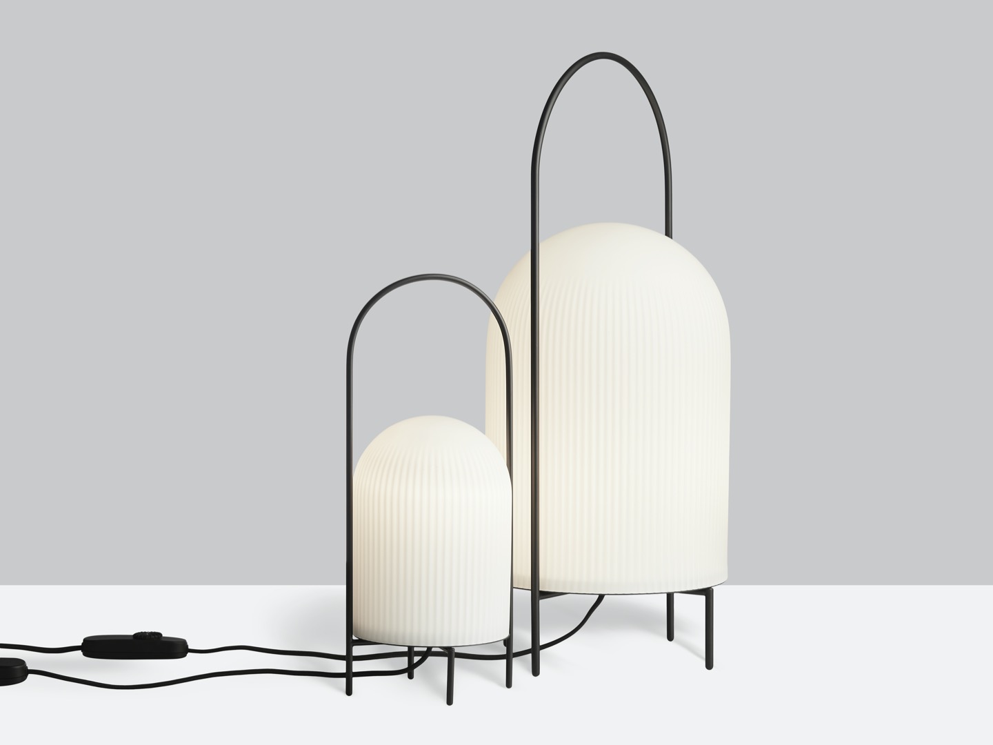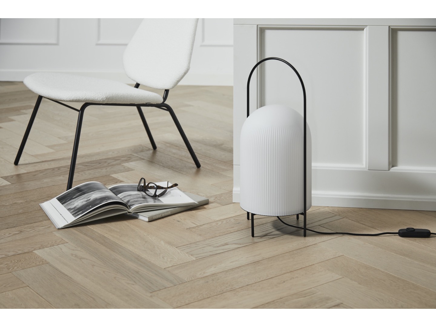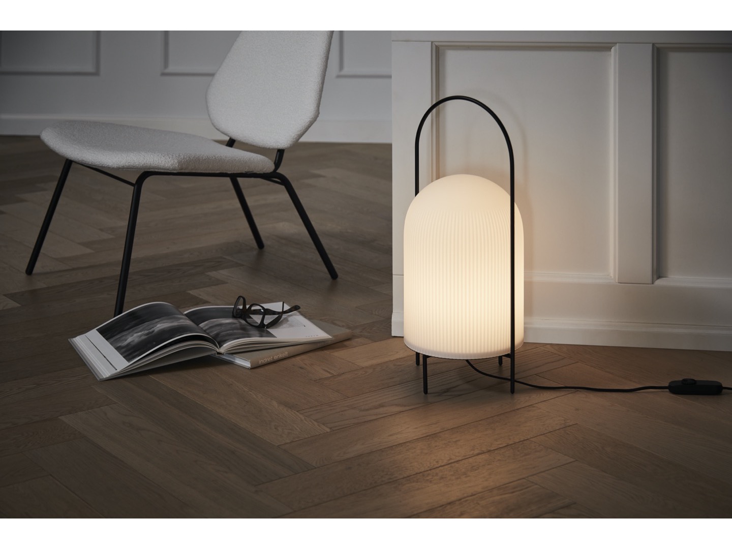 Lampa podłogowa Ghost to nowoczesna interpretacja przenośnych lamp naftowych. Smukły metalowy pręt otacza klosz w sposób ochronny i pełni funkcję uchwytu do przenoszenia lampy. Wykonany z prześwitującego, opalowego szkła, klosz daje złudzenie białej tkaniny narzuconej na źródło światła. Przypomina wyglądem przyjaznego ducha. Subtelny wzór pionowych rowków na powierzchni stopniowo zanika ku górze, podkreślając wyrafinowany rzeźbiarski charakter lampy. Przewód jest wyposażony w ściemnialny przełącznik.