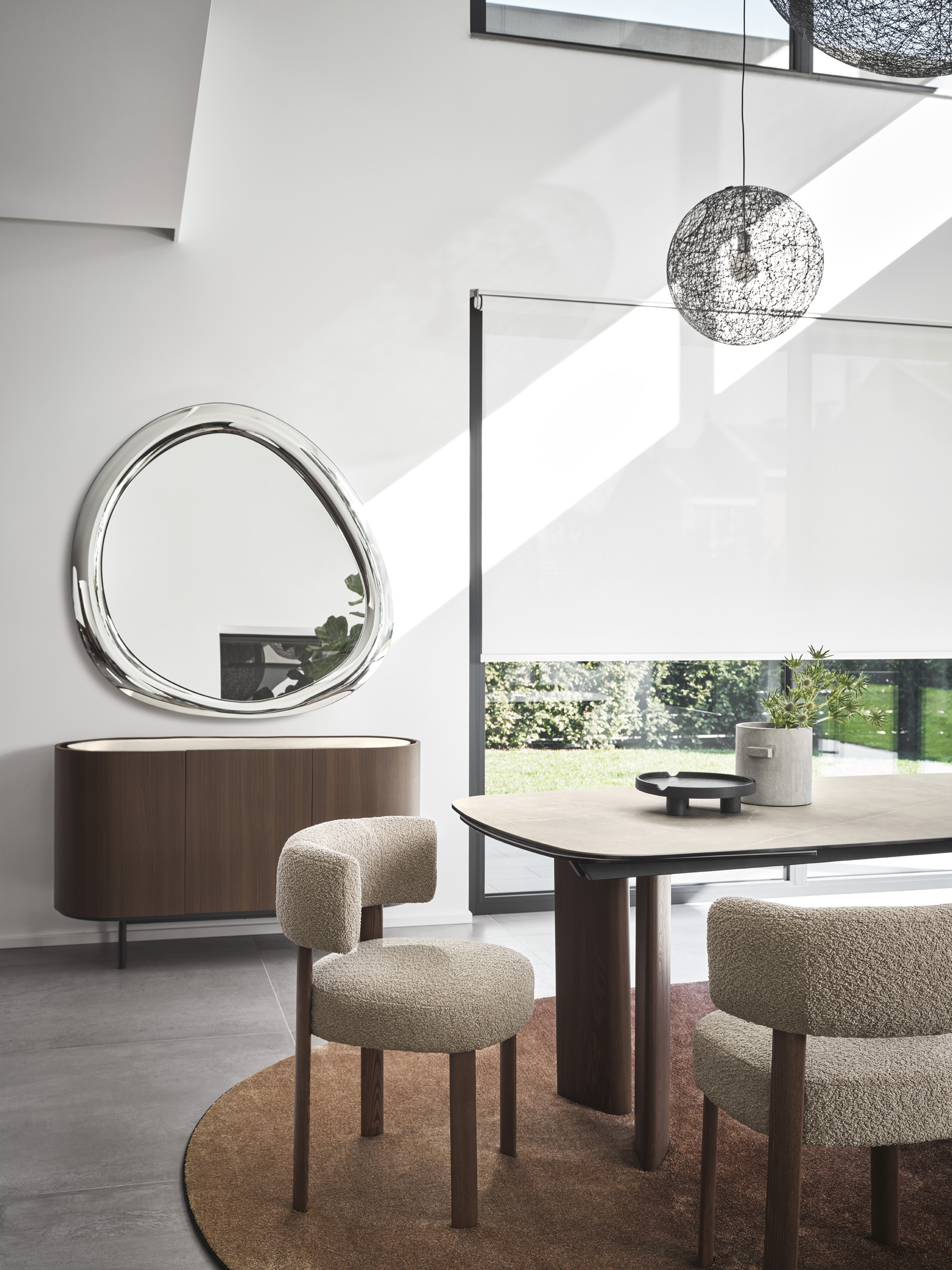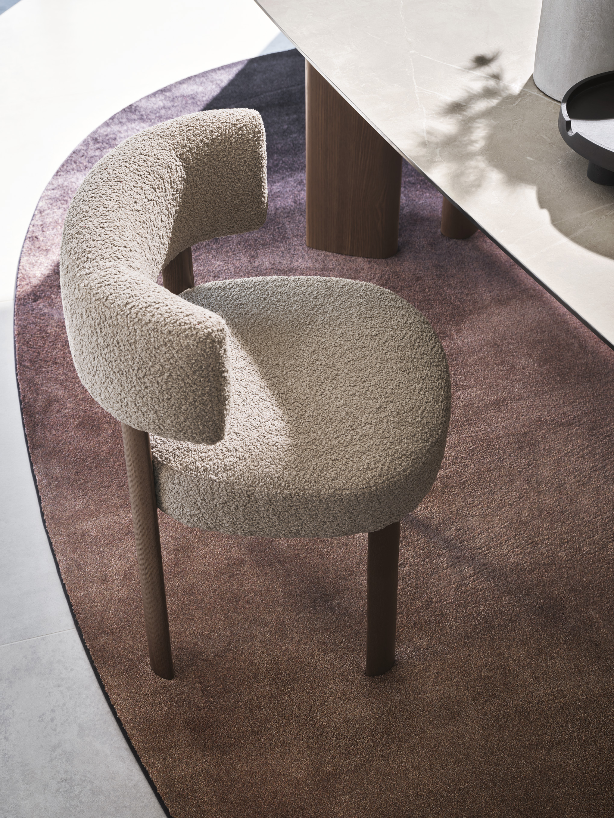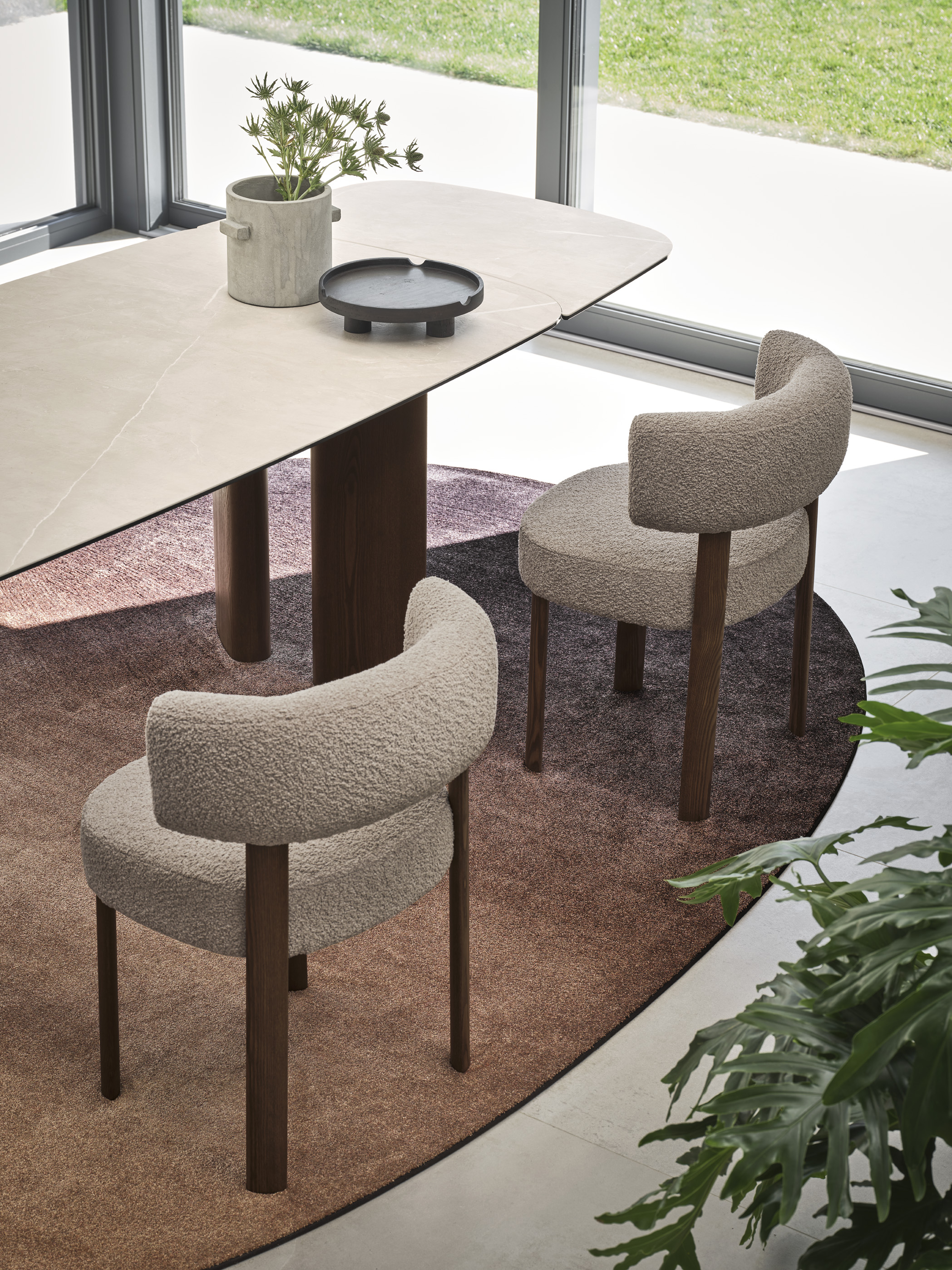 Krzesło Glen charakteryzuje się minimalistycznym designem. Jego linie i bryła nadają mu silną osobowość i tworzą wizualną równowagę między solidnością a lekkością. Z czystego geometrycznego kształtu wyłania się siedzisko i zakrzywione oparcie, które stanowią charakterystyczny element projektu. Otulająca forma nadaje krzesłu harmonijną estetykę i zapewnia ergonomiczne wsparcie, dostosowując się do naturalnej pozycji ciała.